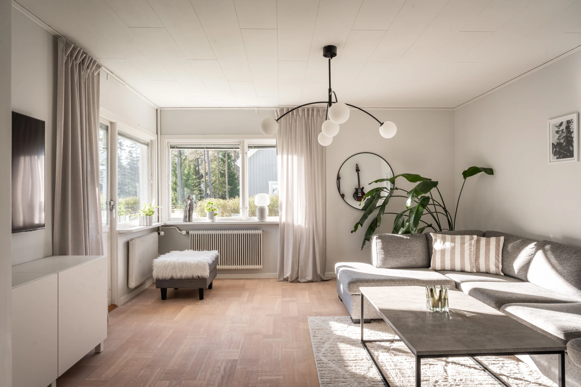 Rymligt och inbjudande vardagsrum med ljusa väggar och fint parkettgolv som ger rummet en modern känsla. Här flödar ljuset in tack vare generösa fönster som skapar en trivsam atmosfär. Härifrån nås även en mindre altan – perfekt för att ta med kaffekoppen ut under sommarhalvåret.