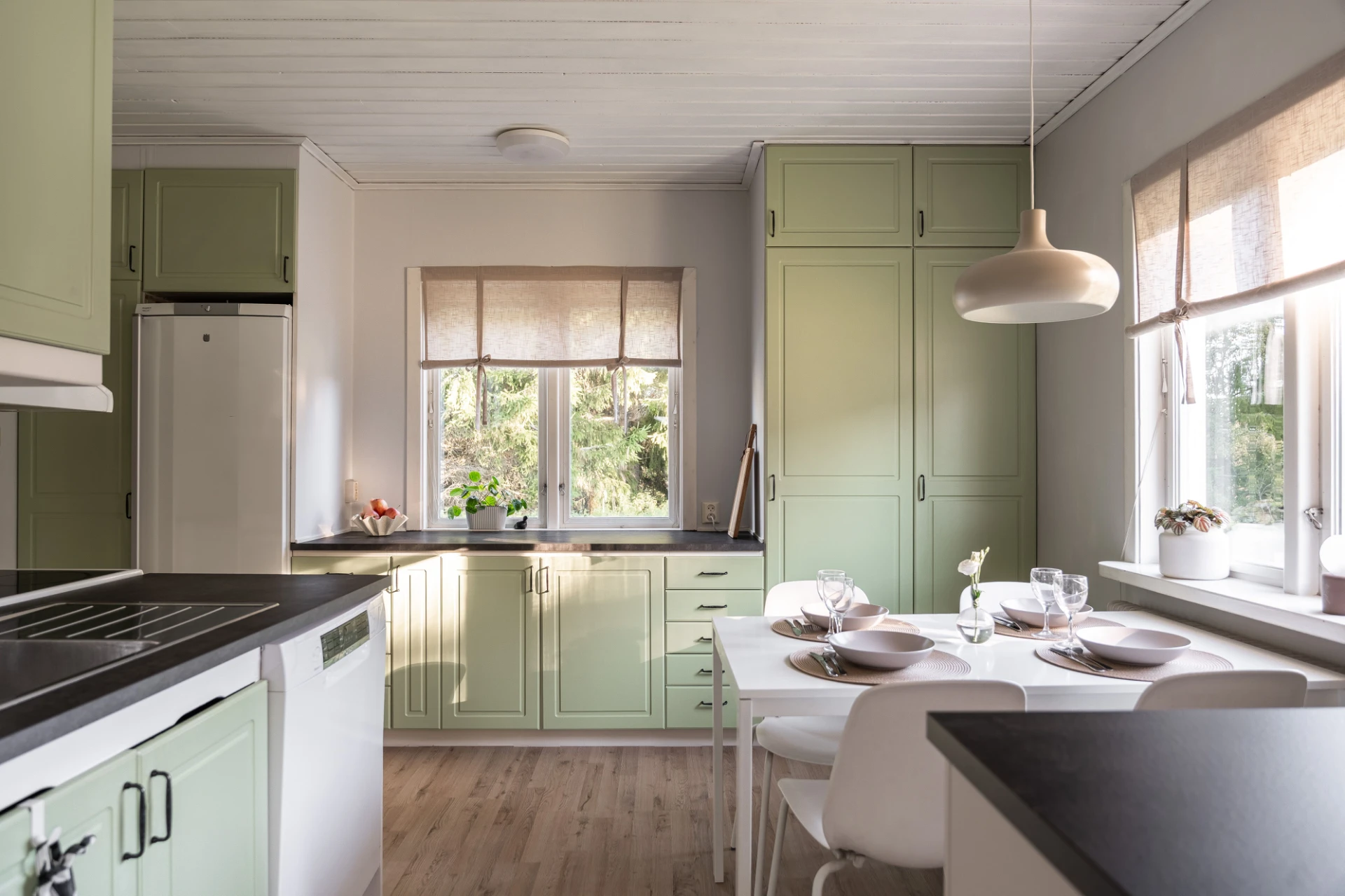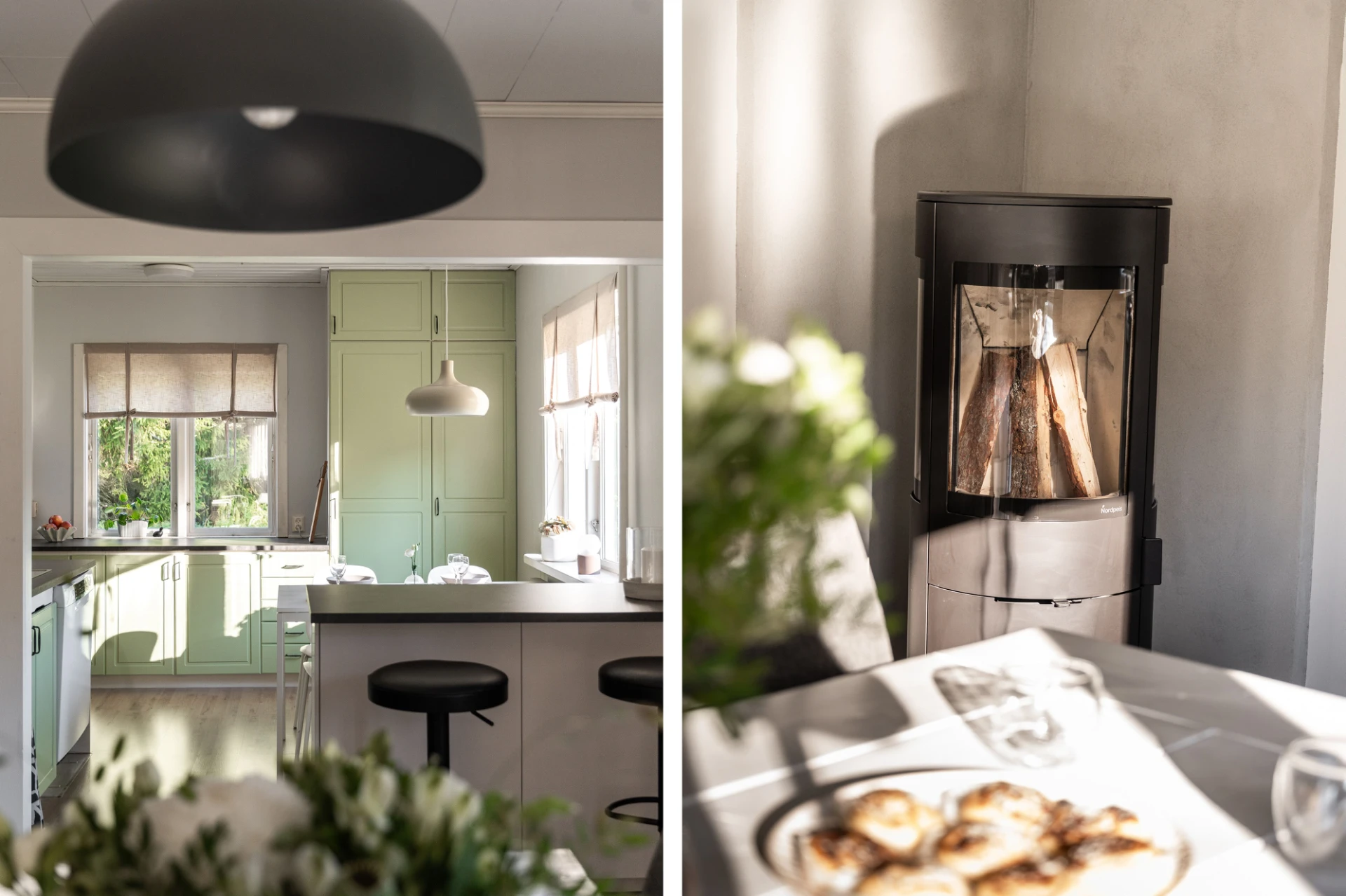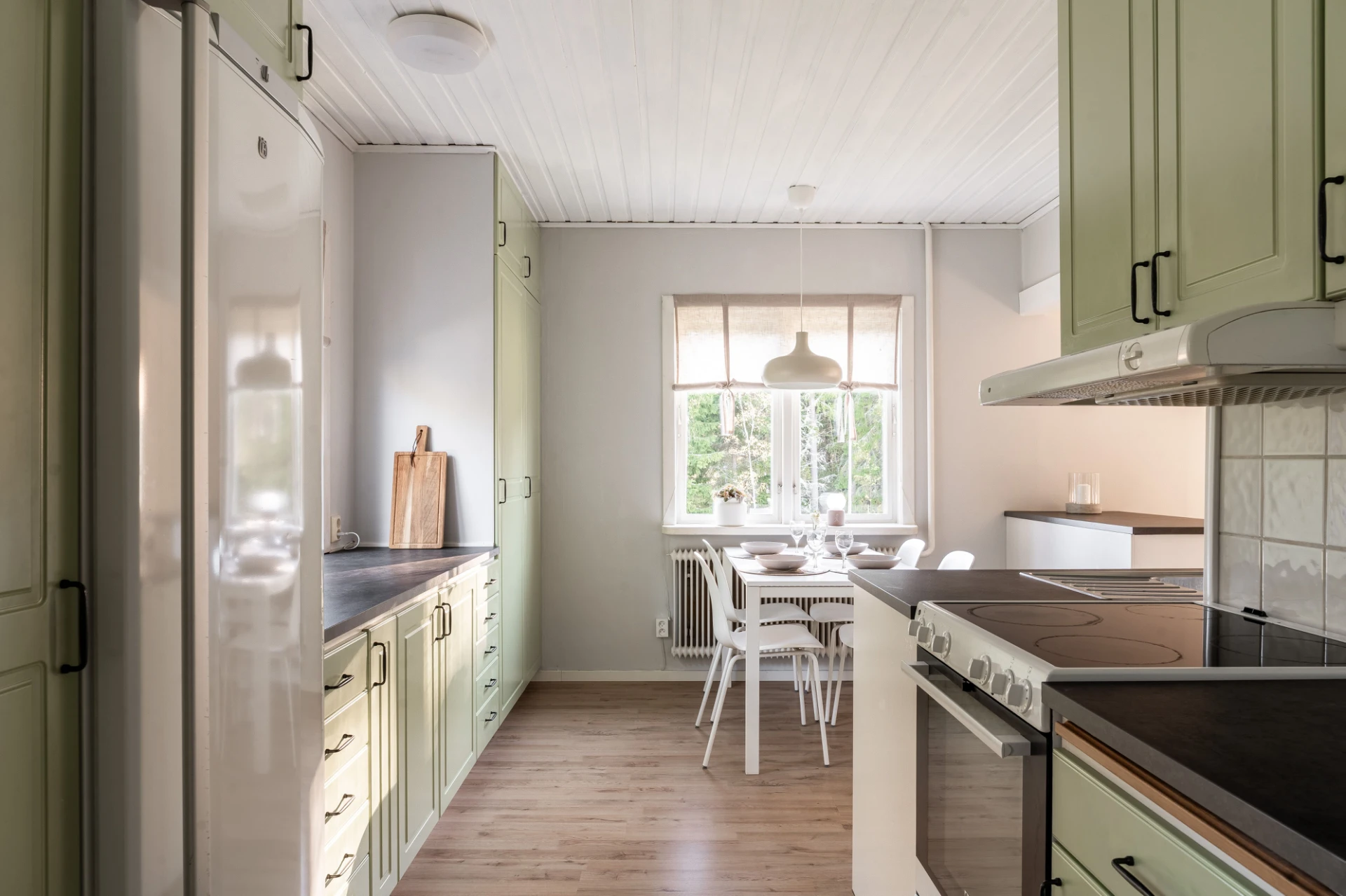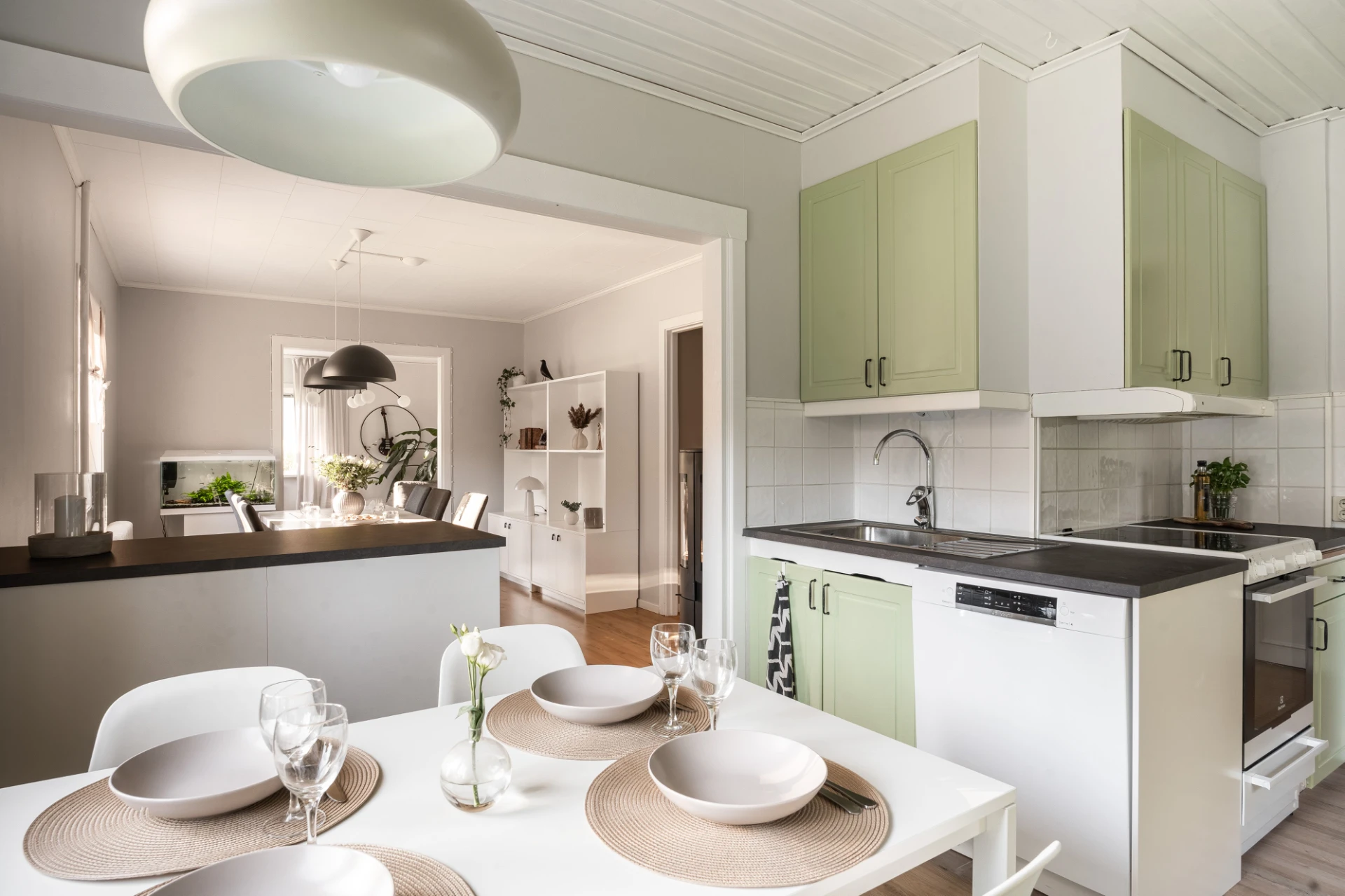 Smakfullt och fullutrustat kök med köksluckor i grön ton som harmonierar fint med laminatbänkskiva i grått. Väggarna är ljusa och vid köksdelen sitter ett klassiskt vitt kakel som både är tidlöst och lättskött. En halv köksö som ger extra arbetsyta och förvaring, i köket finns även plats för matbord. Den öppna planlösningen mot matsalen gör dessutom att rummen flyter ihop och skapar en ljus och inbjudande yta för både vardag och umgänge.
