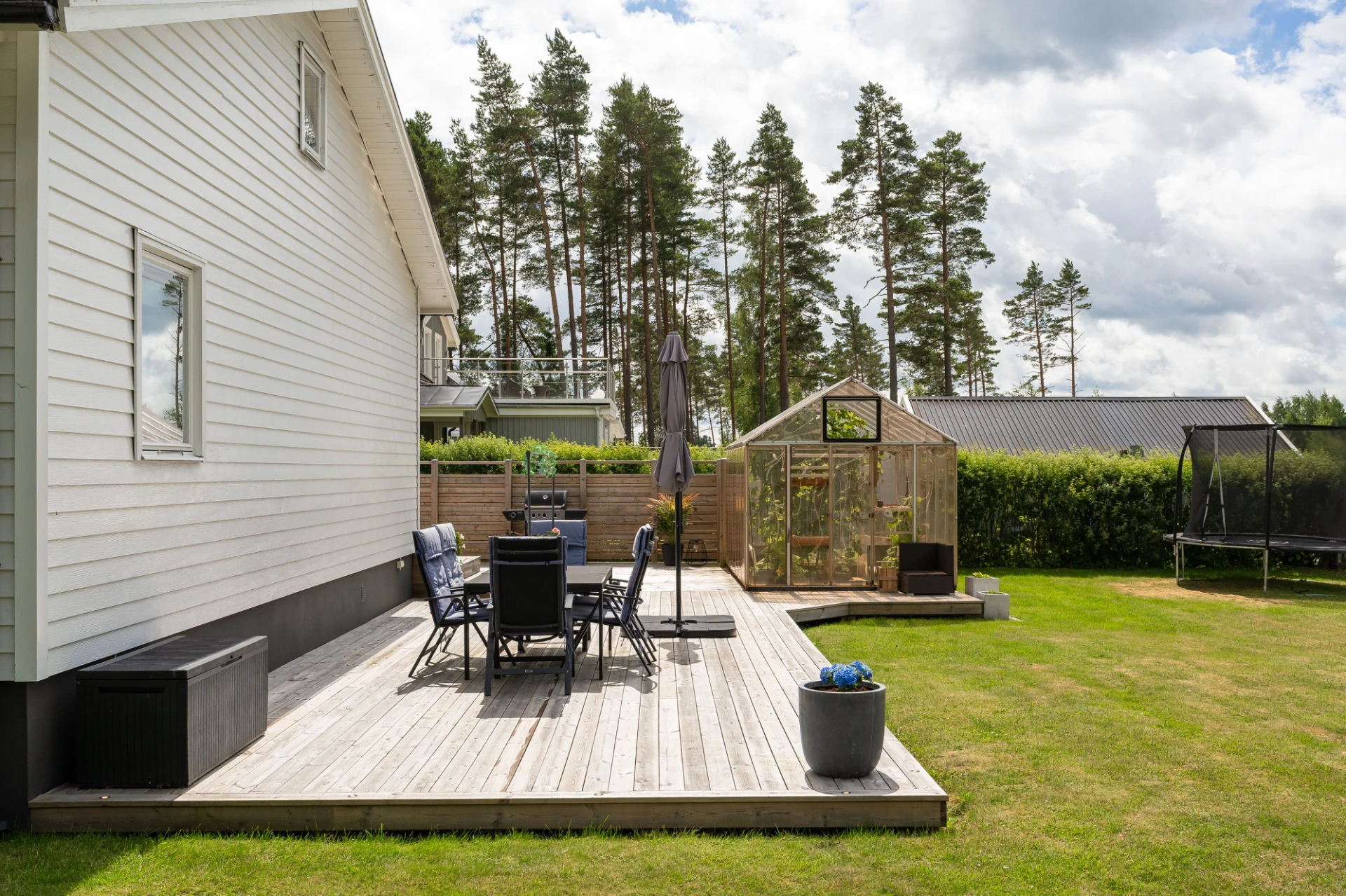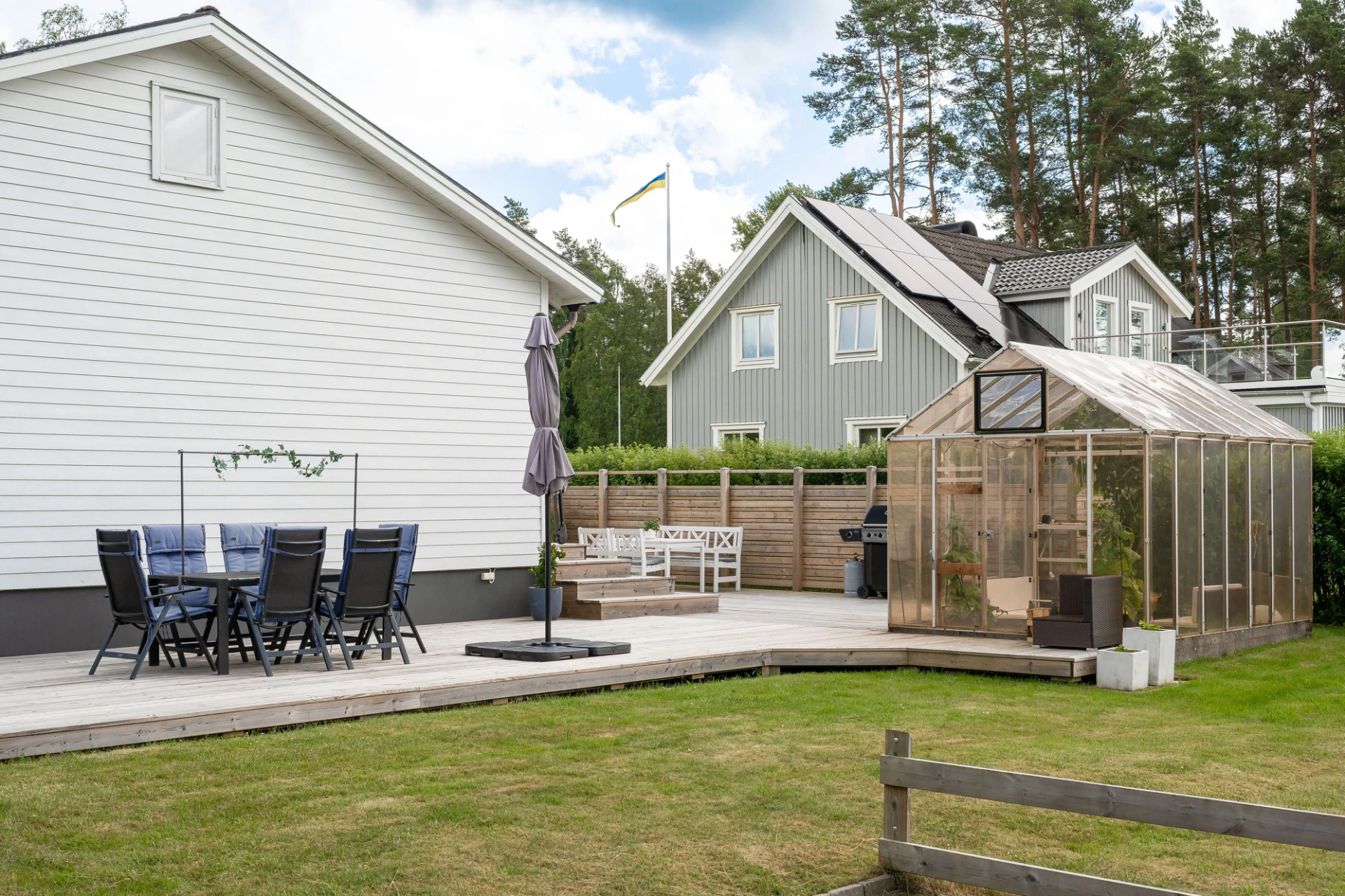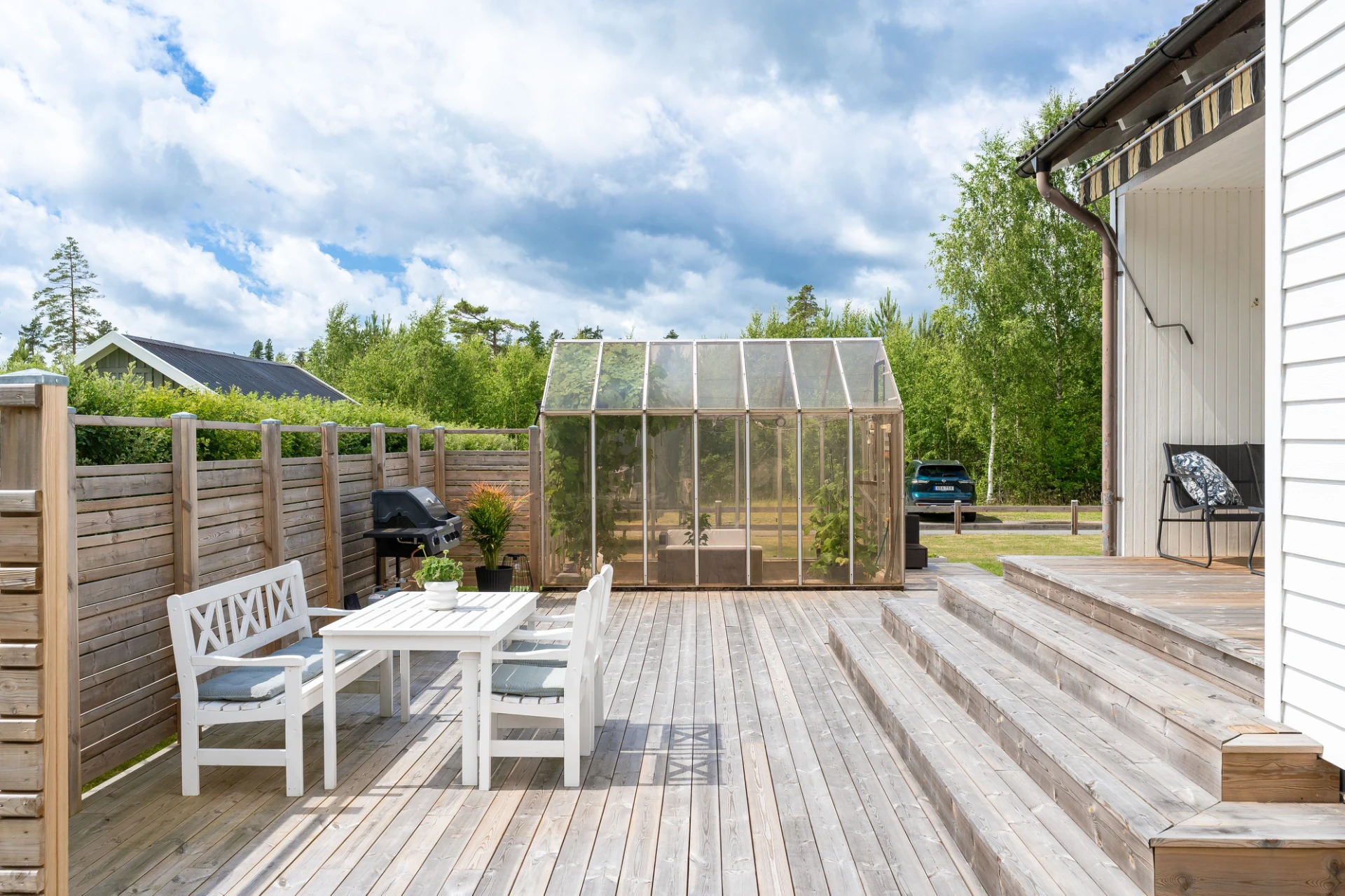Stort nybyggt trädäck om cirka 100 kvm med gott om plats för utemöbler, grill och umgänge. Sydvästläge ger sol större delen av dagen och sent in på kvällen och den begränsade insynen skapar en privat och trivsam miljö. I anslutning till altanen finns ett växthus samt en plan och välskött trädgård, vilket gör det enkelt att njuta av utomhuslivet och odla både blommor och grönsaker.