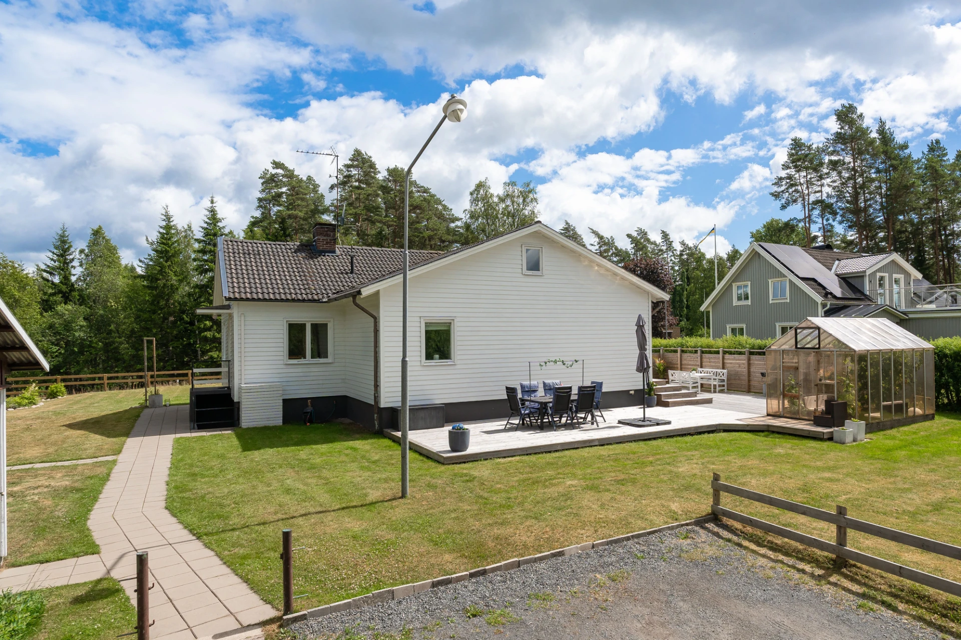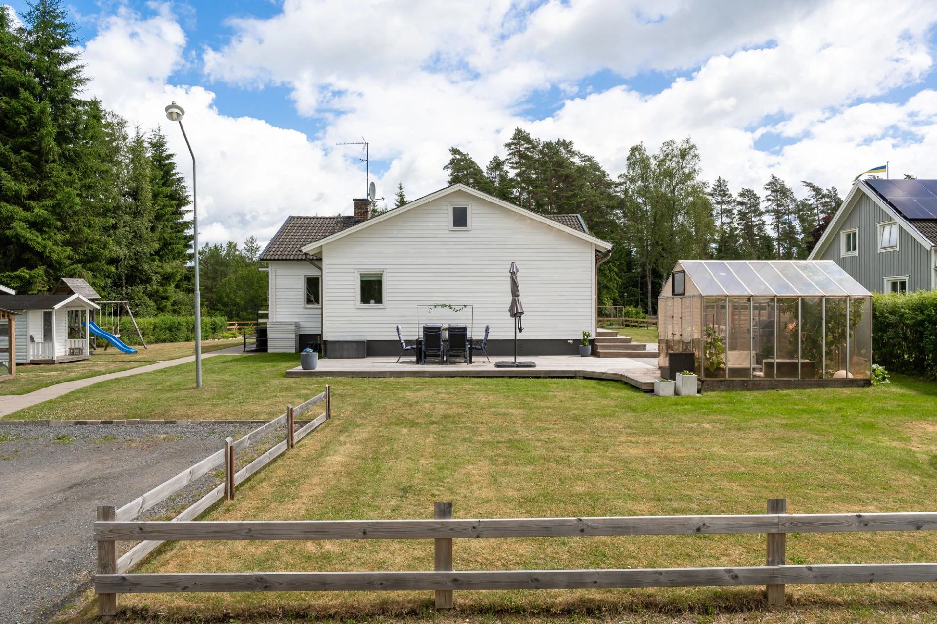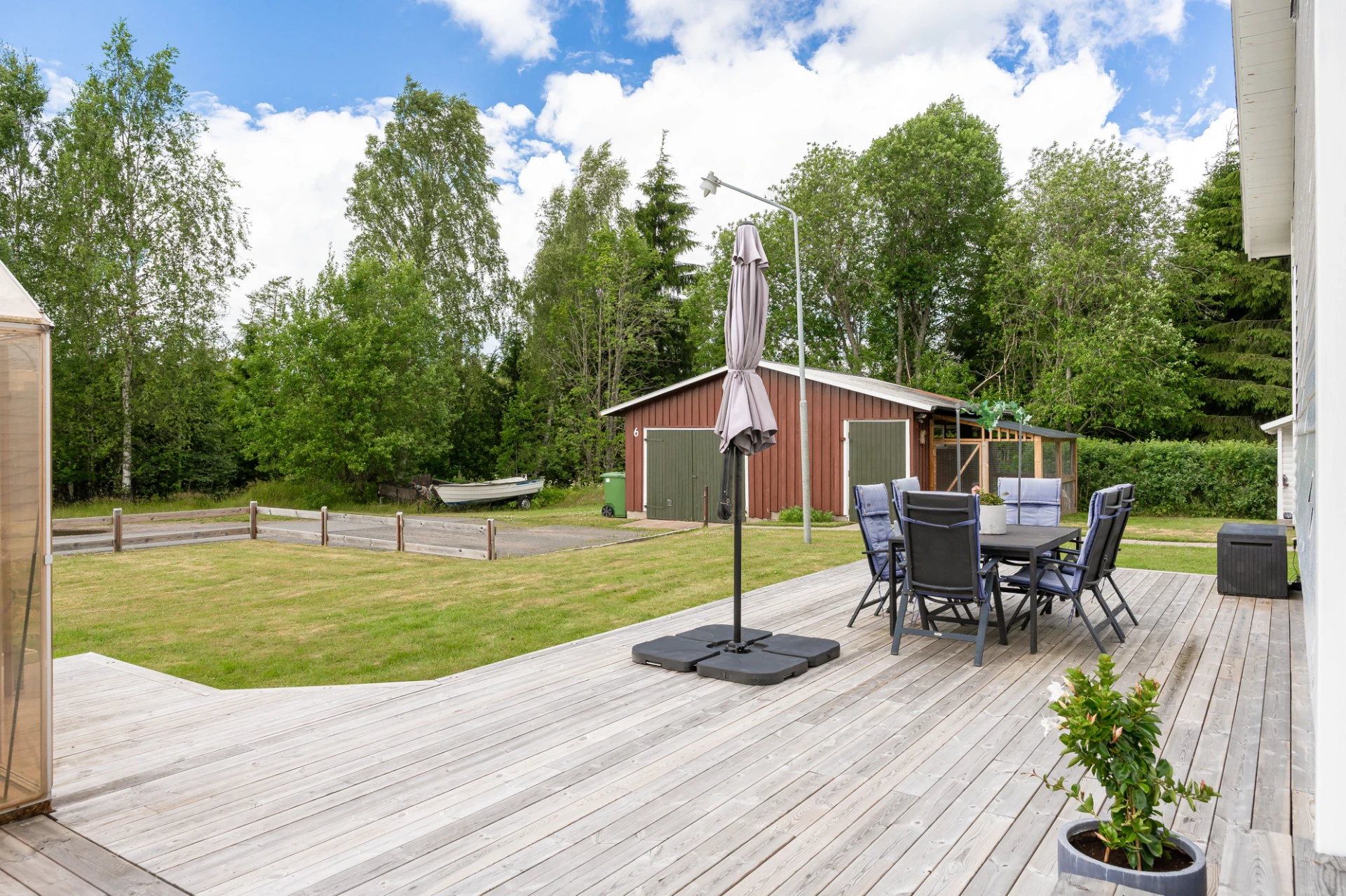 Stort nybyggt trädäck om cirka 100 kvm med gott om plats för utemöbler, grill och umgänge. Sydvästläge ger sol större delen av dagen och sent in på kvällen och den begränsade insynen skapar en privat och trivsam miljö. I anslutning till altanen finns ett växthus samt en plan och välskött trädgård, vilket gör det enkelt att njuta av utomhuslivet och odla både blommor och grönsaker.