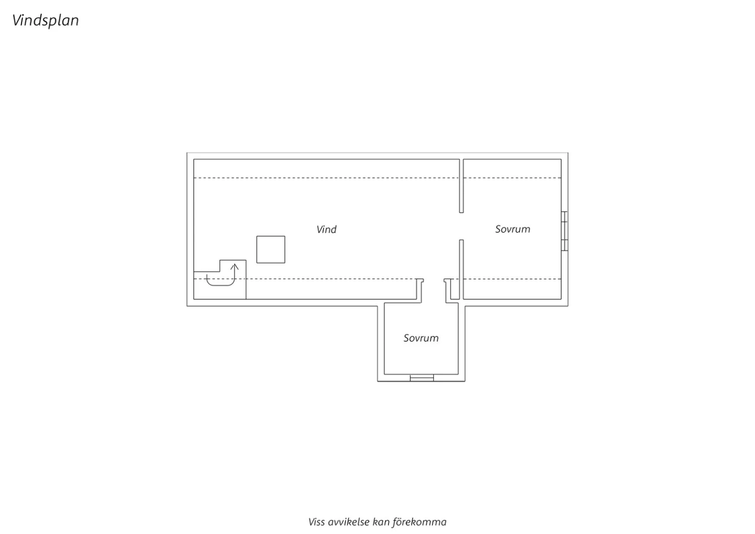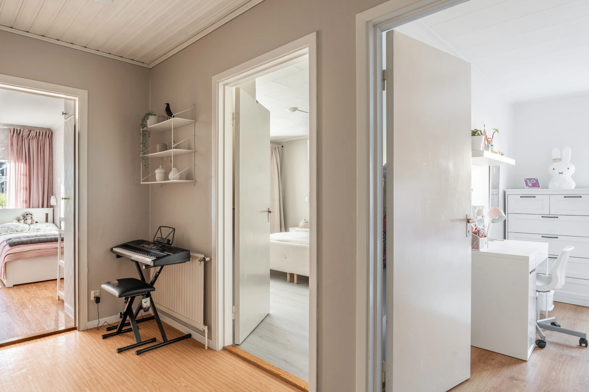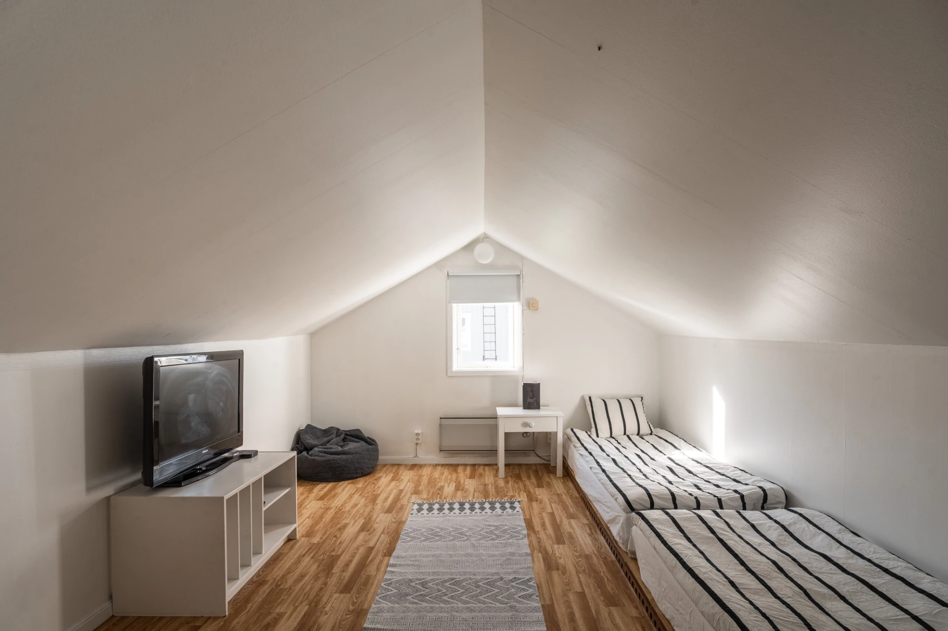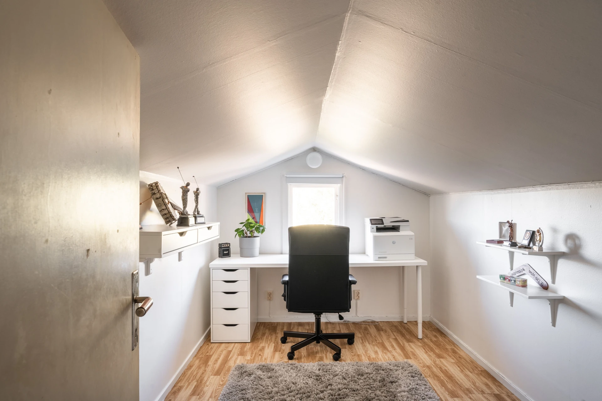 Inredd vindsvåning med flera användningsområden. Första utrymmet passar utmärkt som förvaring eller lekhörna. Därutöver finns två separata rum, ett sovrum och ett kontor, som ger flexibilitet beroende på behov. Taket är något lägre, vilket är typiskt för en vindsvåning, men rummen är fullt användbara och ger extra yta för både familj och gäster.