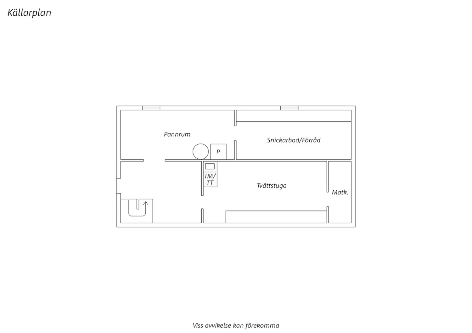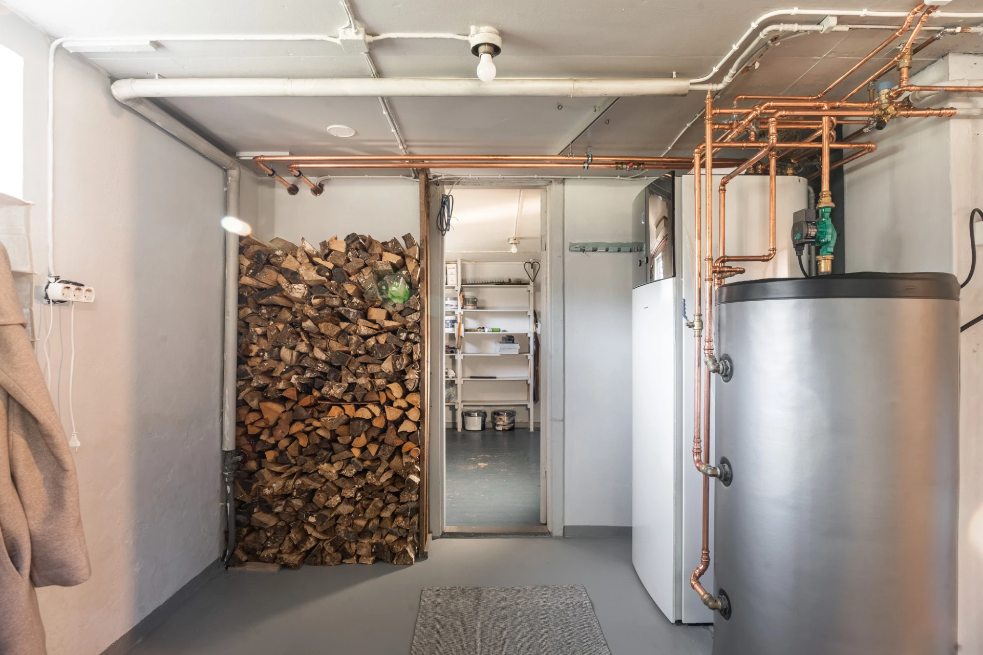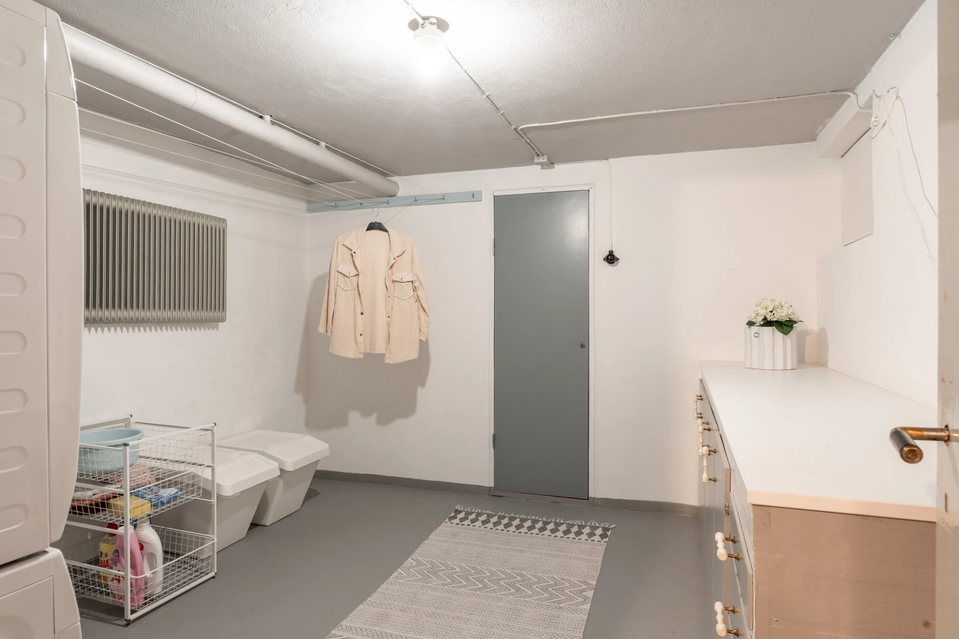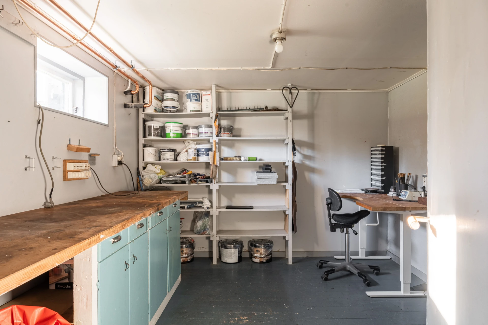 Rymlig och funktionell källare med målade betonggolv och väggar, vilket ger ett fräscht och trivsamt intryck. Källaren rymmer flera praktiska utrymmen, inklusive pannrum, snickarbod/förråd, tvättstuga samt matkällare, vilket ger goda förvaringsmöjligheter och plats för både arbete och vardagliga sysslor.