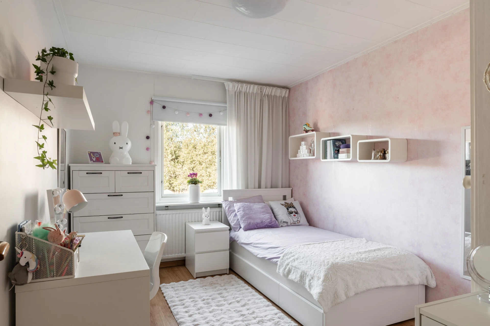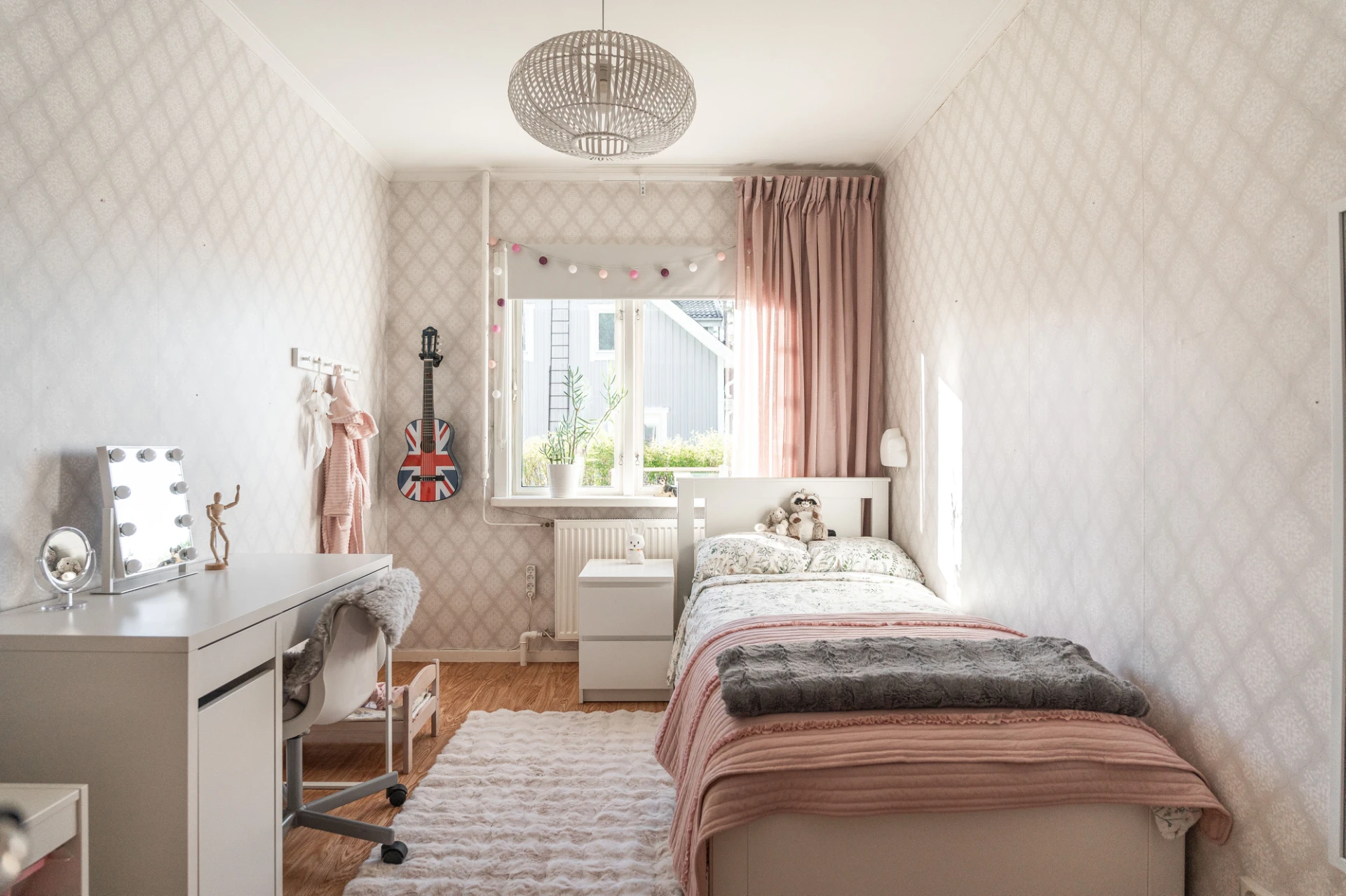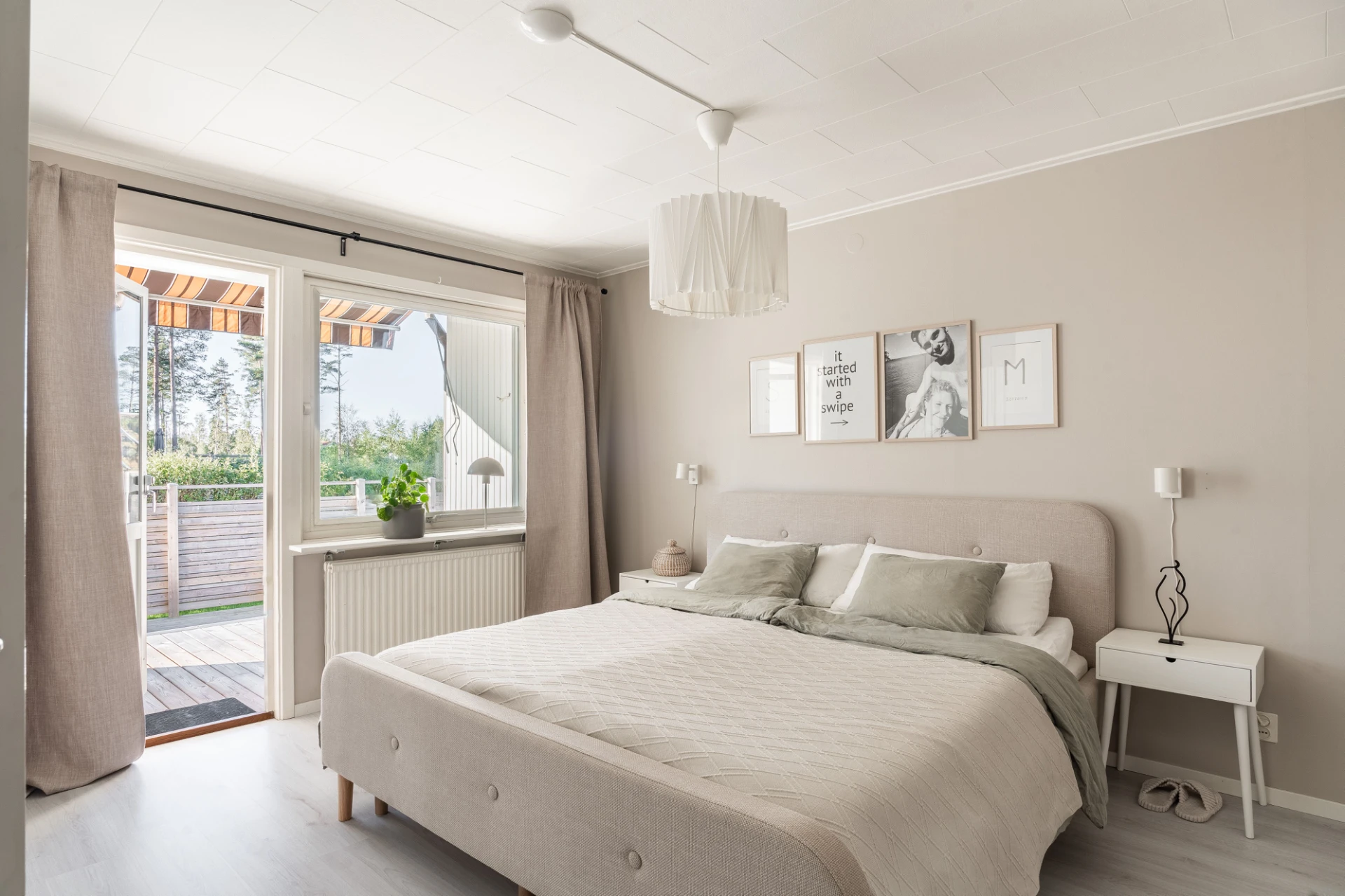 På entréplan finns tre sovrum, där två av dem har bra storlek och erbjuder gott om plats för säng och möbler. Ett större master bedroom som ger utrymme för dubbelsäng. Samtliga sovrum har ljusa ytskikt och fönster som släpper in naturligt ljus samt garderober som underlättar förvaring.