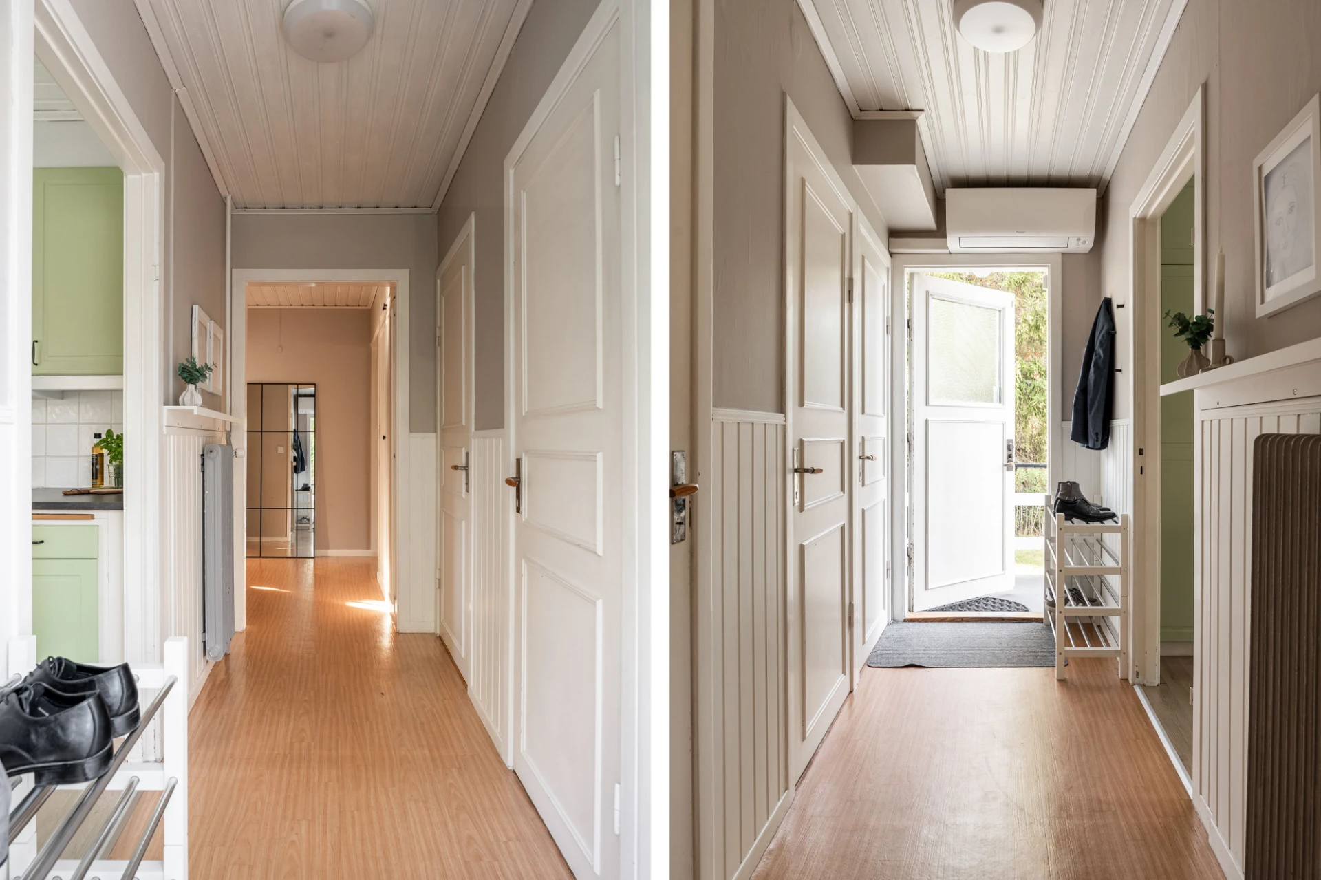 Välkomnande hall med gott om plats för avhängning direkt till vänster. Väggarna är ljust målade med en charmig bröstpanel i ljus ton nedtill och en mjukt grå färgsättning ovanför. På golvet ligger en praktisk plastmatta som är både lättskött och slitstark.