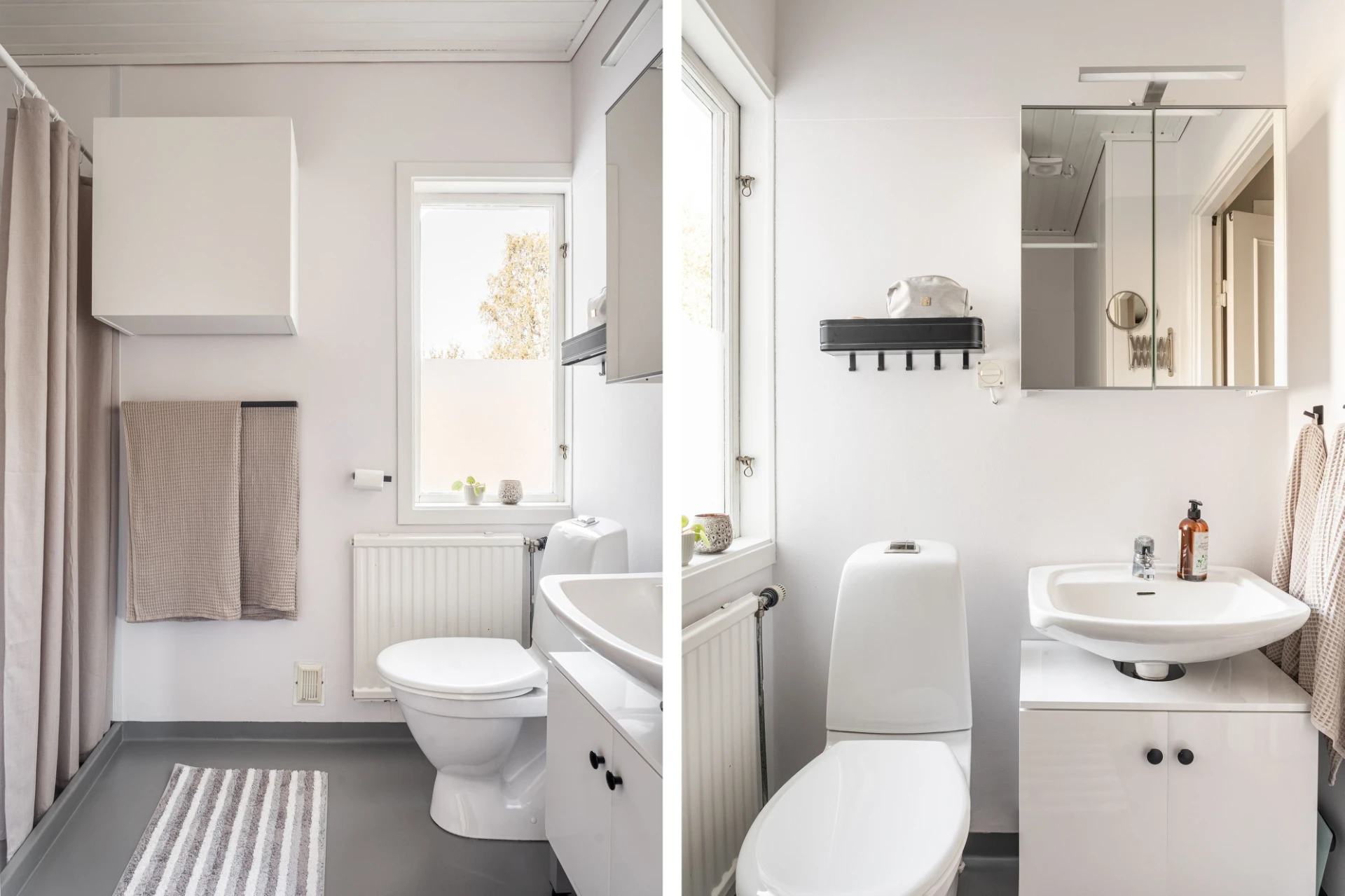 Fräscht och funktionellt badrum utrustat med dusch, wc, handfat med kommod samt spegelskåp med förvaring. Golvet är nyligen behandlat i en modern grå ton som snyggt kontrasterar mot de ljusa väggarna och ger rummet en stilren helhet.