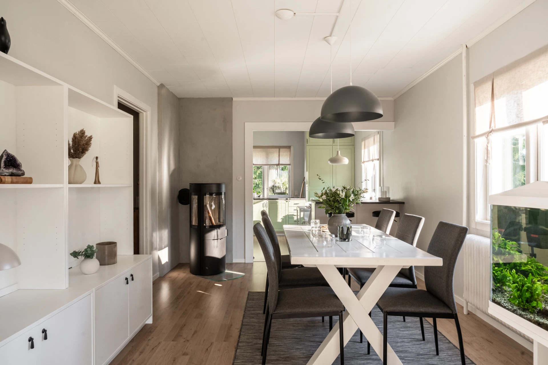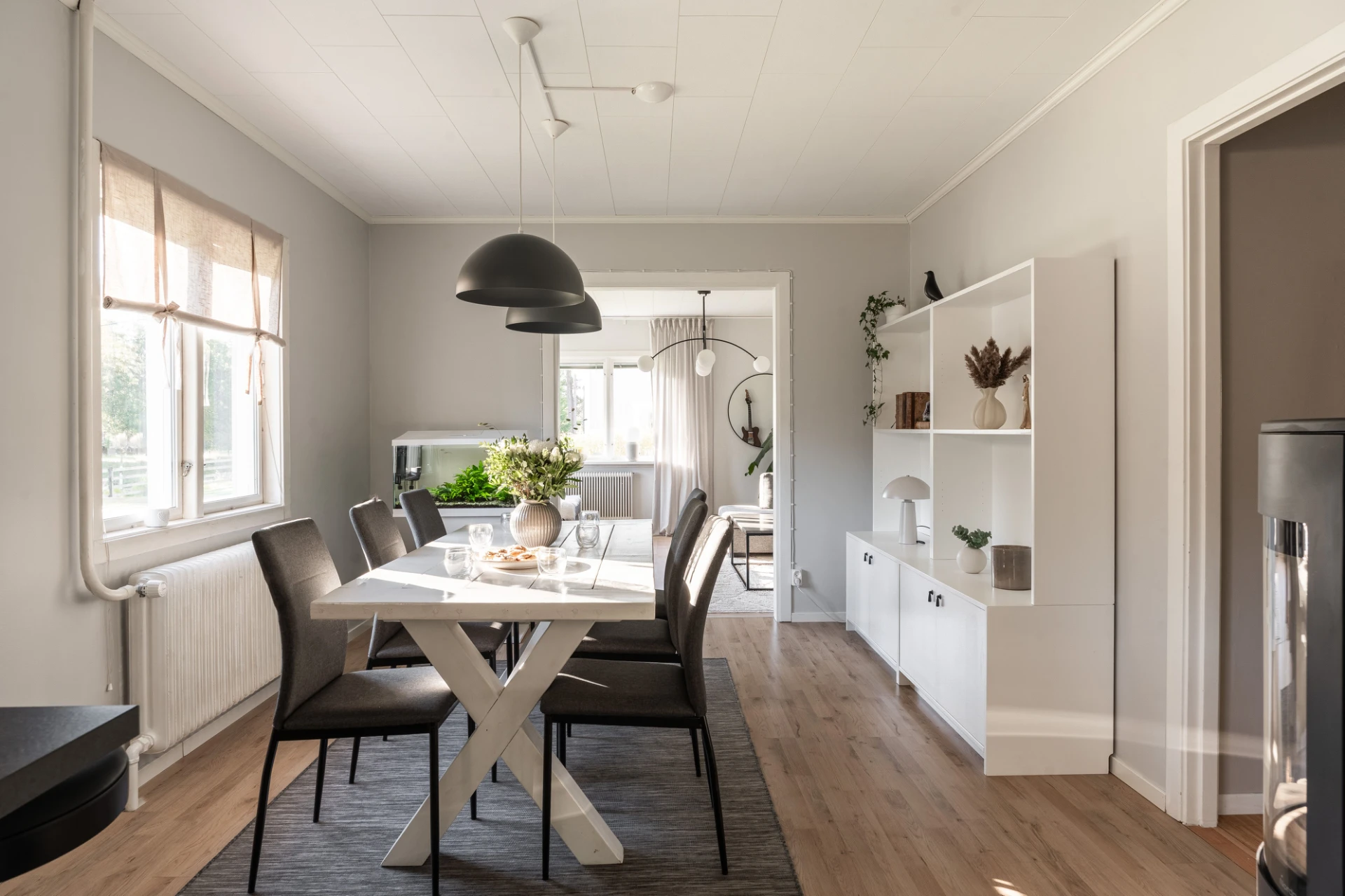 Intill köket finns matsalen med plats för större matbord. Här finns även en nyinstallerad braskamin. Gott om ljusinsläpp från fönster i båda matsalen och köket. Stilrent laminatgolv tillsammans med ljusa väggar.