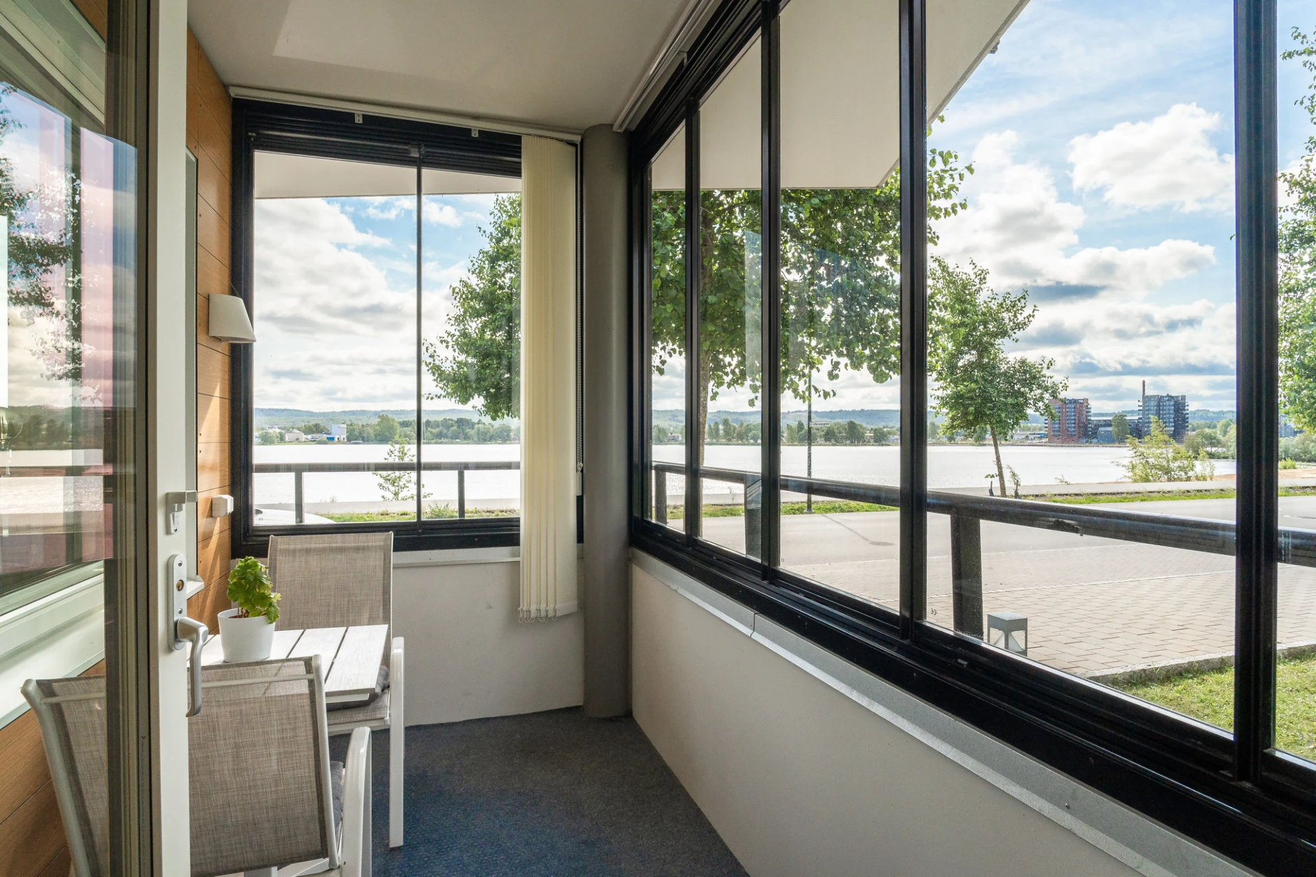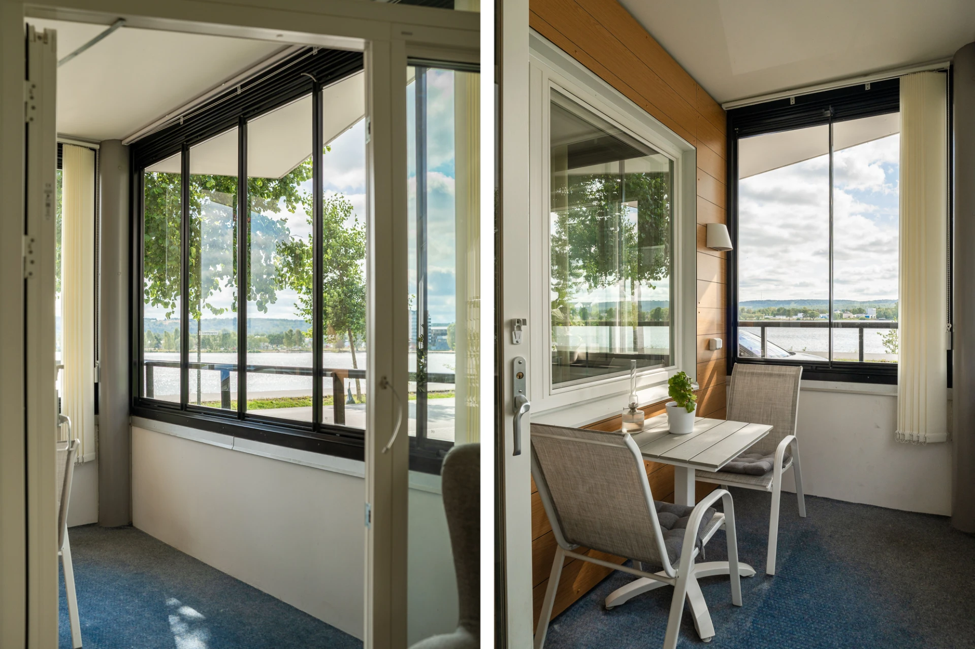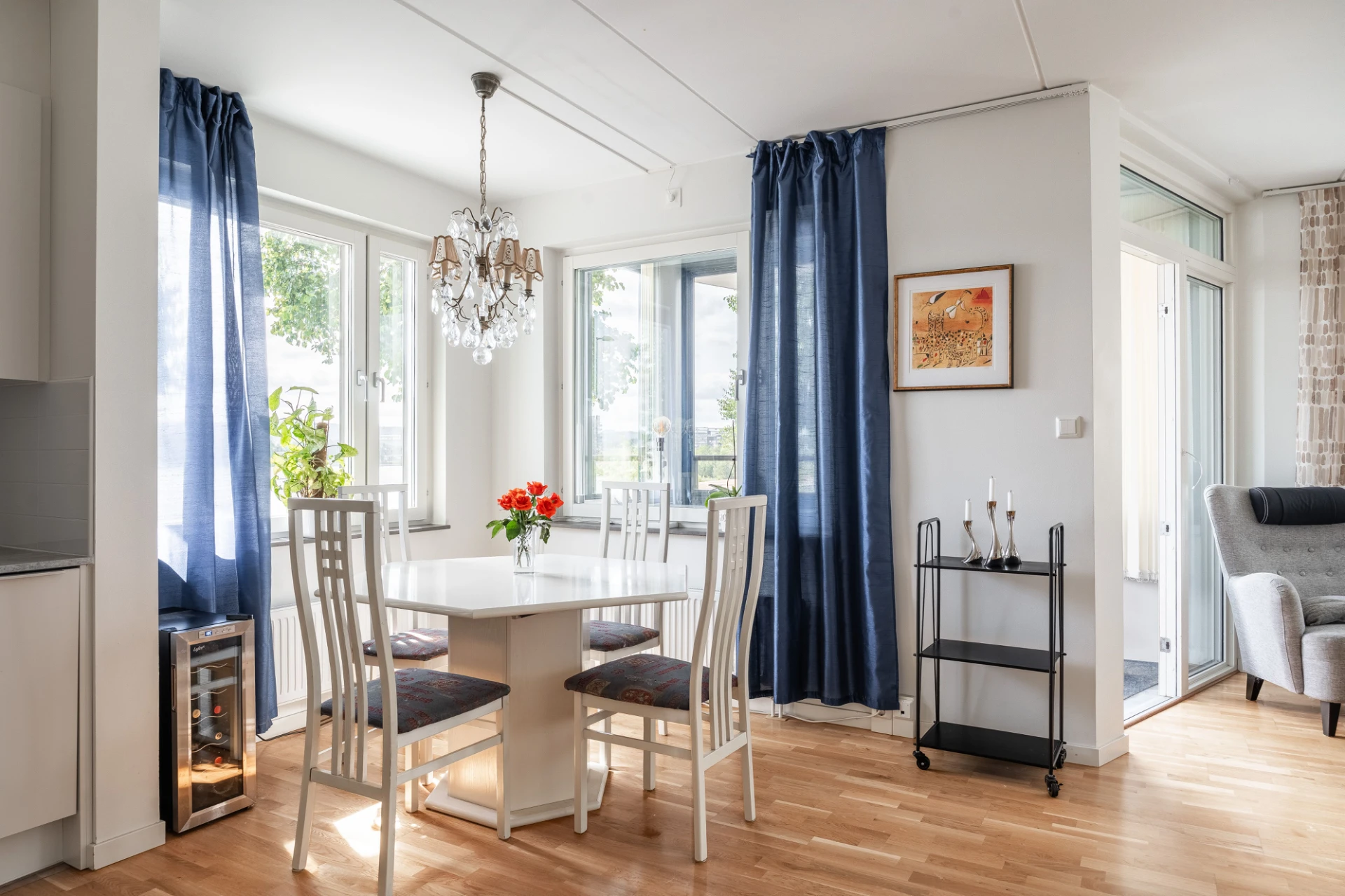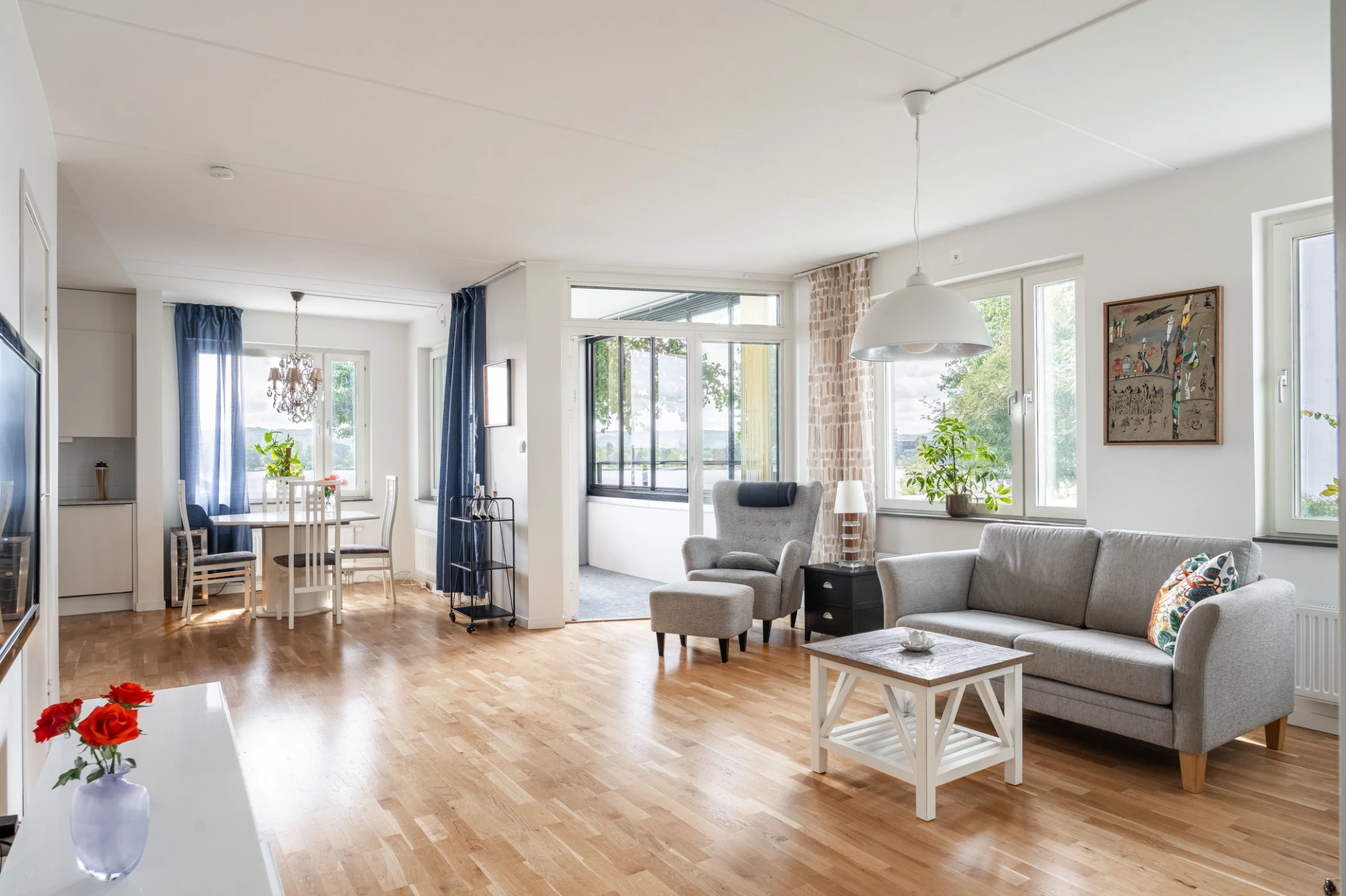 Från vardagsrummet nås den inglasade balkongen i soligt söderläge, en perfekt plats för morgonkaffet, middagar eller som ett extra rum större delen av året.