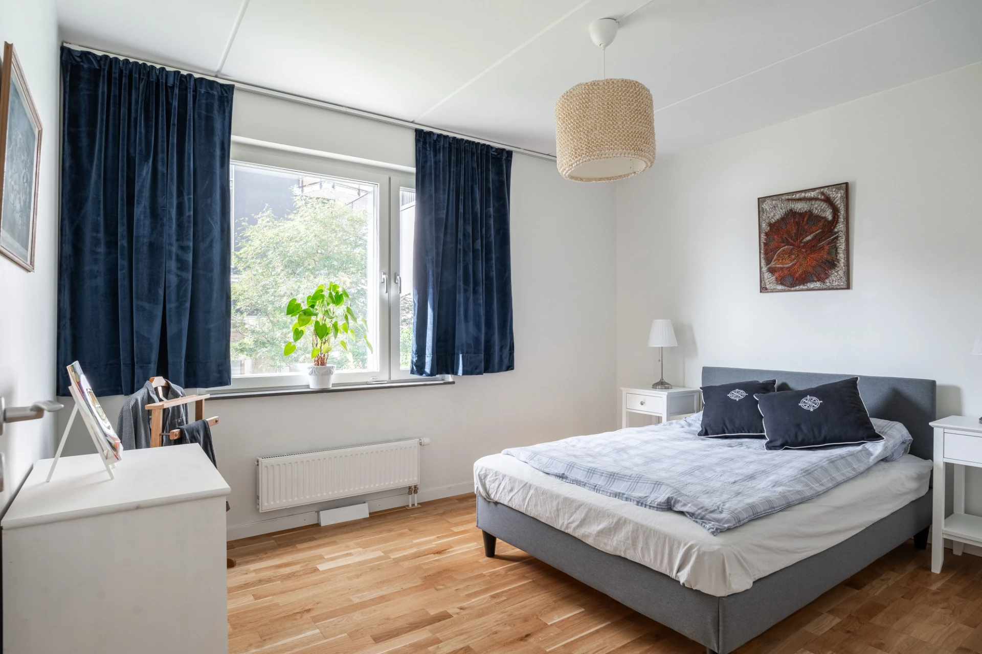 Insynsskyddat sovrum med gott om plats för dubbelsäng och byrå eller mindre skrivbord för hemmakontoret. Ekparkett och vita, neutrala väggar.