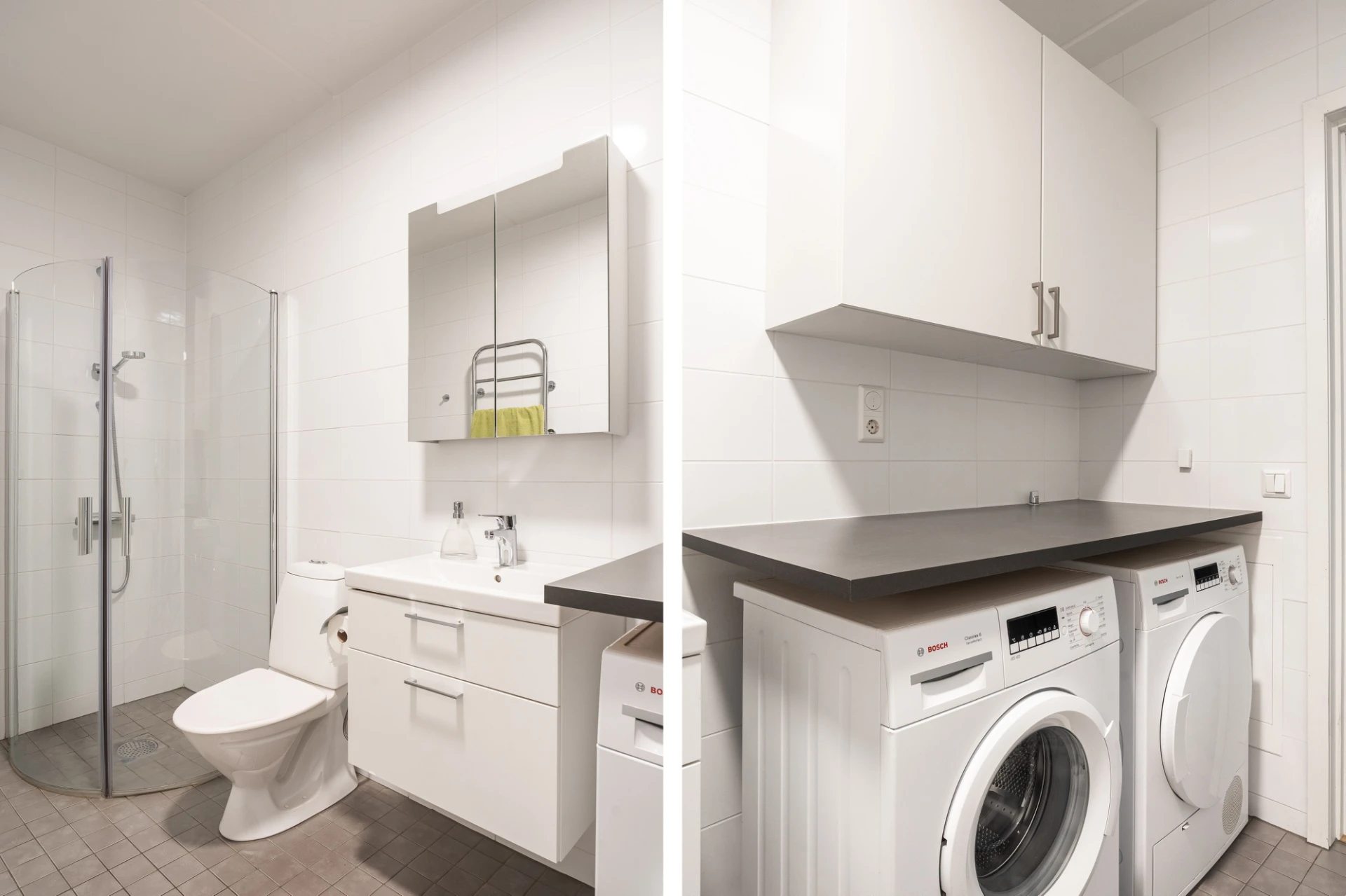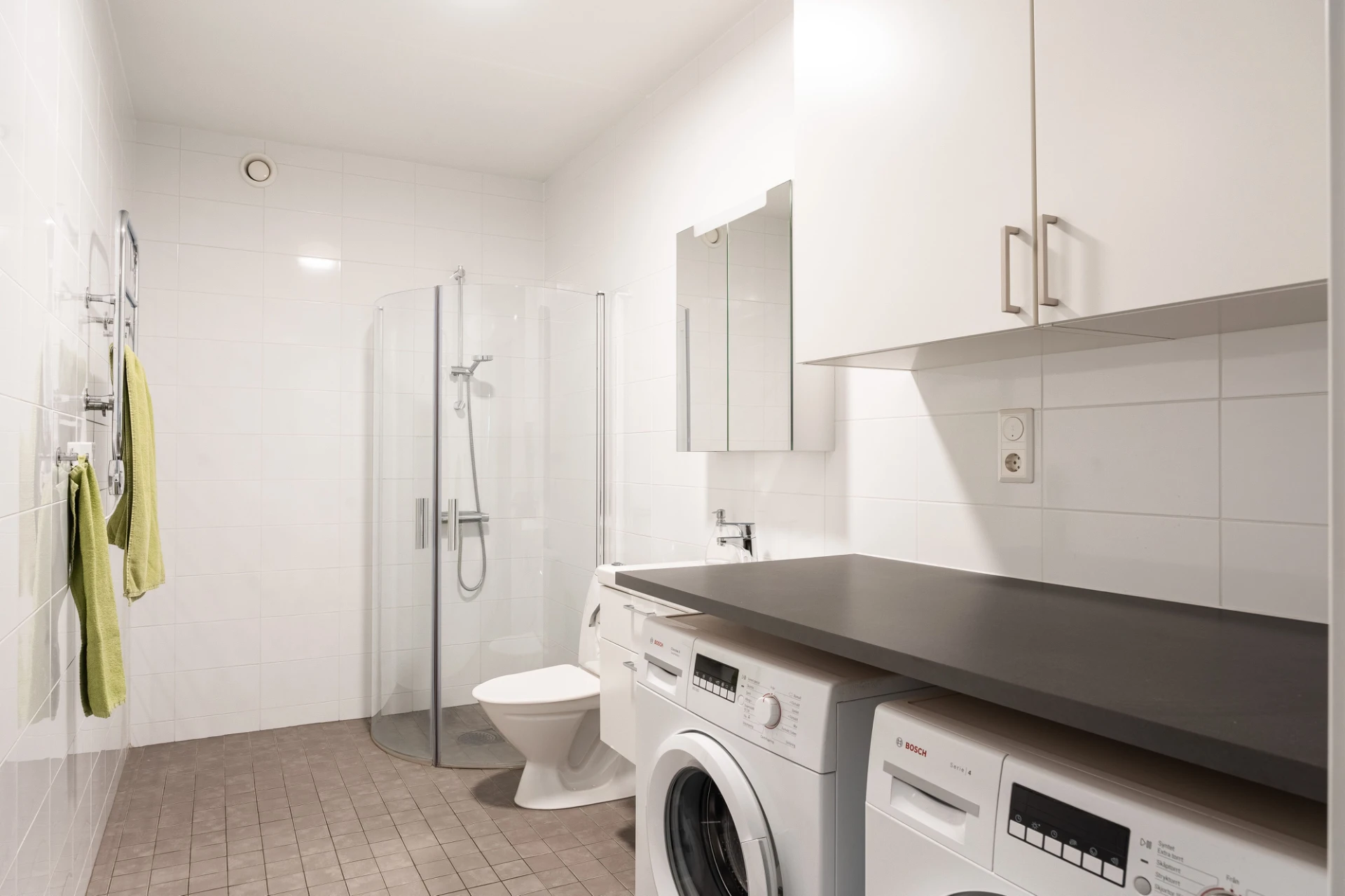 Helkaklat ljust badrum generöst i yta med behaglig golvvärme. Här finns både tvättmaskin och torktumlare installerade under en praktisk arbetsbänk med tillhörande överskåp. Badrummet är även utrustat med duschhörna med glasdörrar, handdukstork, toalettstol, tvättställ med kommod, badrumsskåp med spegel och belysning.