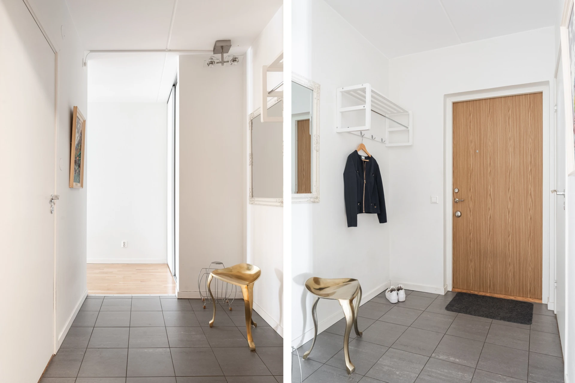 Ljus hall med vita väggar och grått klinkergolv. Direkt till höger om ytterdörren finns plats för ytterkläder och skor. I hallens nedre del finns en platsbyggd dubbelgarderob med skjutdörrar. I anslutning till hallen nås badrummet.