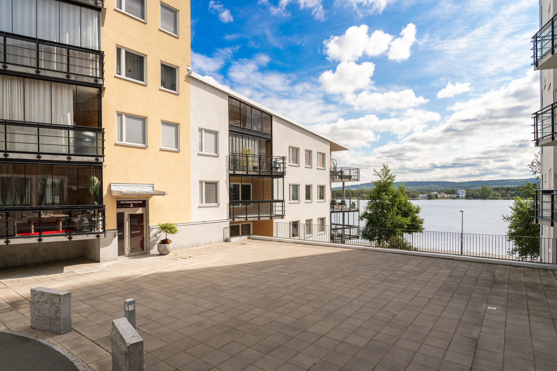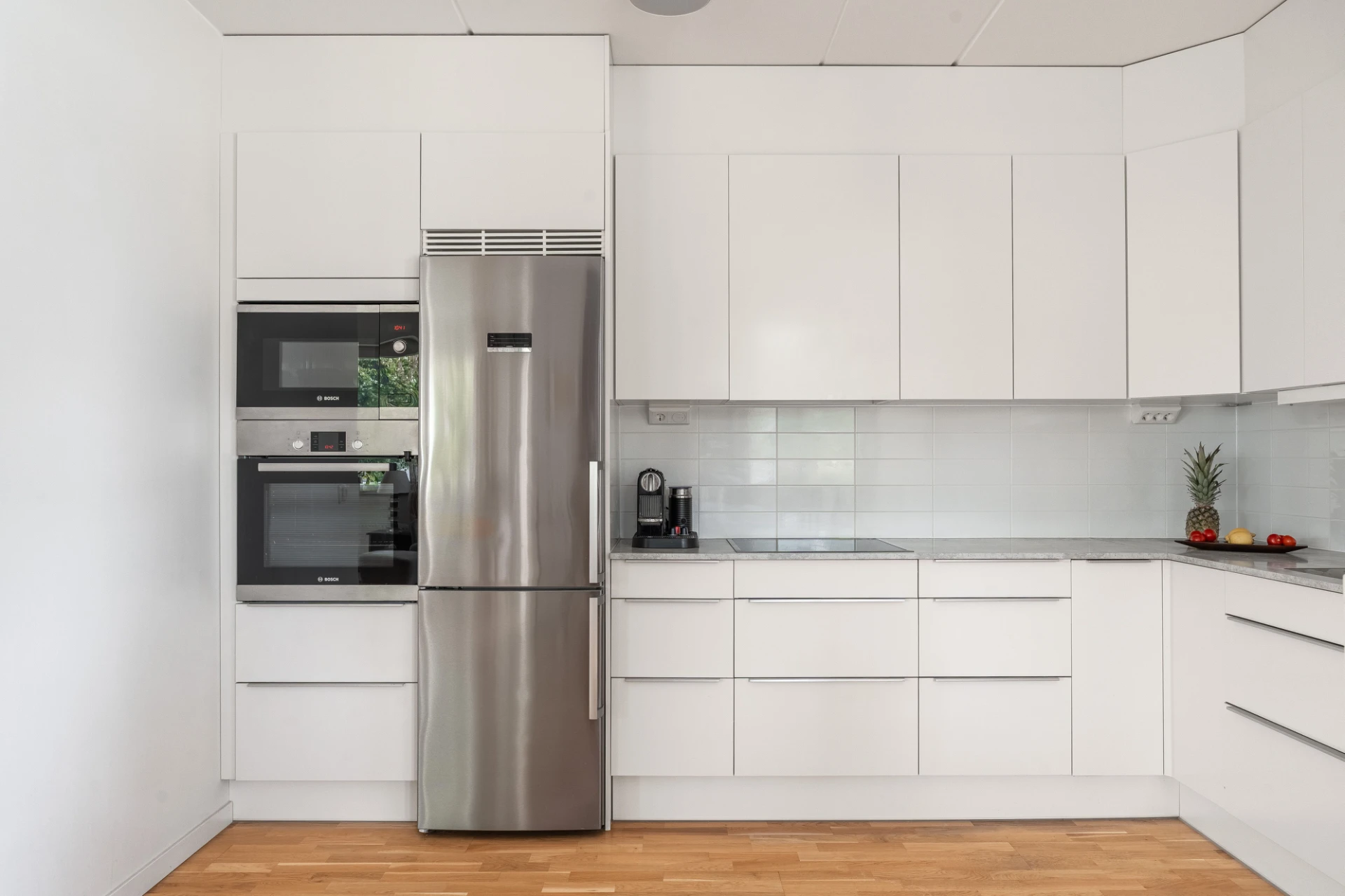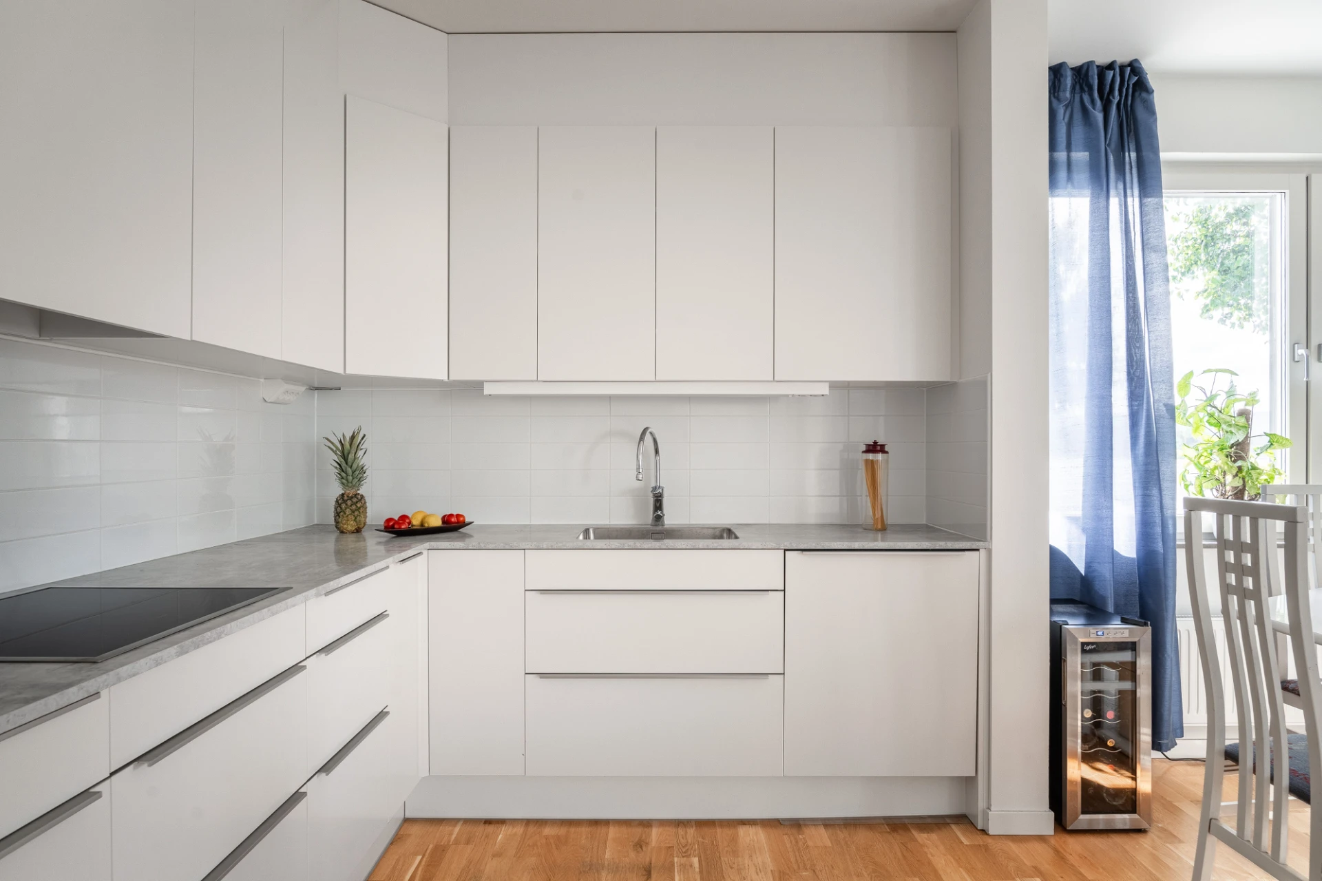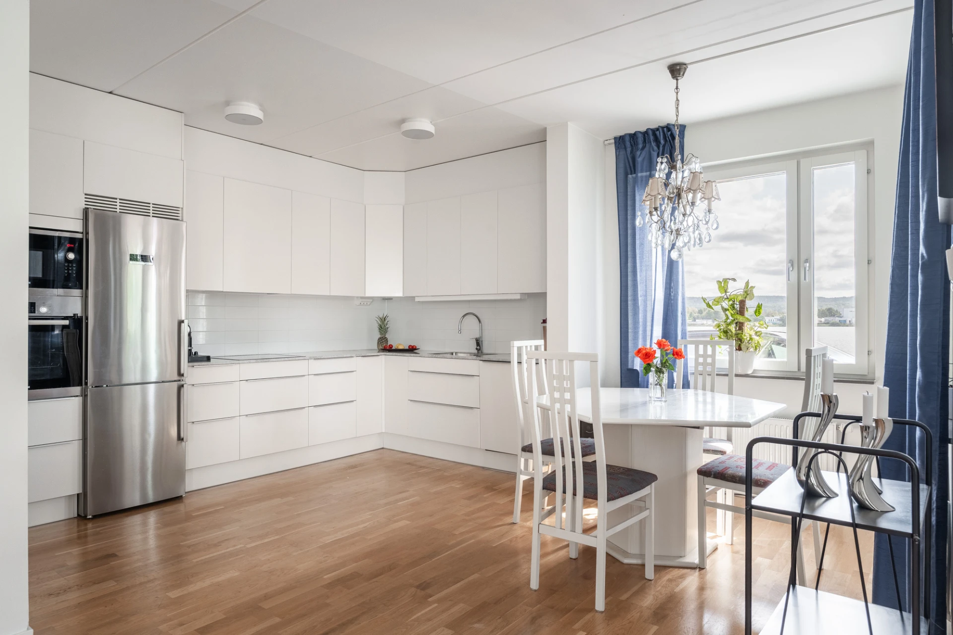 Vardagsrummet har en öppen planlösning till köket och bjuder på stora sociala ytor. Utsikten är fantastisk över sjön och ger en rogivande känsla. Från vardagsrummet nås den inglasade balkongen. Ett riktigt inbjudande kök som är perfekt för långa middagar! Här finns det rejält med arbetsyta och gott om förvaring i både skåp och lådor. Luckor i vitt och en ljus bänkskiva i tålig laminat. Köket är utrustat med vitvaror från Bosch med diskmaskin, spishäll, ugn (integrerad), micro (integrerad), kyl/frys och fläkt.