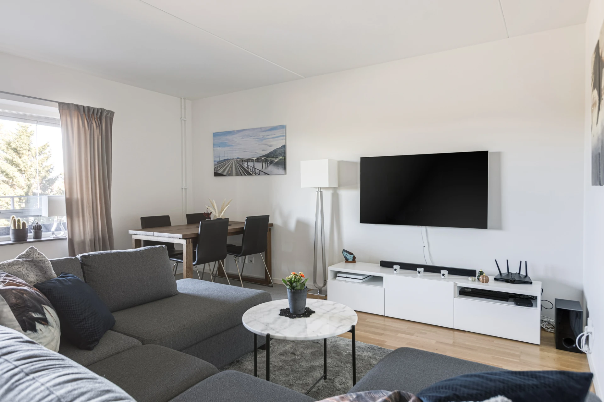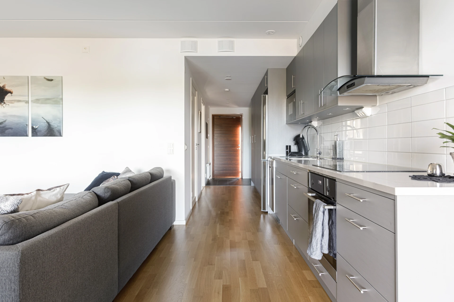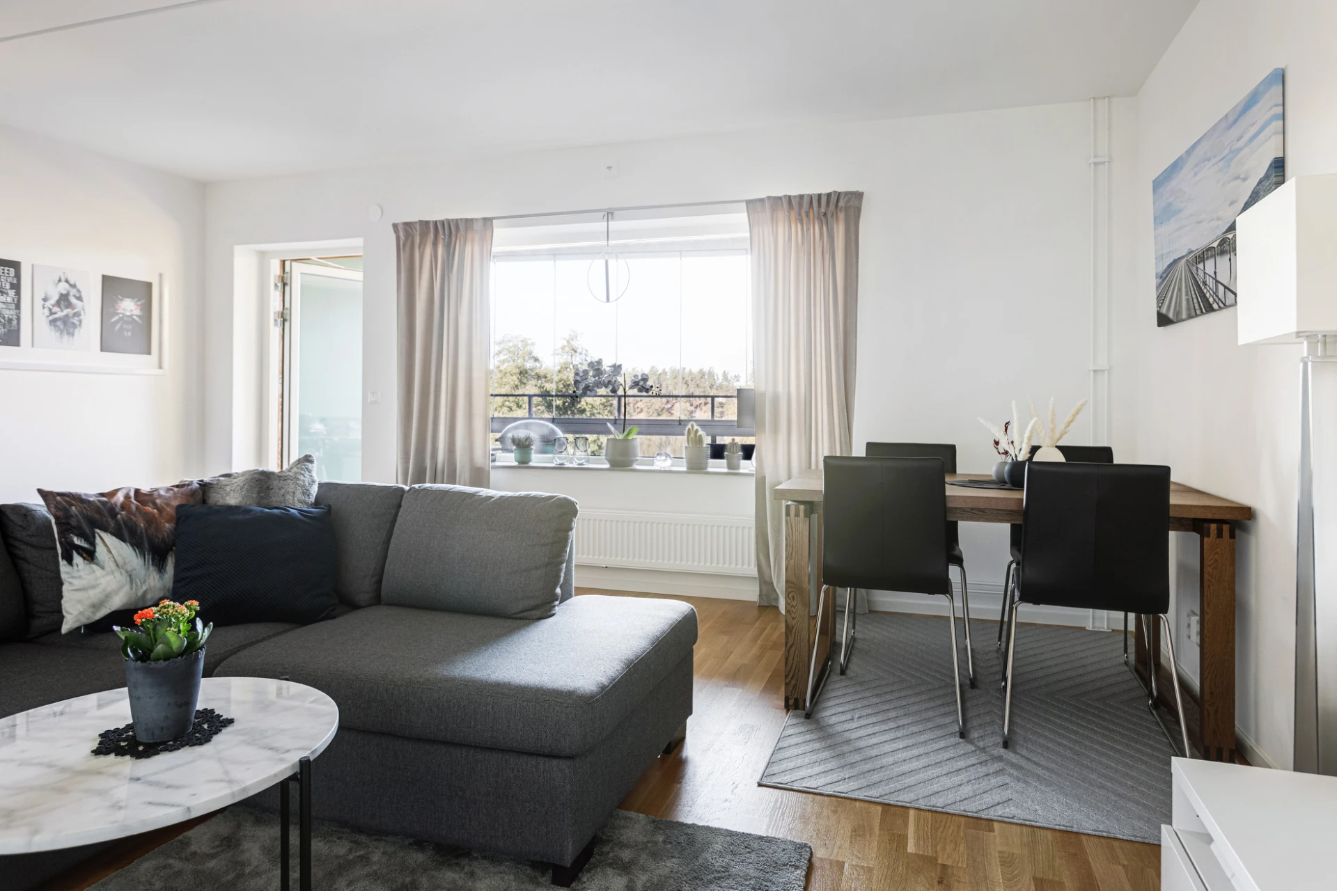 Bostaden erbjuder hög standard och stilrena materialval. Här finns ett kvalitetskök från Vedum, helkaklat badrum med tvättmaskin och torktumlare samt vackra parkettgolv i ek. De ljusa väggarna i kombination med toner i gråskala skapar en harmonisk helhet. Den generösa klädkammaren blir ett välkommet extra utrymme och kompletteras av garderober längs hallväggen.
