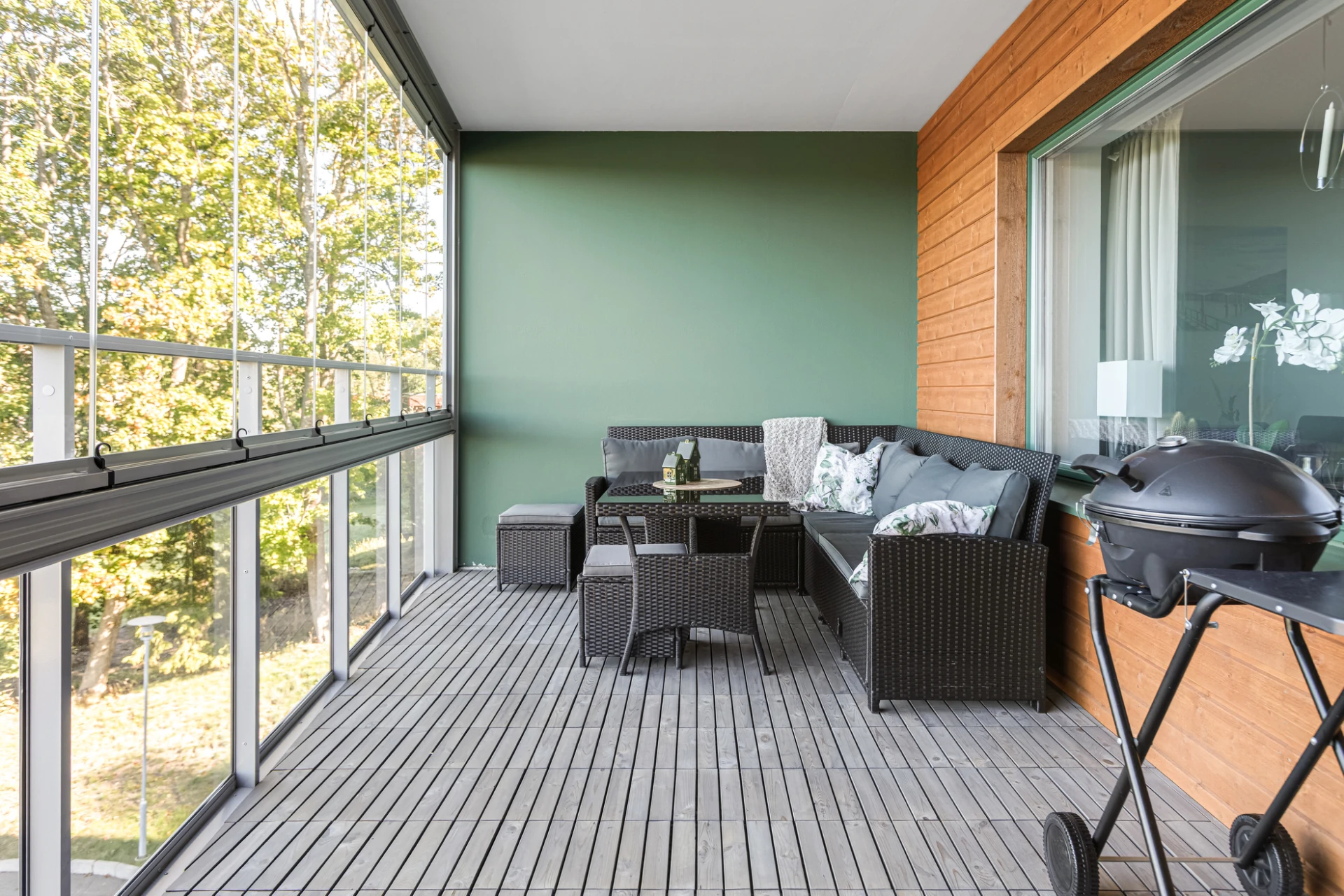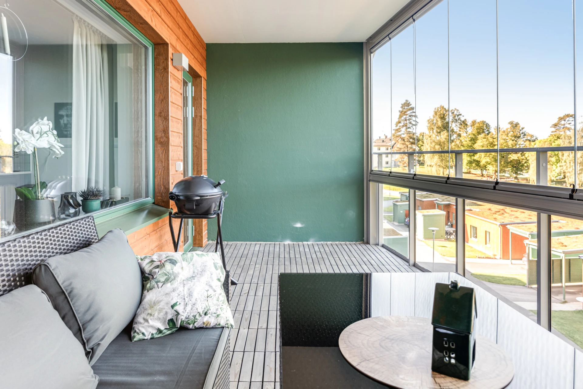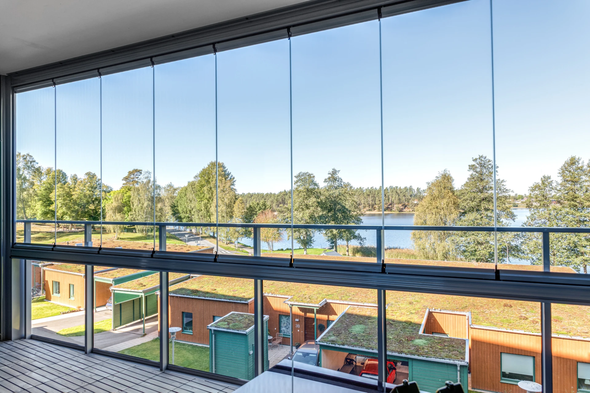 Stor inglasad balkong med fantastisk utsikt! Här ryms både utemöbler och krukor. Smidiga, öppningsbara glaspartier. Elluttag finns. En given plats många månader om året.