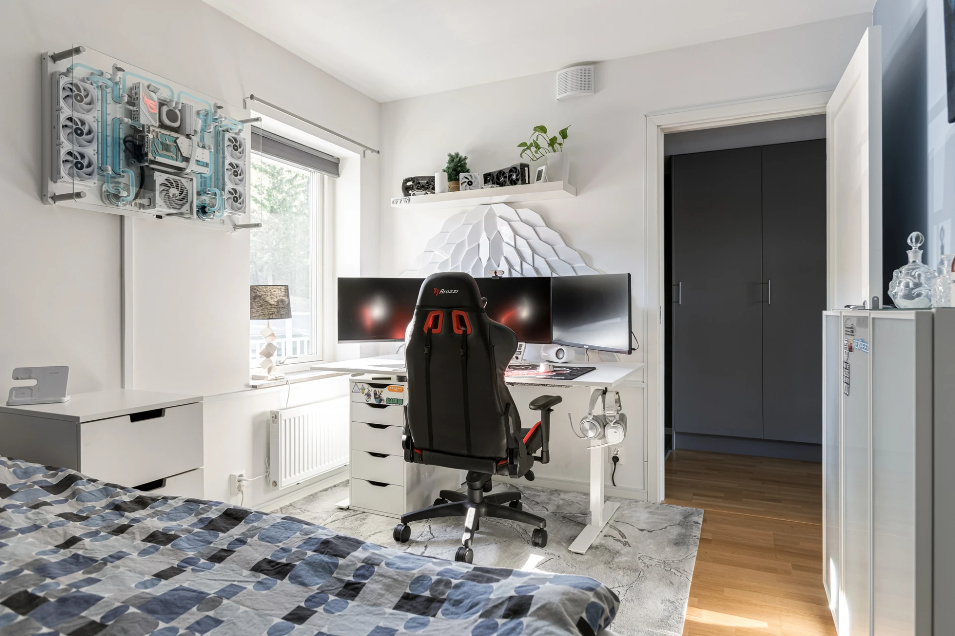 Sovrum med fint ljusinsläpp från fönster i sydvästligt läge. Här finns plats för dubbelsäng eller enkelsäng och skrivbord. Intill sovrummet finns klädkammaren. Blå väggar i olika två olika nyanser som bryts av med vita väggar intill fönster och mot hallen. Dimbar belysning (tillval vid byggnationen).