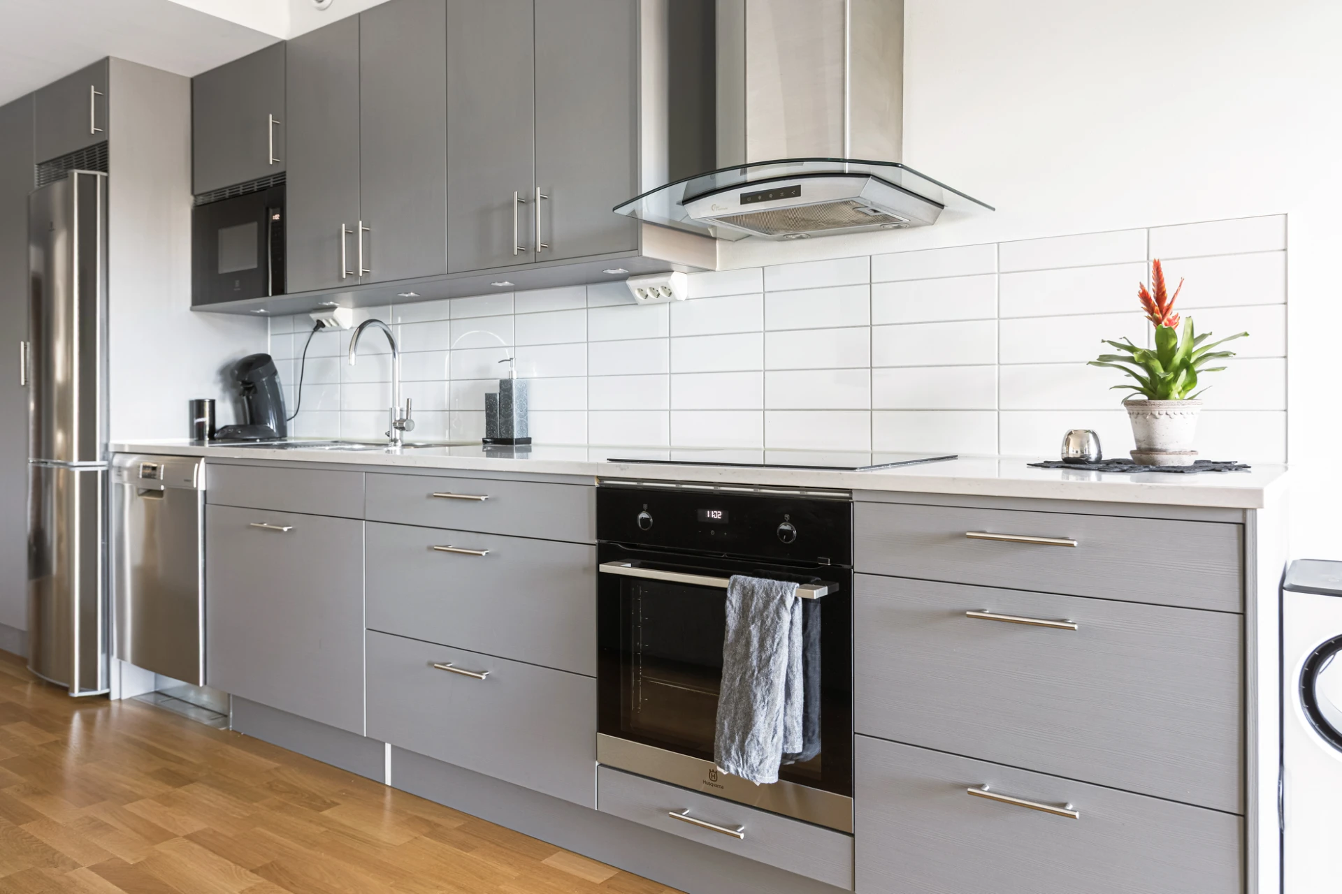 Kvalitétskök från Vedum med grå luckor och bänkskiva i ljus sten (tillval vid byggnationen). Bänkskivan är längre än standard (tillval vid byggnationen). Stilfulla liggande kakelplattor ovanför arbetsbänk. Köket är utrustat med en helt ny micro (inköpt juli-25), spishäll, ugn, fläkt, kyl/frys och diskmaskin. Dimbar belysning (tillval vid byggnationen).