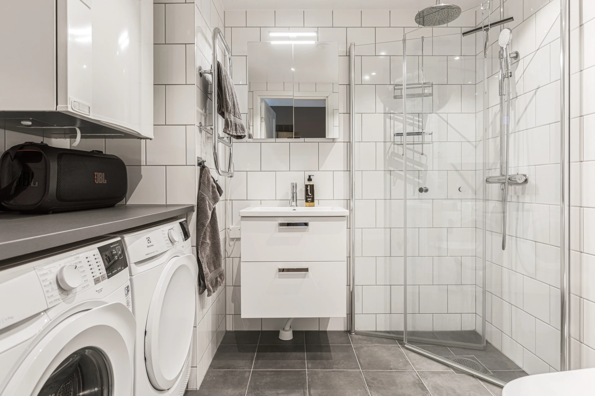 Helkaklat badrum med både tvättmaskin och torktumlare. Här finns även dusch med glasdörrar, tvättställ med kommod (Vedum) badrumsskåp med spegel (Vedum), handdukstork och arbetsbänk för vikning av tvätt. Spotlights i taket och behaglig golvvärme.