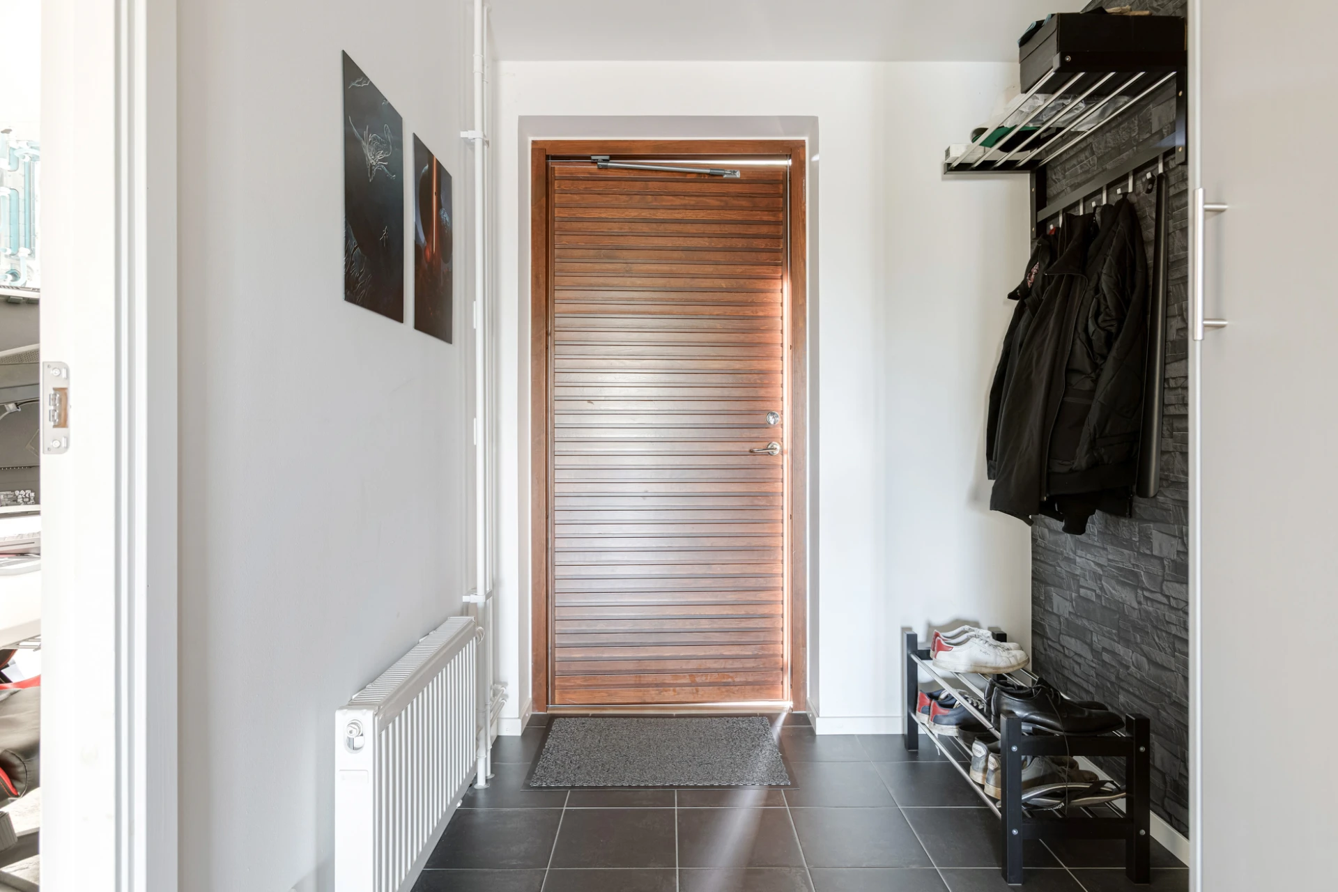 Praktisk hall med klinkergolv och golvvärme i hallens första del. Mönstrad tapet i grått vid väggen direkt till vänster. Längs väggen till köket finns fyra platsbyggda garderober som ger plats åt kläder, städredskap och skafferivaror. Dimbar belysning (tillval vid byggnationen).