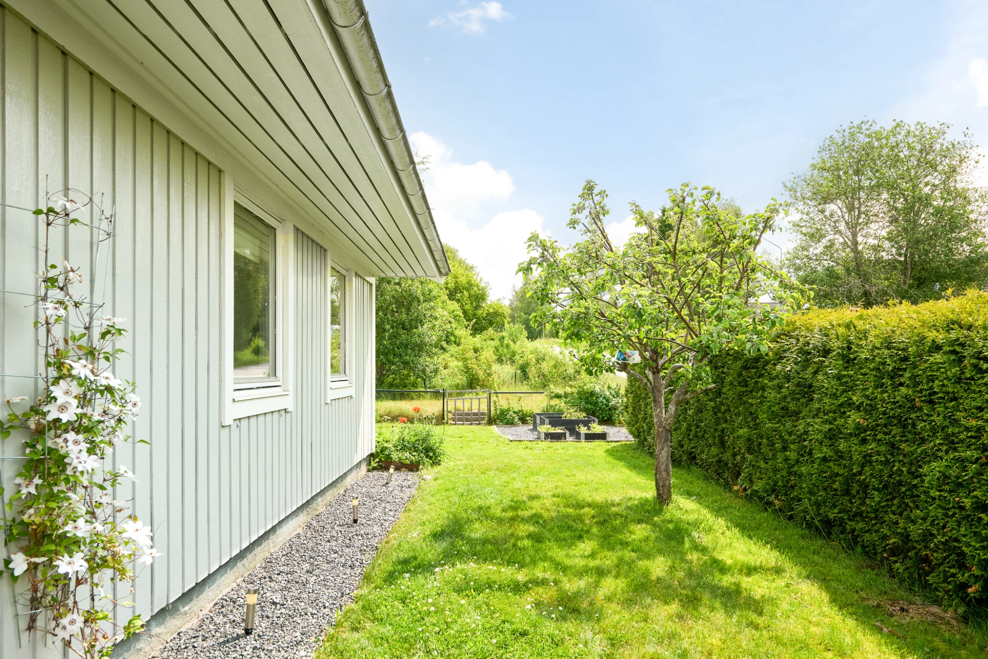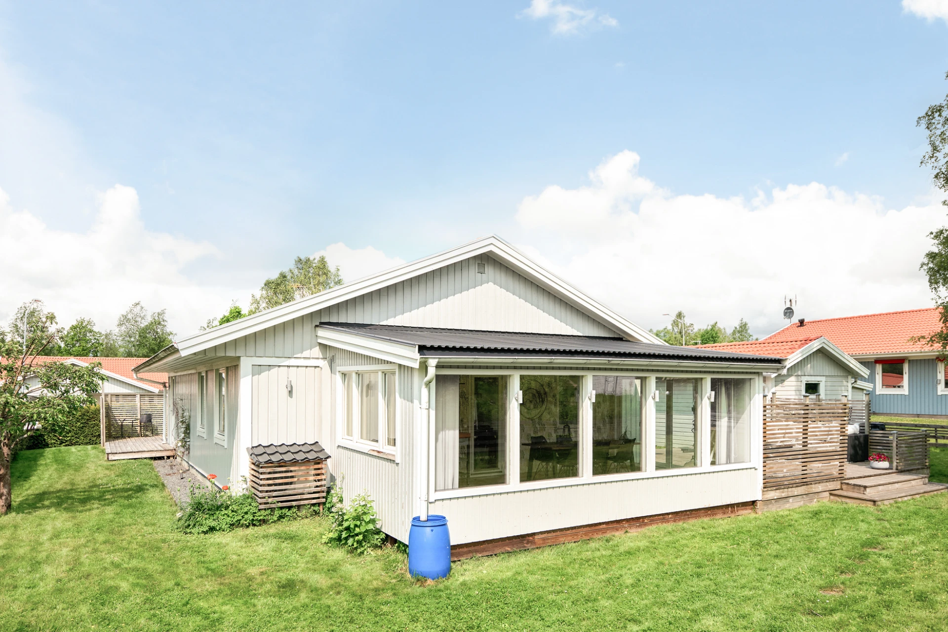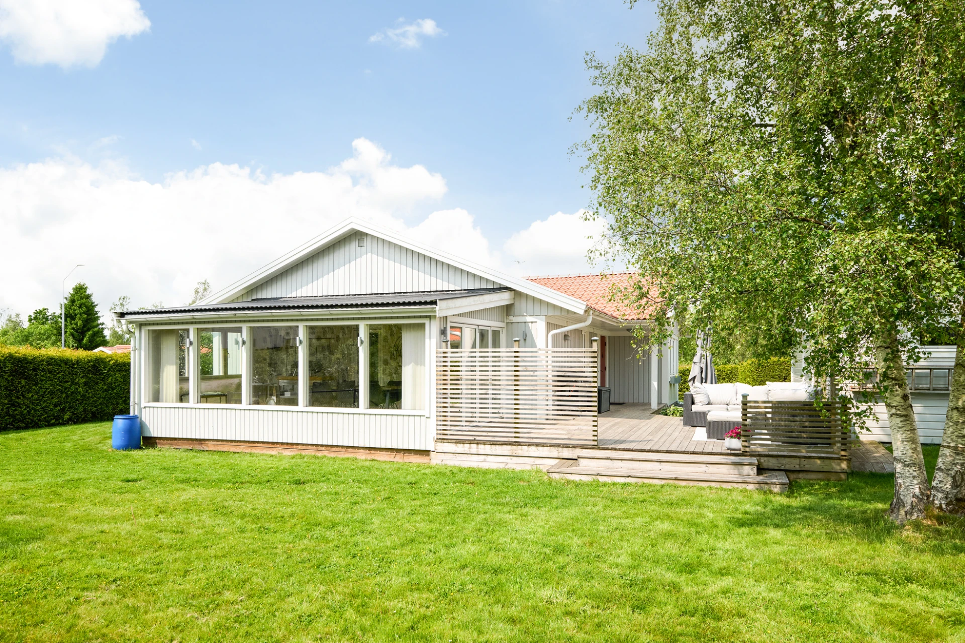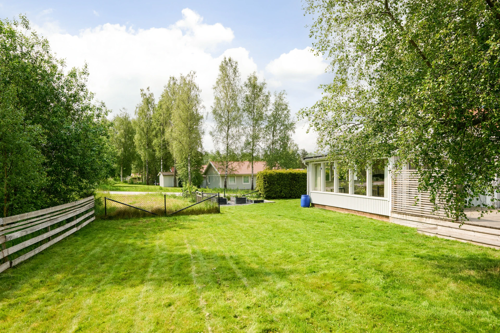 Det inglasade uterummet blir snabbt hemmets favoritplats – här kan du njuta av både vårsol och sensommarkvällar oavsett väder. Trädgården är lättskött men samtidigt inbjudande med insynsskyddad grönska och härliga uteplatser. Staket och buskar runtom trädgården är en trygghet både för småbarn och fyrbenta vänner.