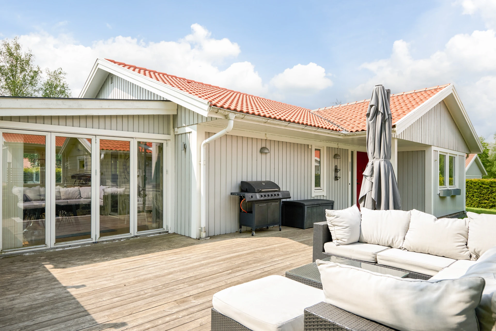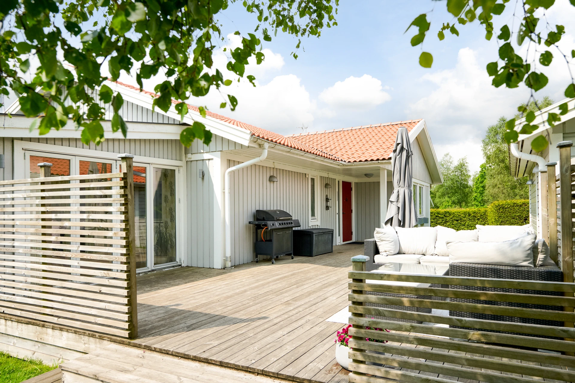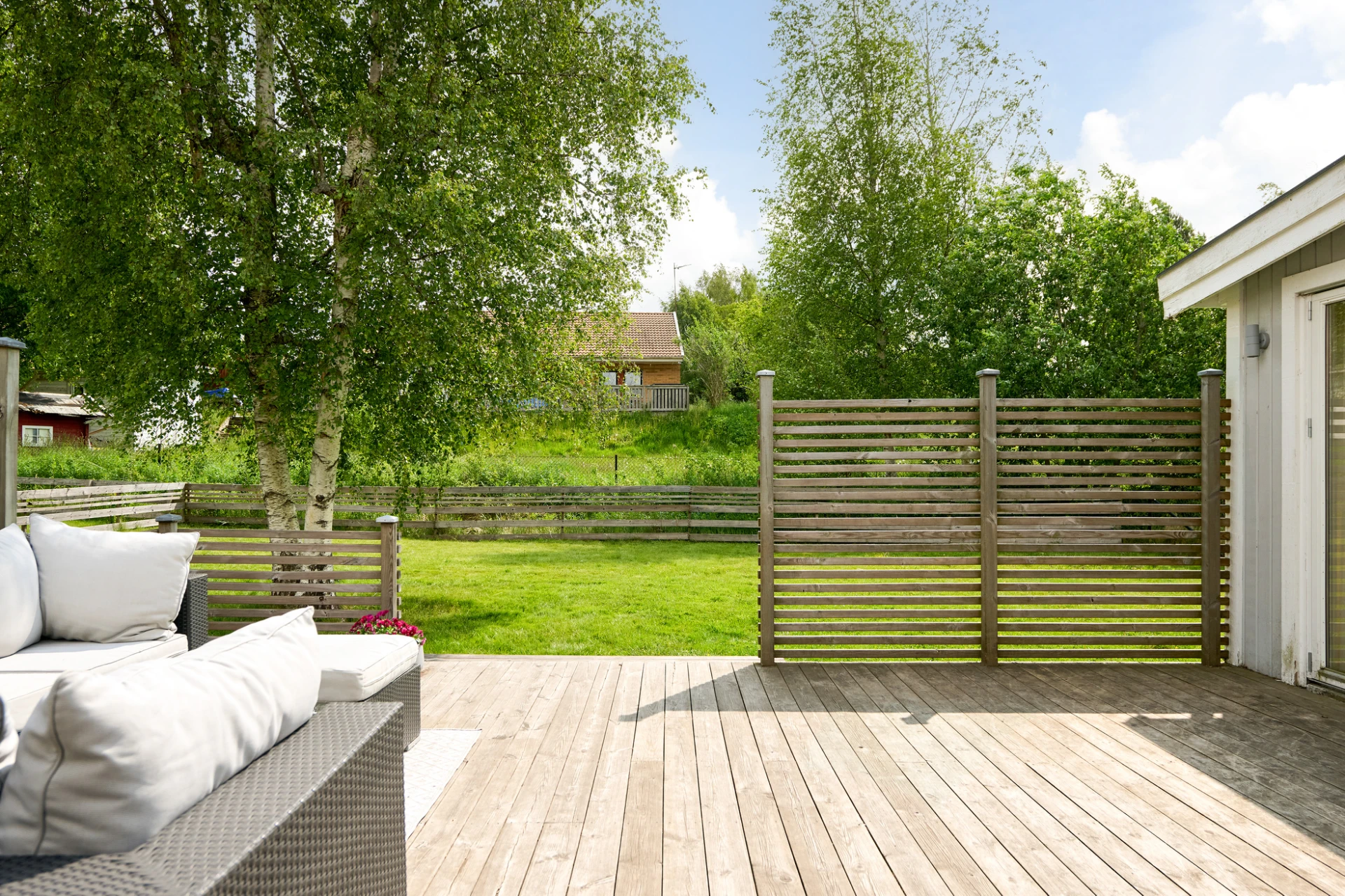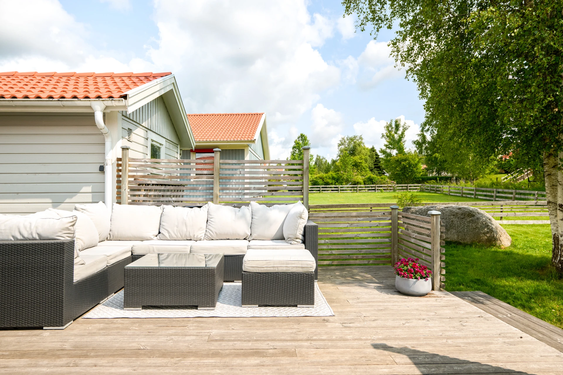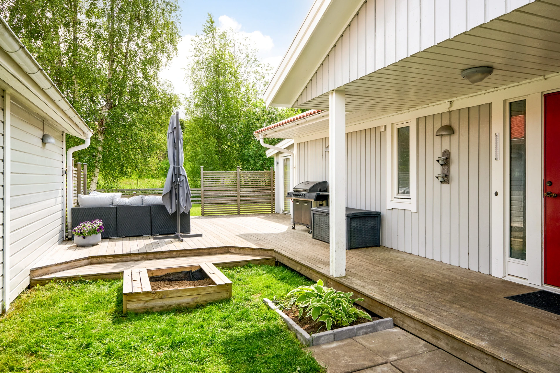 Det inglasade uterummet blir snabbt hemmets favoritplats – här kan du njuta av både vårsol och sensommarkvällar oavsett väder. Trädgården är lättskött men samtidigt inbjudande med insynsskyddad grönska och härliga uteplatser. Staket och buskar runtom trädgården är en trygghet både för småbarn och fyrbenta vänner.