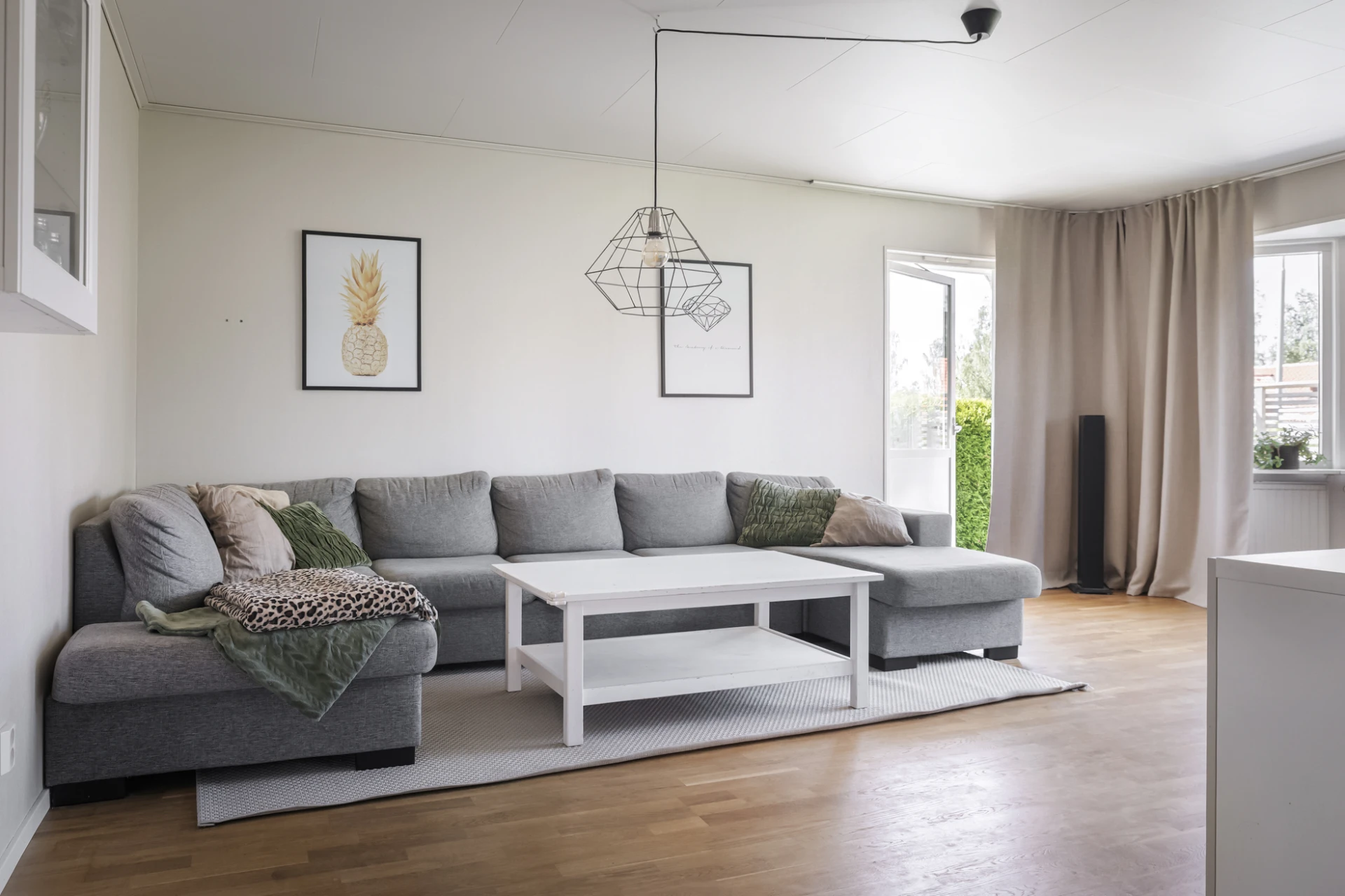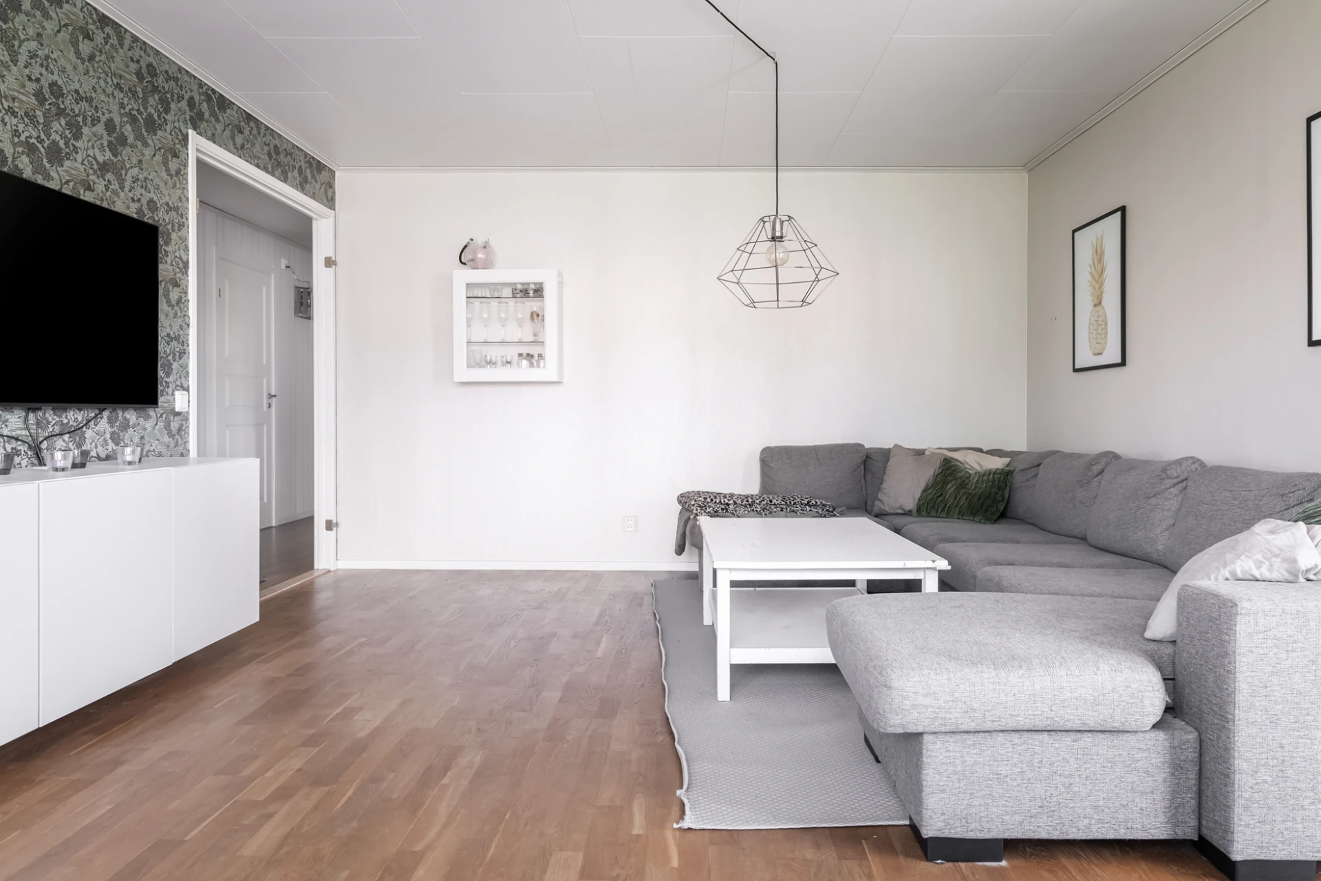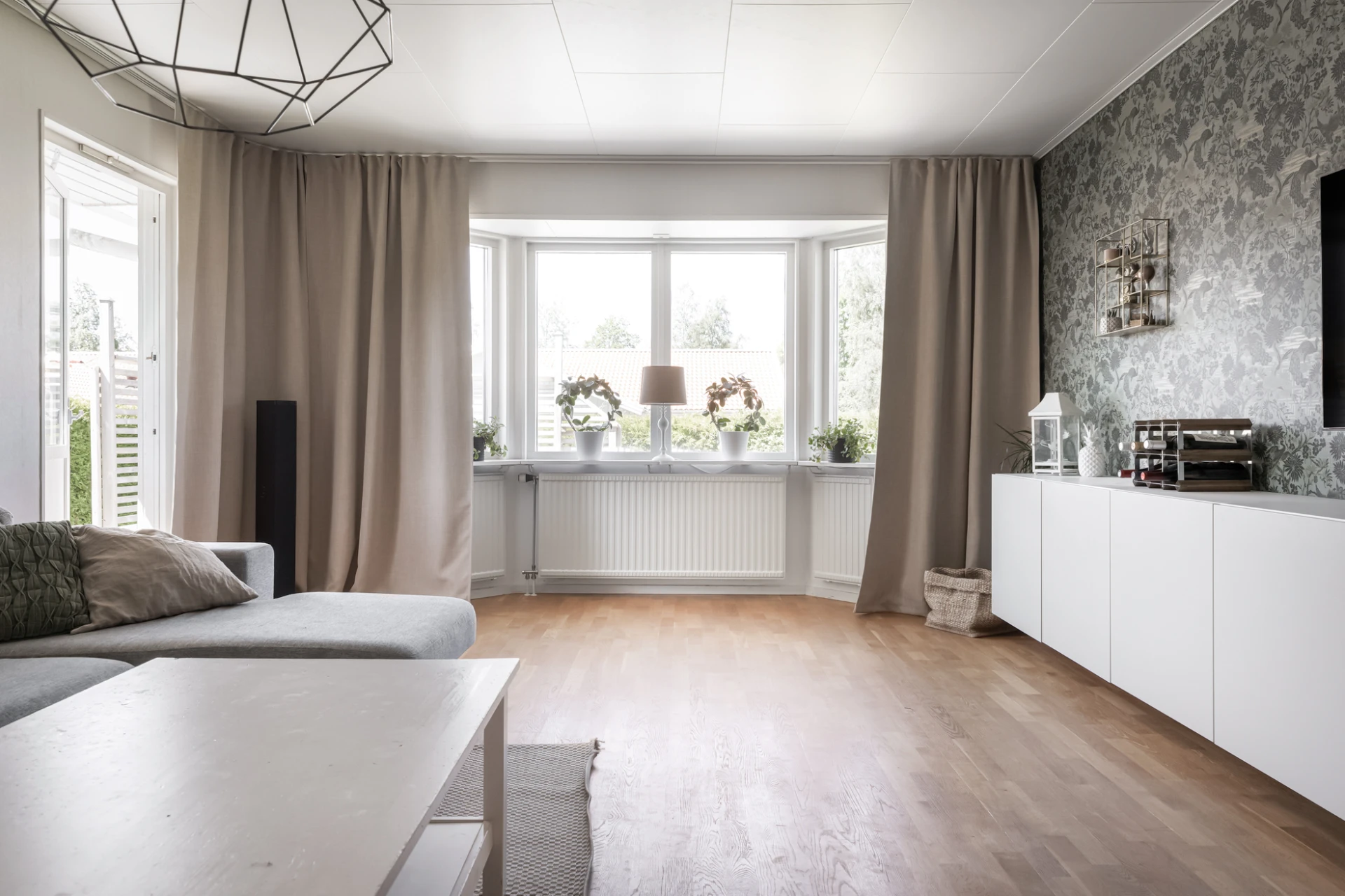 Stort vardagsrum med fint ljusinsläpp från fönster från burspråk i västerläge. Från vardagsrummet finns direkt utgång till trädgården. Ljusa, neutrala väggar med fondvägg i gråskala. Laminatgolv.