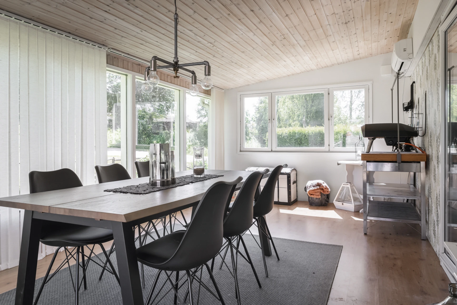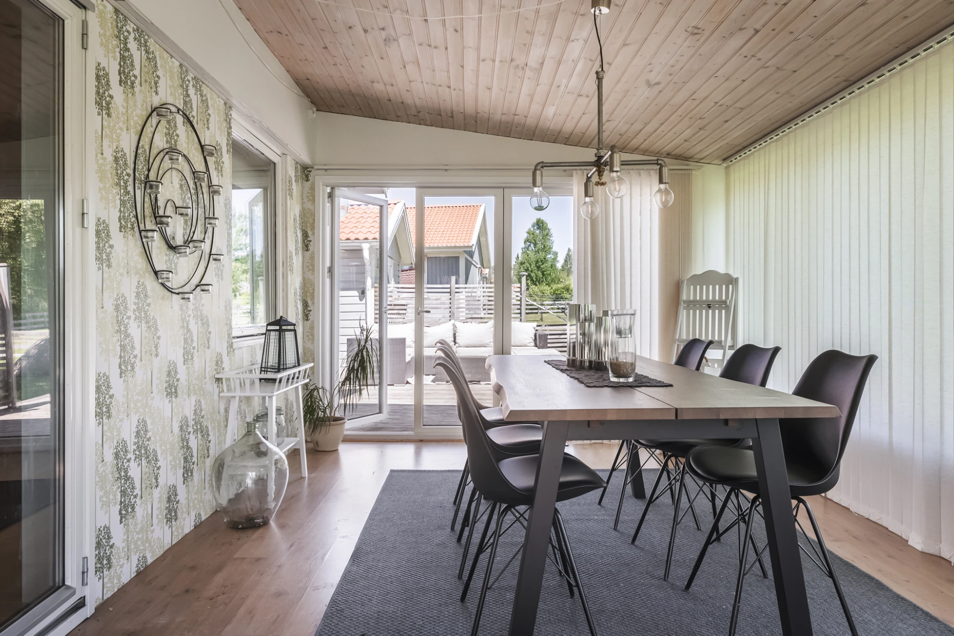 Rymligt uterum i österläge fungerar som ett extra vardagsrum många månader om året tack vare installerad luftvärmepump. Ljust trätak och ljust golv i laminat. Vita väggar med mönstad fondvägg i grönt längs husfasaden. Från uterummet nås den stora uteplatsen.