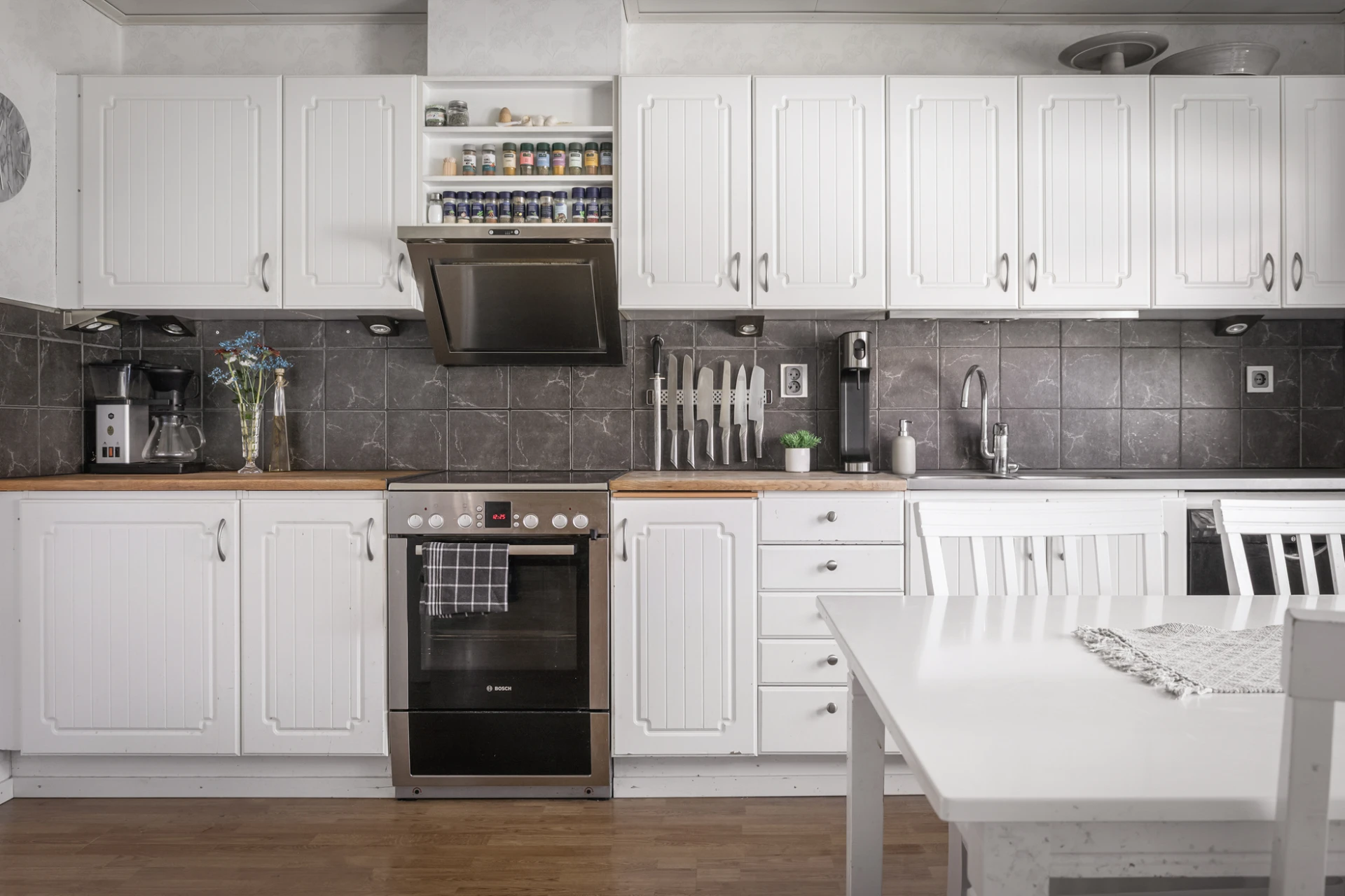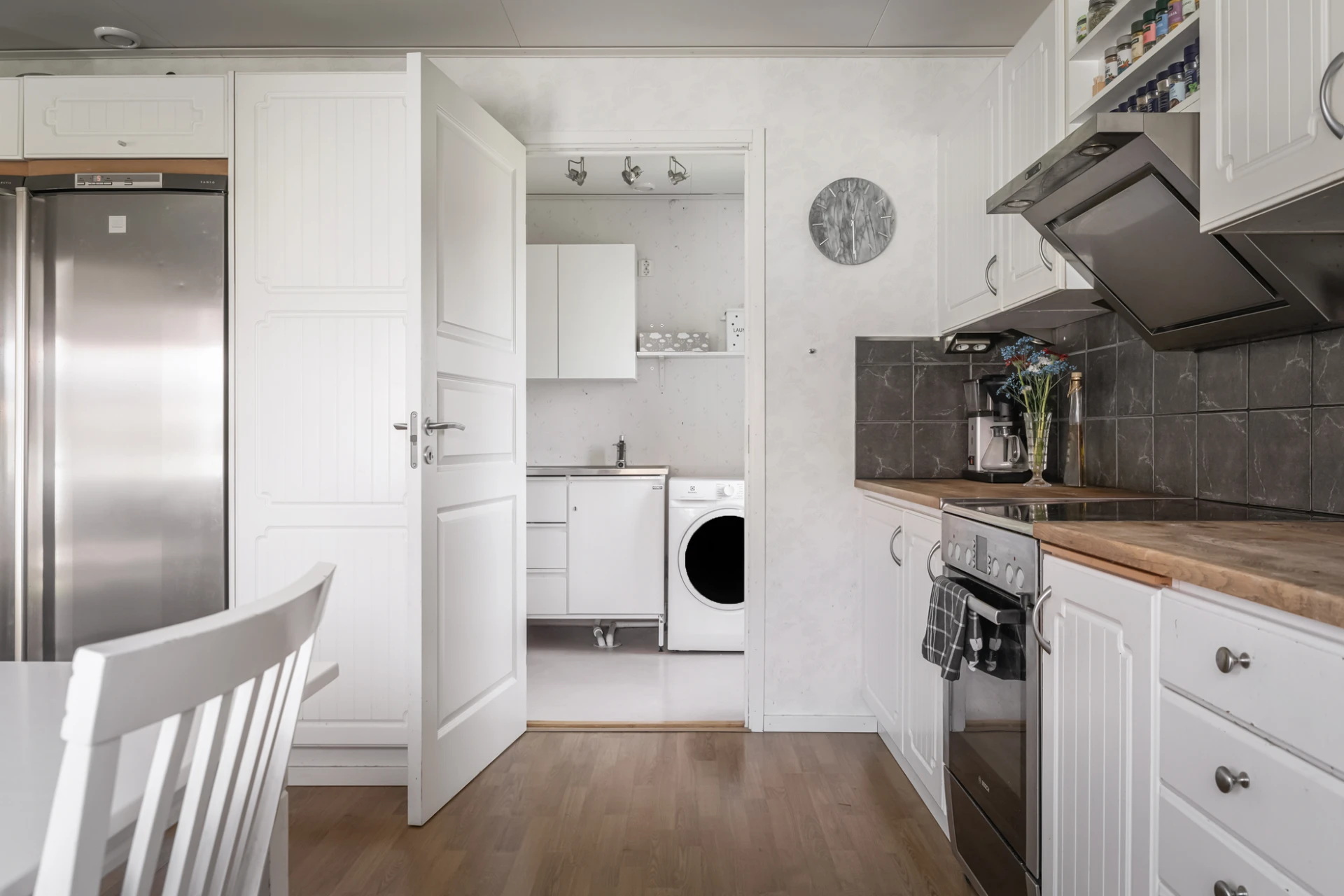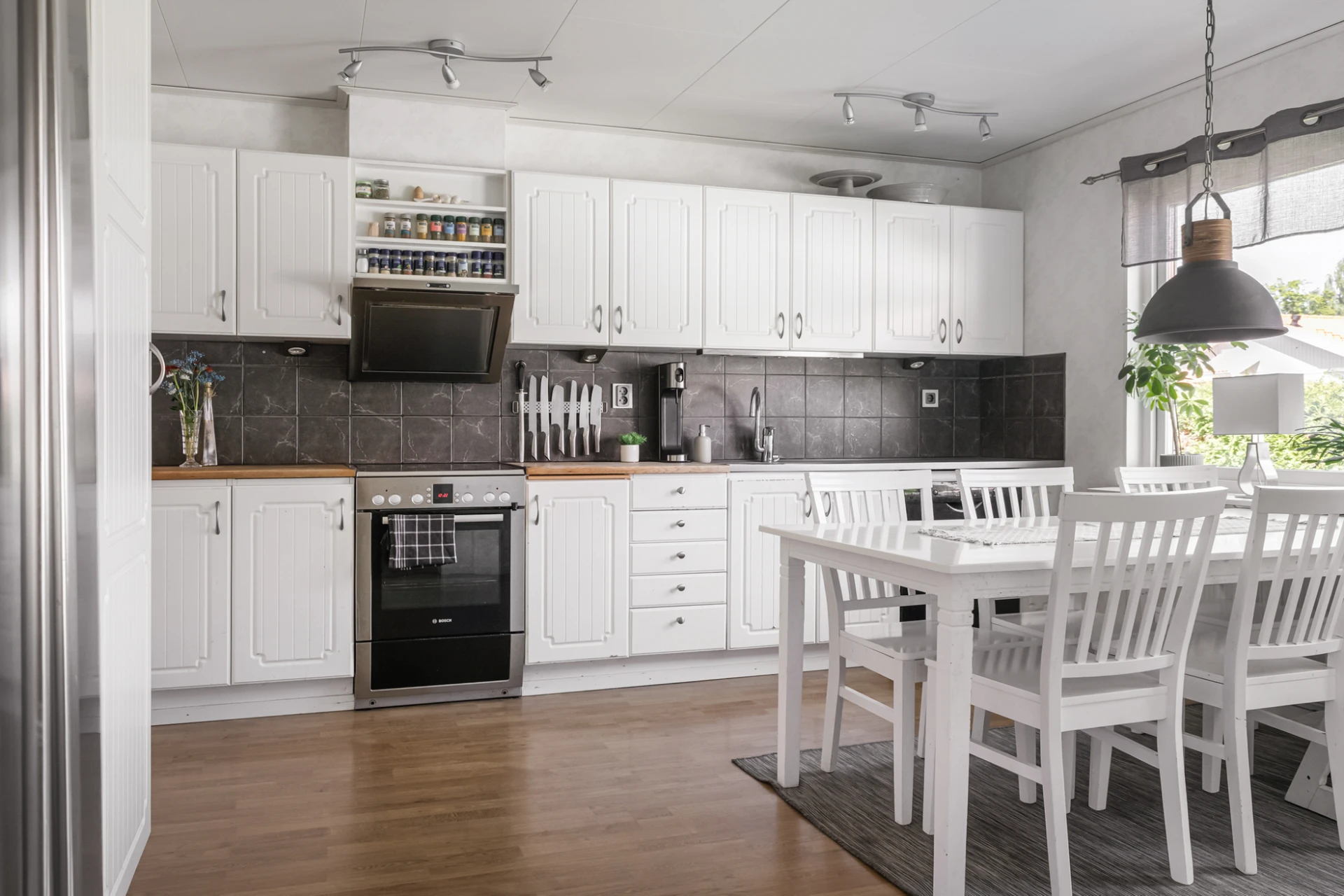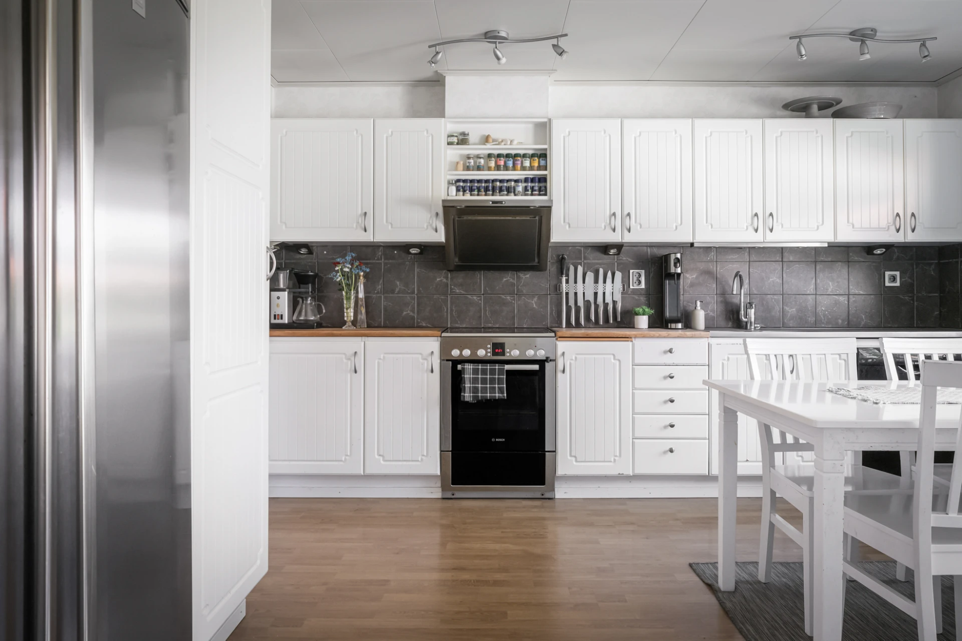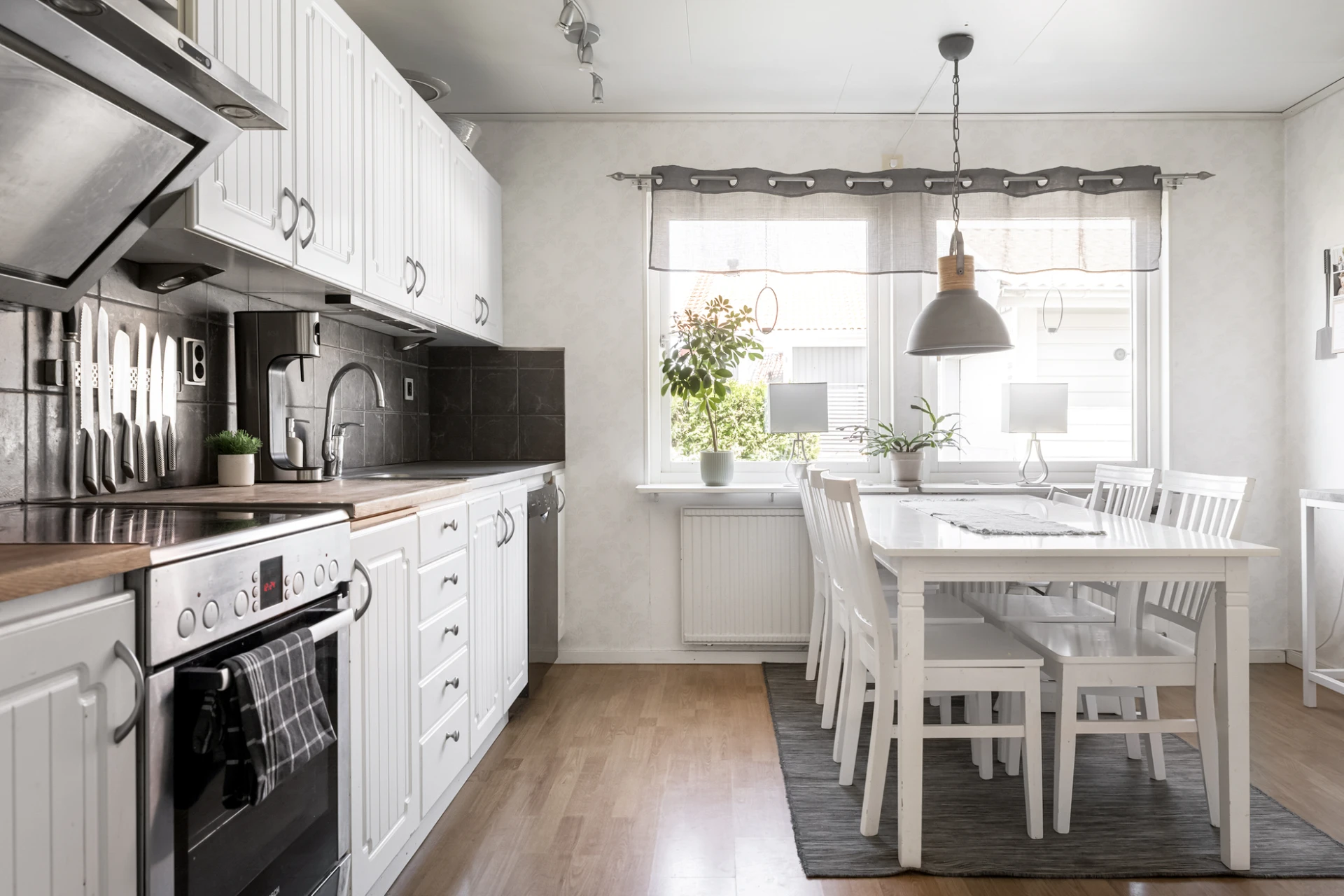 Fräscht kök i vitt och grått med vitvaror i rostfritt stål. Här finns det generöst med plats för både familj och vänner. Bra förvaringsutrymme i både skåp och lådor underlättar vardagen. Köket är utrustat med spis, ugn, köksfläkt, kyl, frys och diskmaskin.