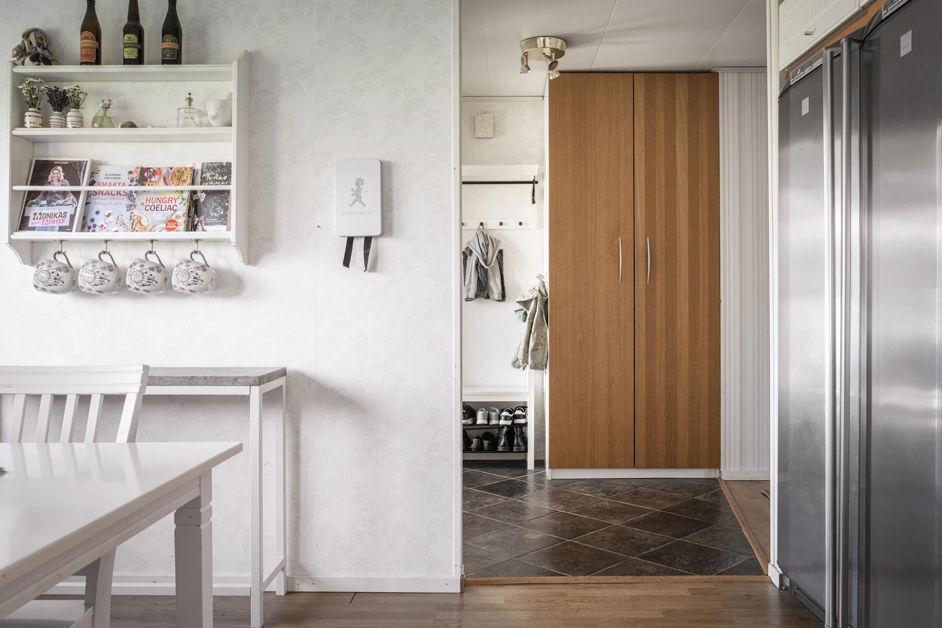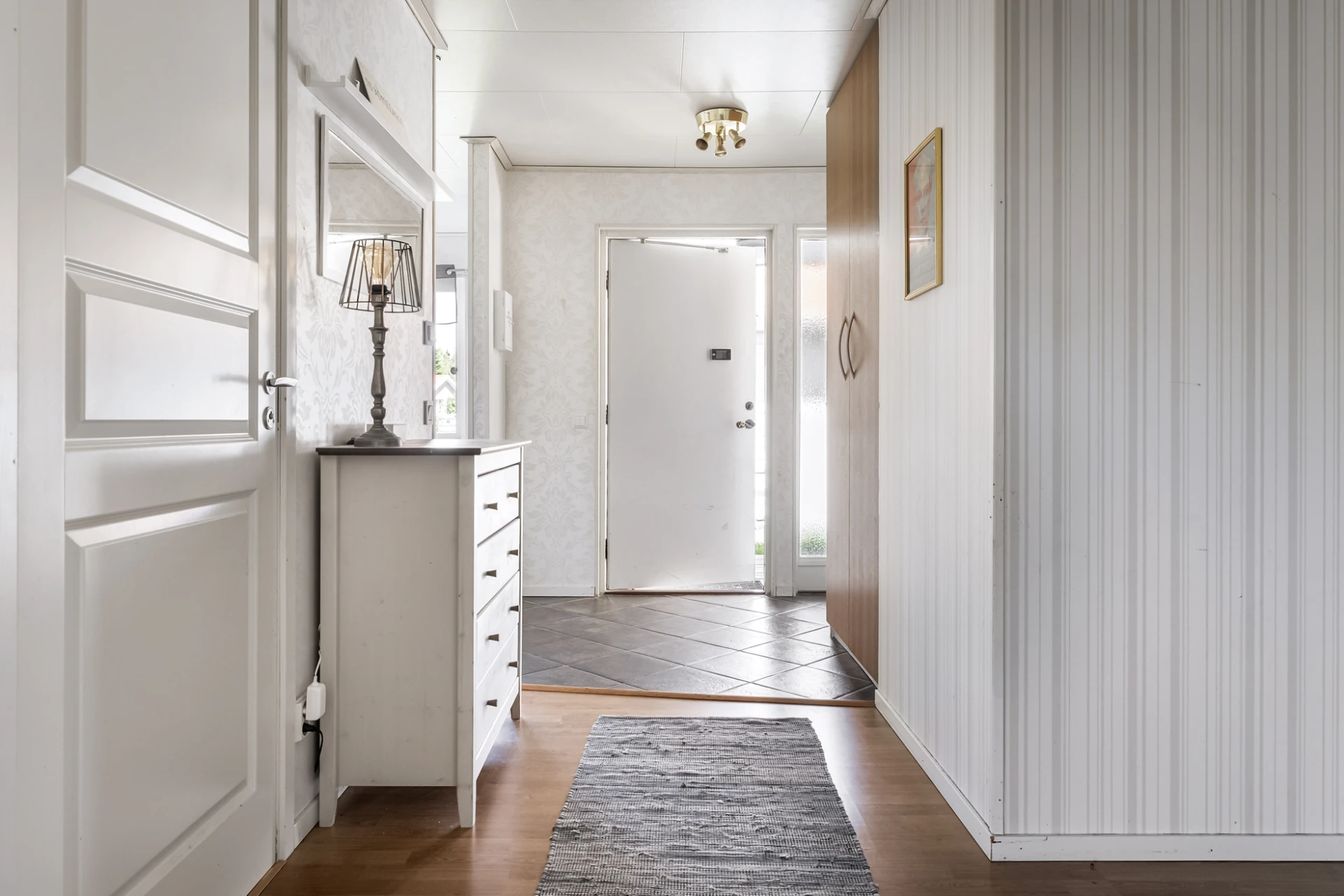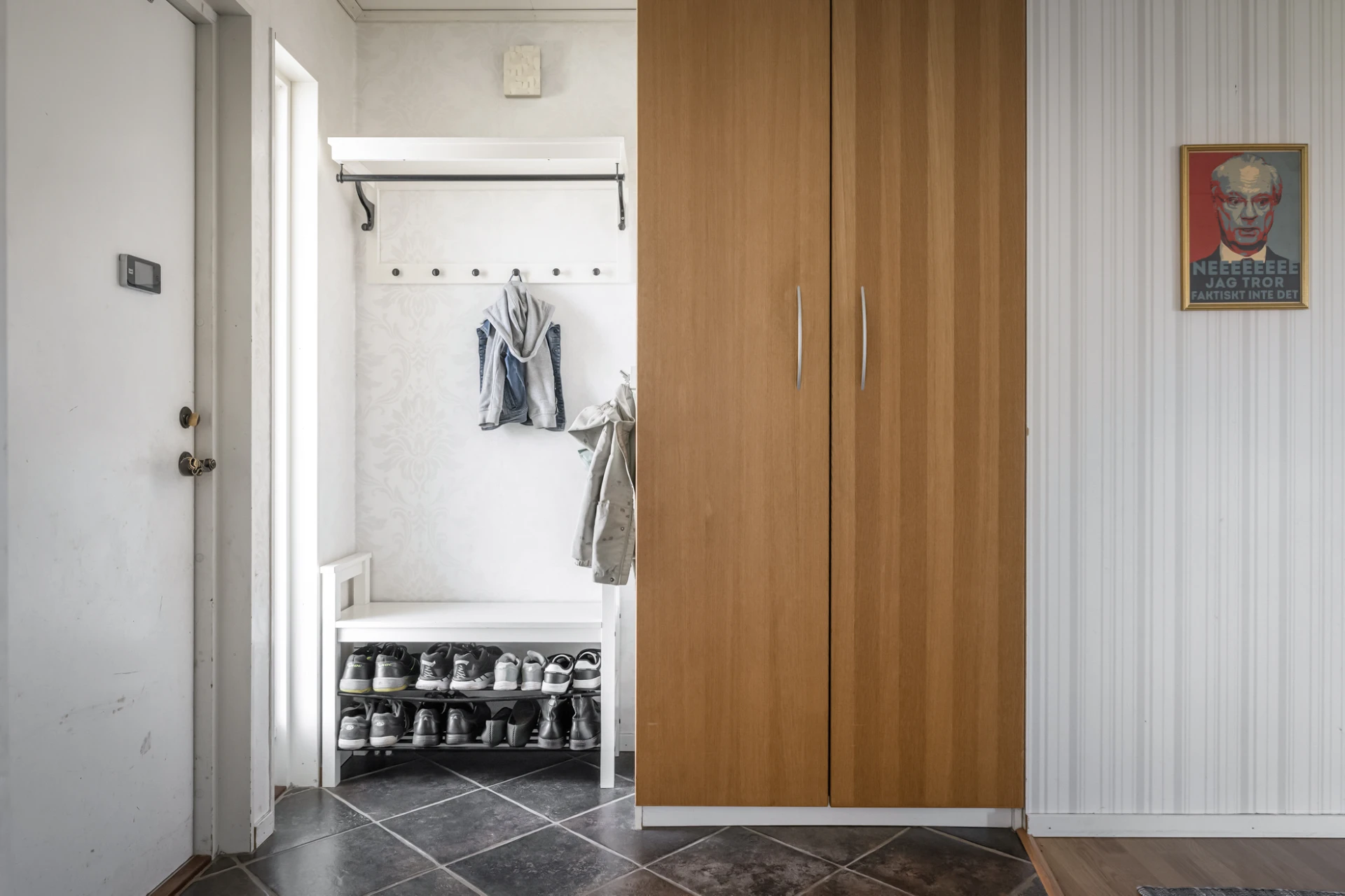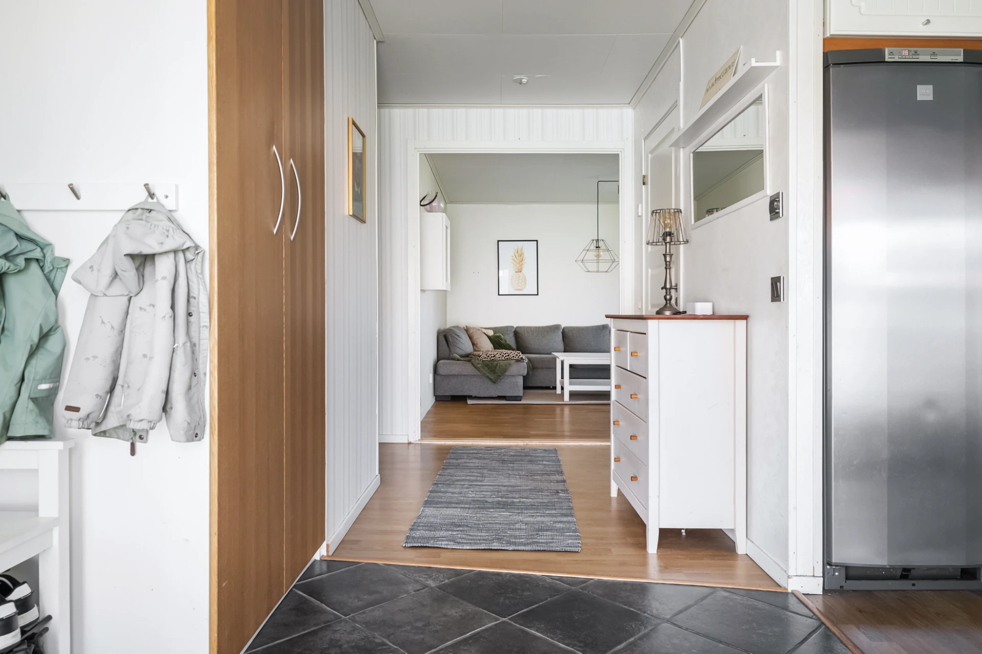 Rymlig hall med gott om plats för ytterkläder och skor. Platsbyggd garderob i hallens början. Praktiskt klinkergolv i grått, ljusa väggar.