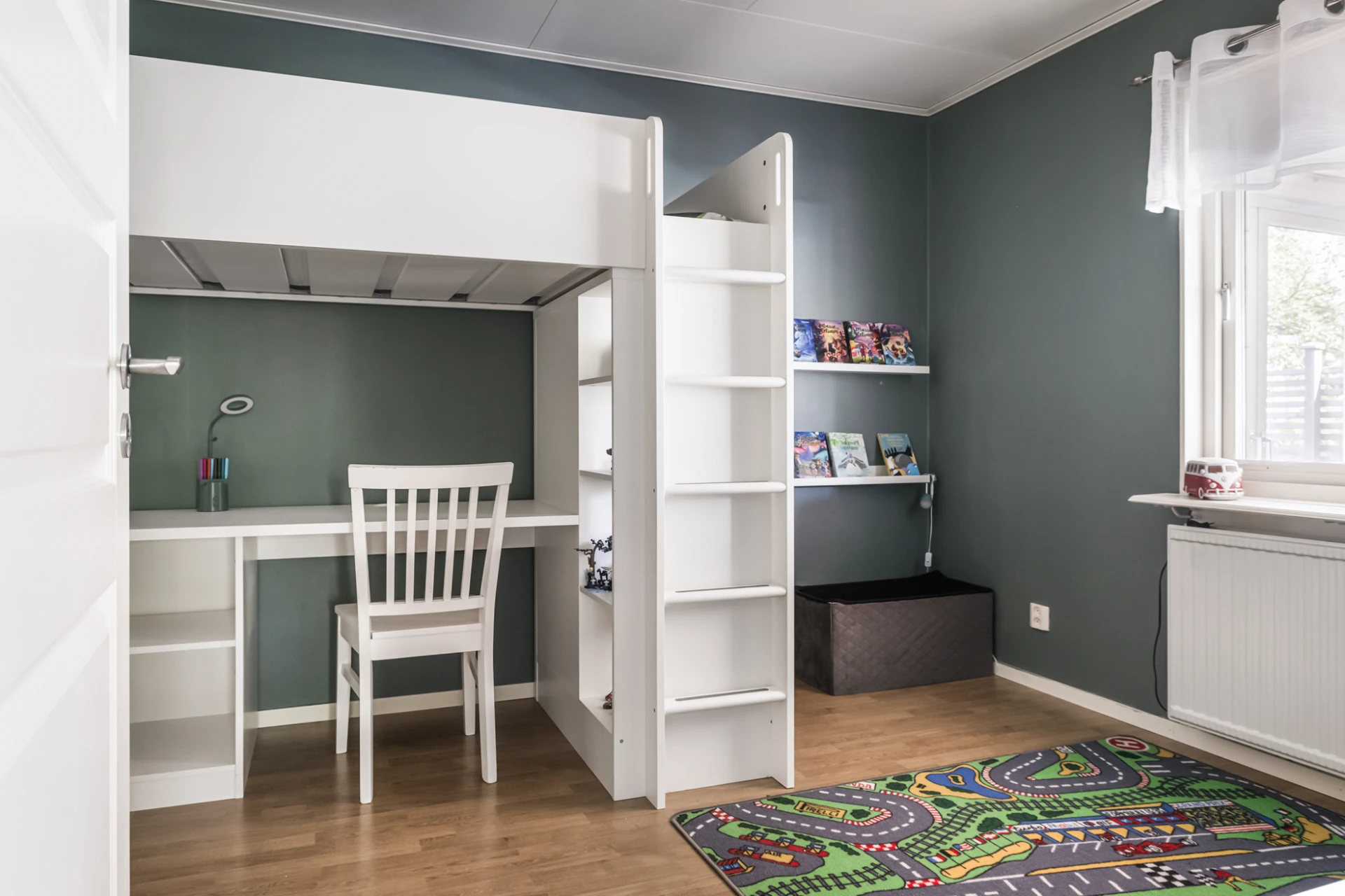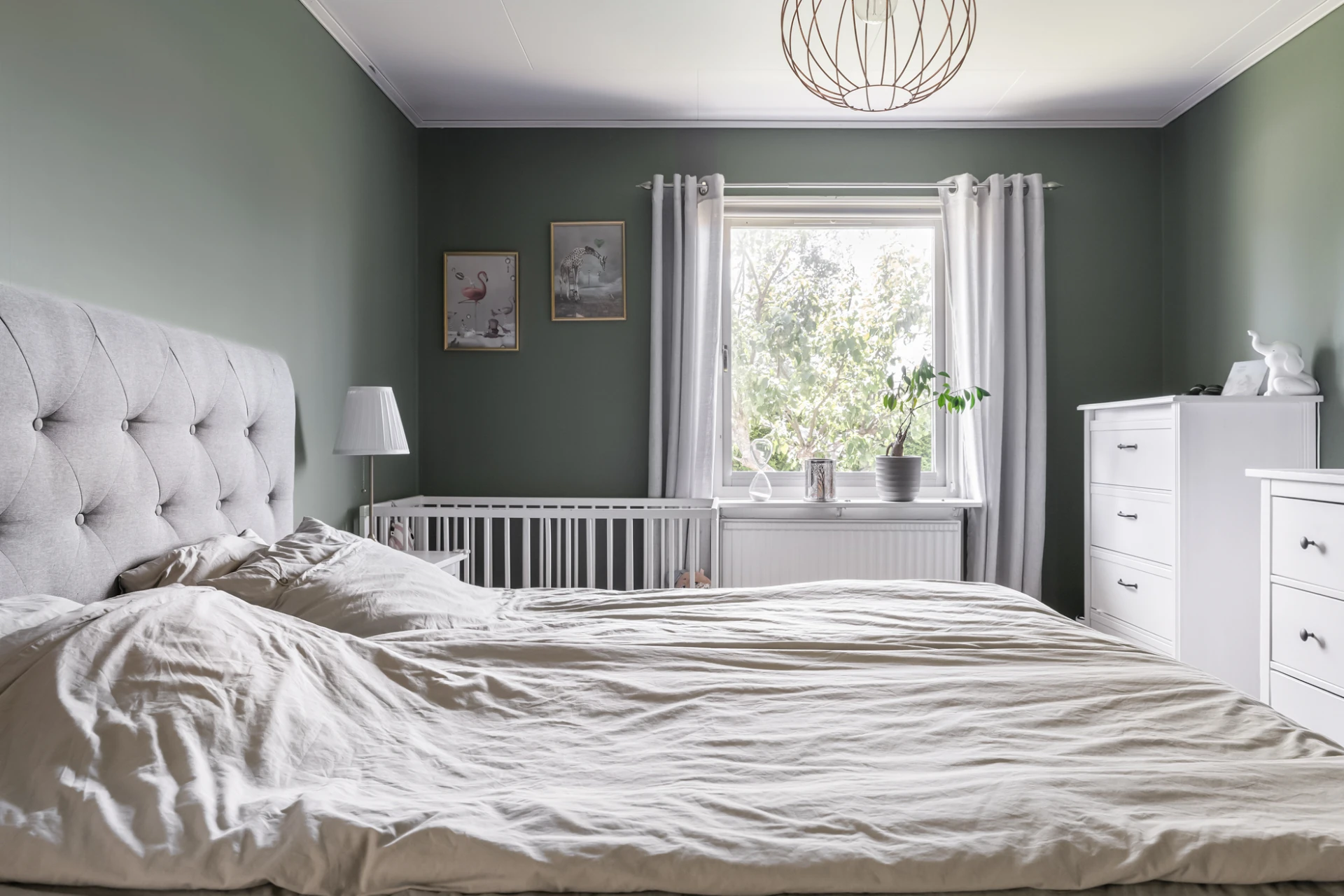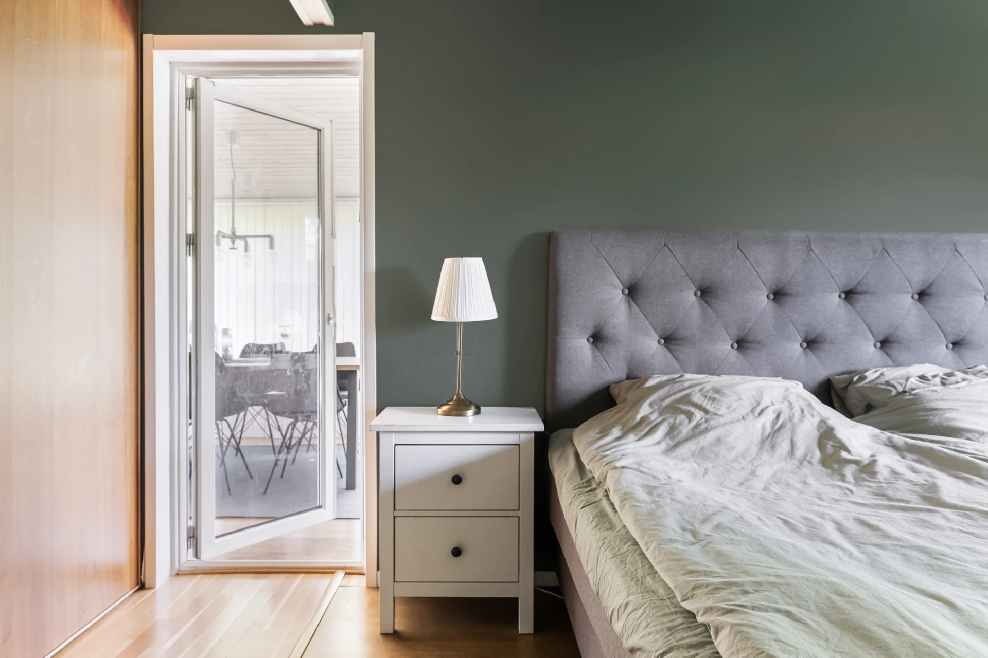 Mysigt sovrum med väggar i dovt grön nyans och ljust laminatgolv.