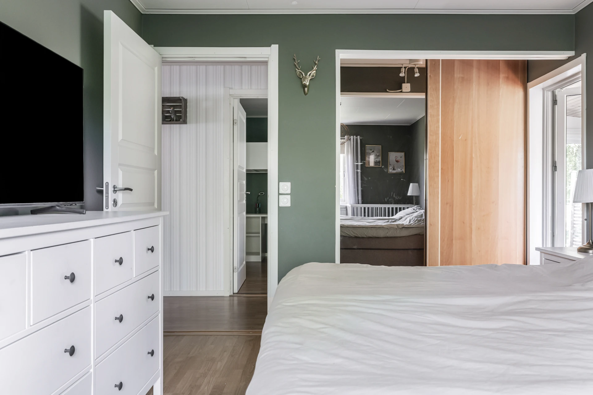 Rogivande sovrum i ljusa färger som bryts av med fondvägg i grönt, vilket passar fint ihop med det ljusa laminatgolvet. Platsbyggd garderob i rummets första del. Från sovrummet når ni det stora uterummet.