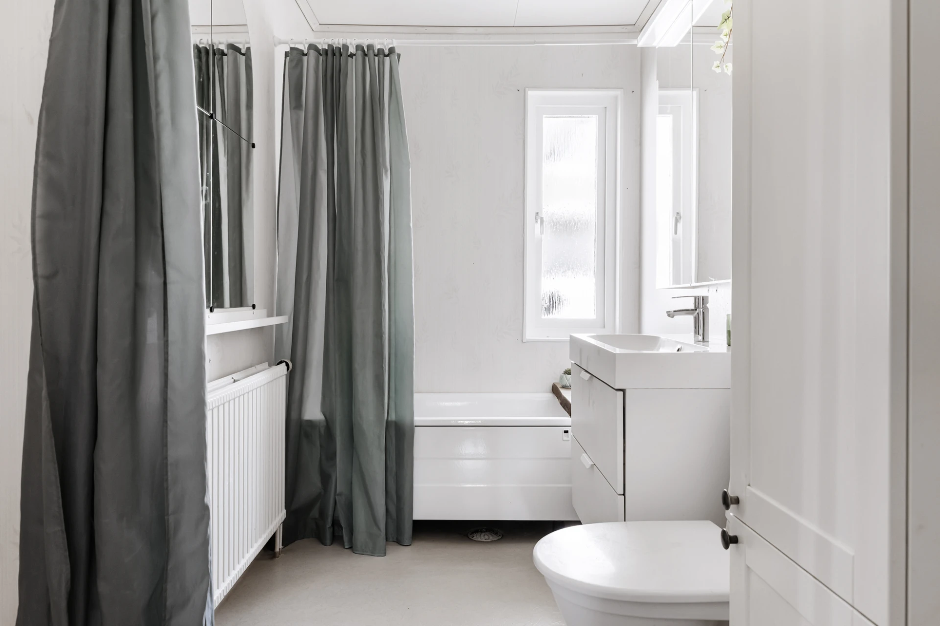 Ljust badrum med våtrumsmatta och väggar i ljusa kulörer som matchar skåp och kommod i vitt. Badrummet är utrustat med badkar, tvättställ med kommod, toalettstol och högskåp.