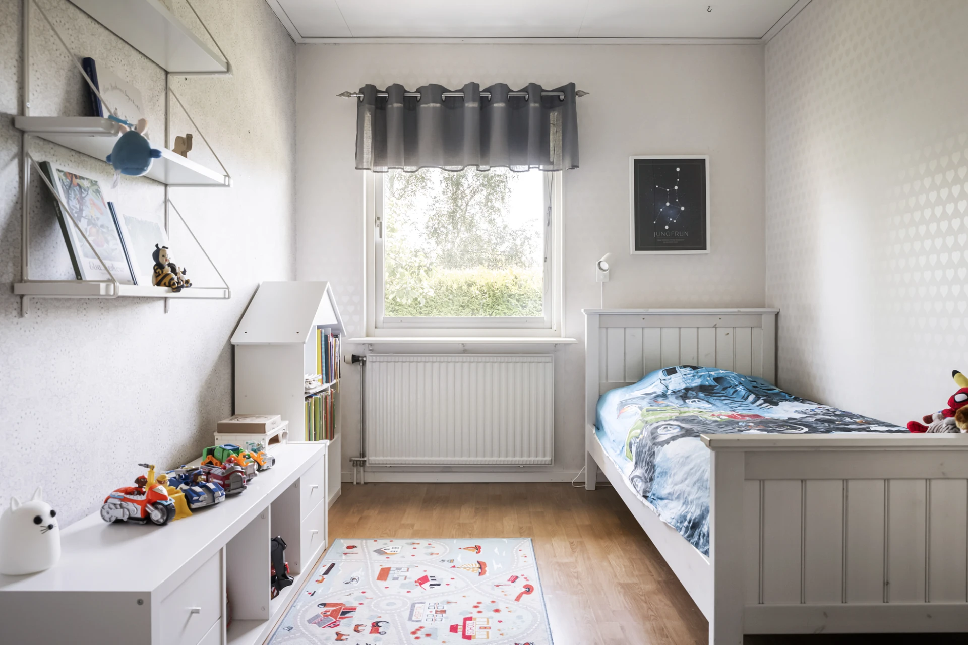 Ljust sovrum med vita väggar och ljust laminatgolv. Här ryms enkelsäng och skrivbord.