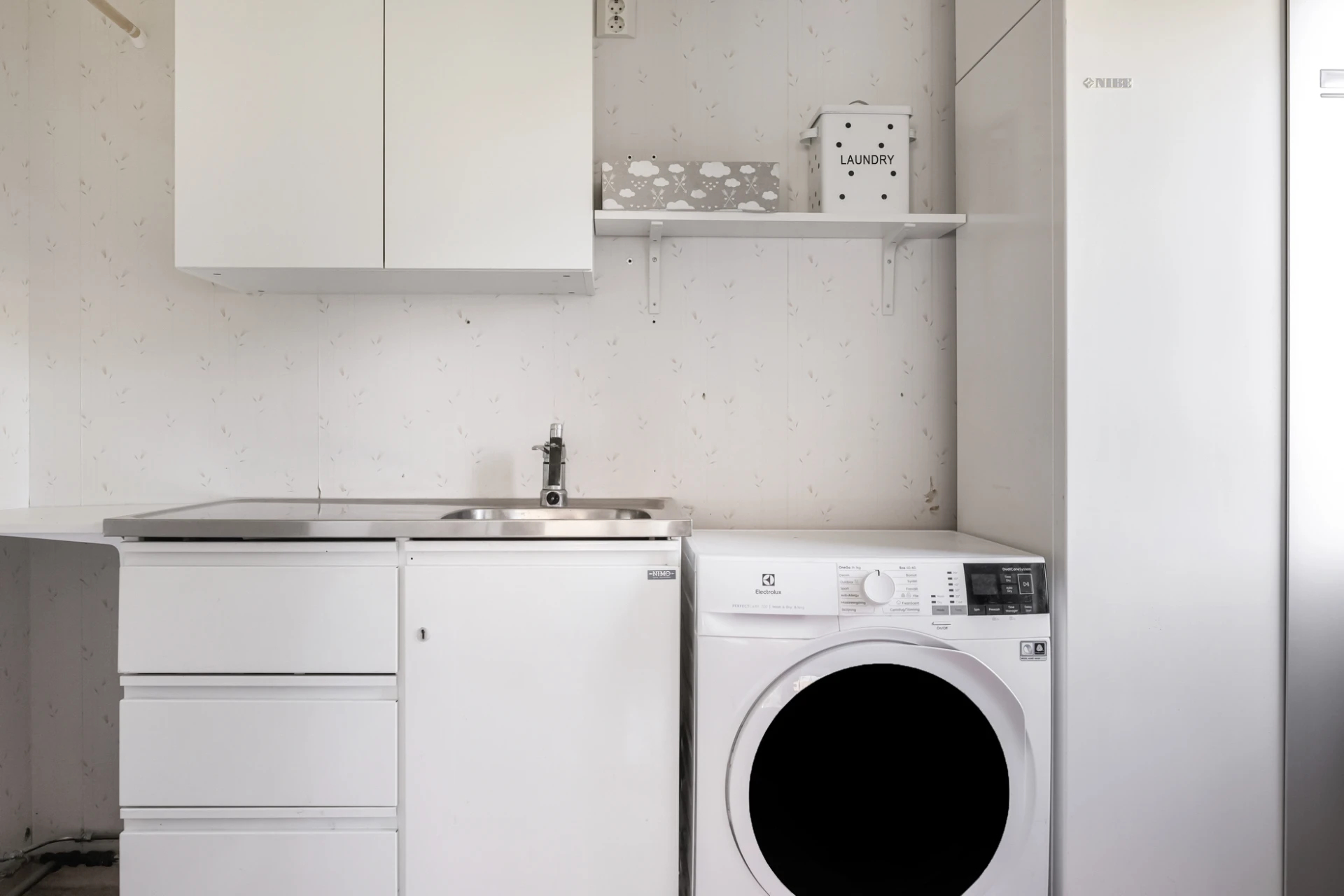 Praktisk tvättstuga i vitt med bra förvaringsutrymmen i skåp och lådor. Här finns kombinerad tvättmaskin med torkfunktion. Vita väggar och ljust golv med våtrumsmatta.