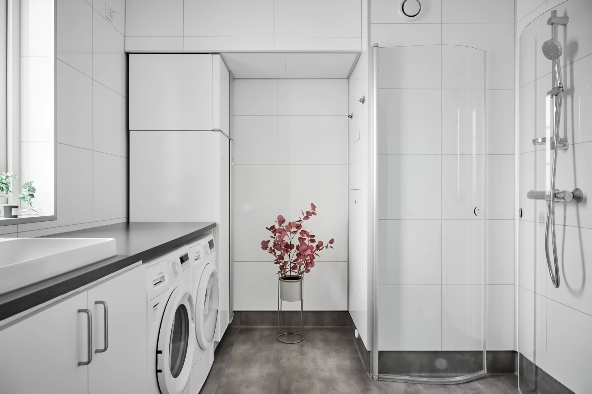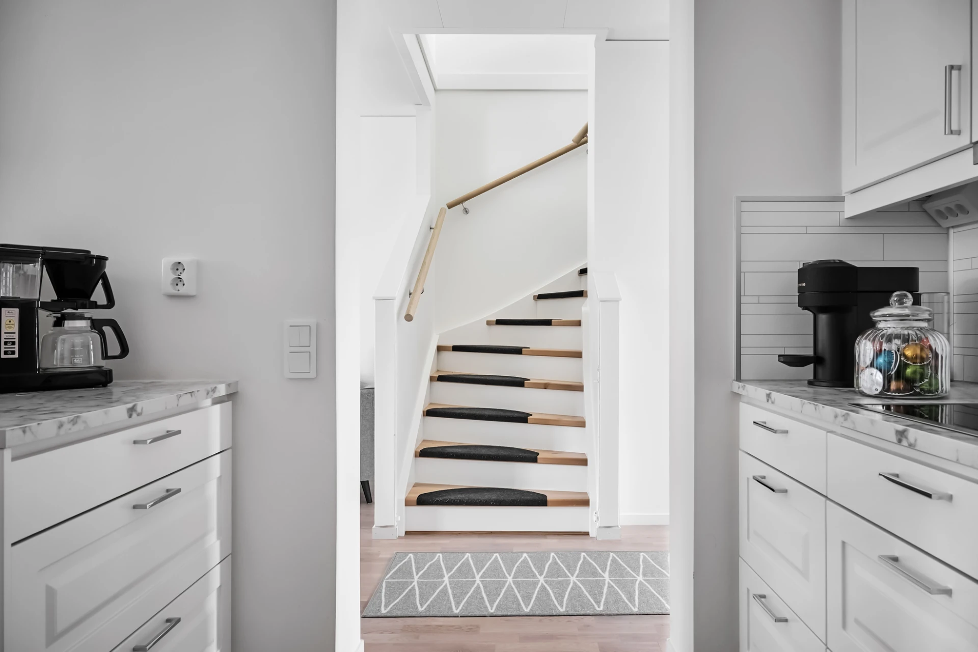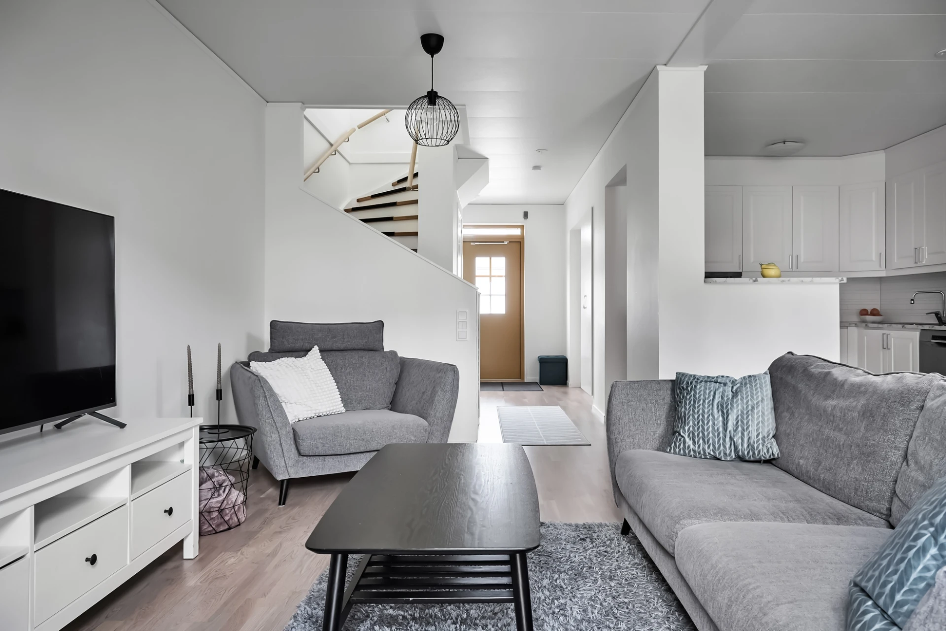 På entréplanet välkomnas du av en ljus och inbjudande atmosfär. Det rymliga vardagsrummet bjuder in till både umgänge och middagar, med plats för en större matgrupp. Köket är modernt och funktionellt med generösa arbetsytor och bra förvaringsmöjligheter – perfekt för den som älskar att laga mat. Här finns även ett stort badrum med en praktisk tvättsektion, vilket gör vardagen smidig och bekväm.