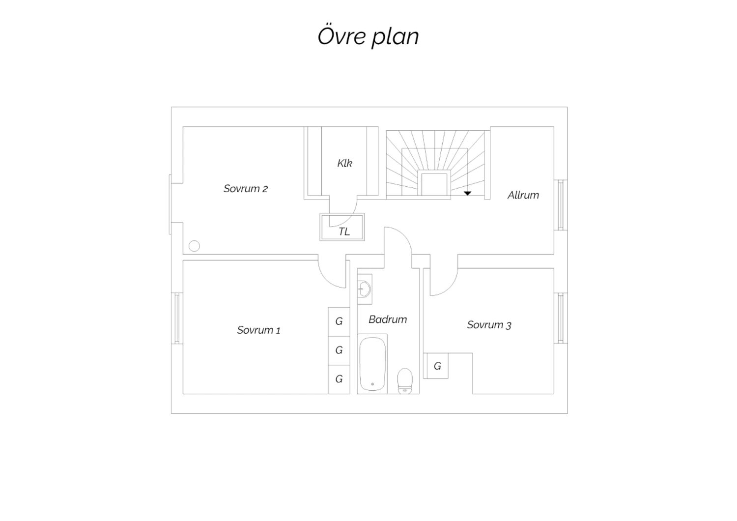 På övre plan möts du av en praktisk och privat sovrumsavdelning med tre bra sovrum, där alla erbjuder goda förvaringsmöjligheter. Här finns även ett allrum som kan användas som tv-rum, lekrum eller hemmakontor – en flexibel yta som kan anpassas efter dina behov. Det andra badrummet på detta plan gör morgonrutinerna smidiga för hela familjen.