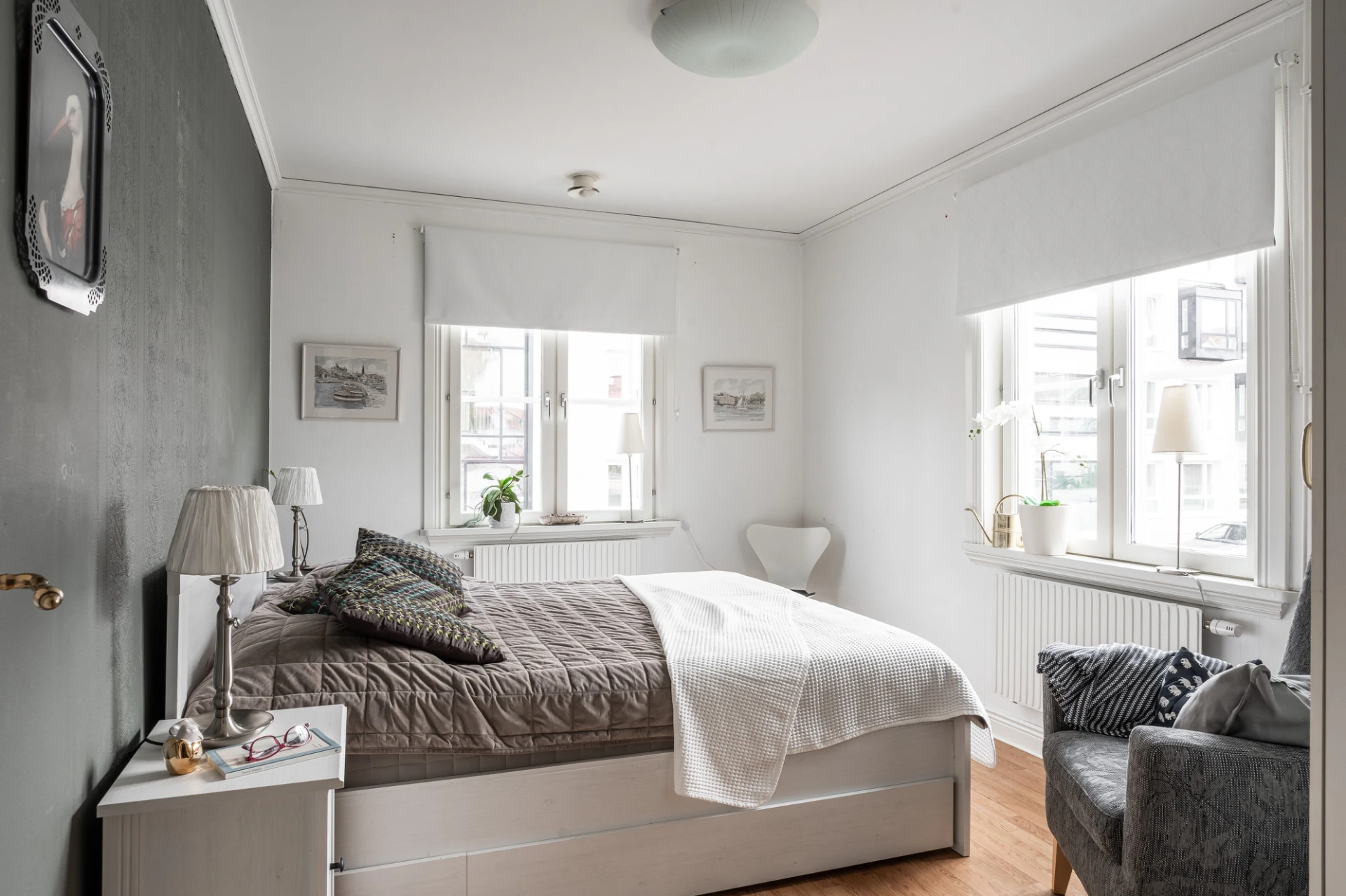 Rakt fram från hallen finns lägenhetens andra sovrum, som i dagsläget används som kontor/gästrum. Parkettgolv och vita väggar samt ljusinsläpp från fönster i två väderstreck. Utrustat med två garderober.