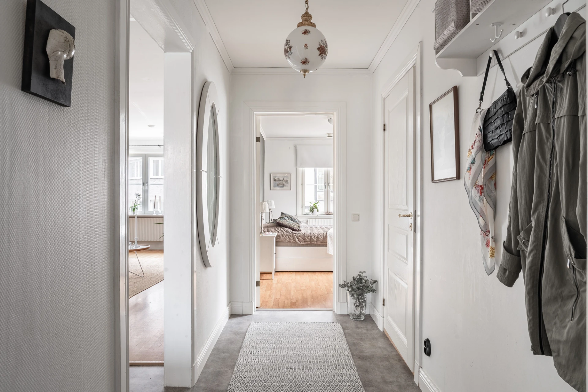 Från innergården kommer vi in till trapphuset där man möts av en liten hall med plats för förvaring intill lägenhetsdörren. Väl inne i lägenheten finns hall med plats för avhängning på högersidan. Grå plastmatta på golvet i hallen tillsammans med vita väggar.