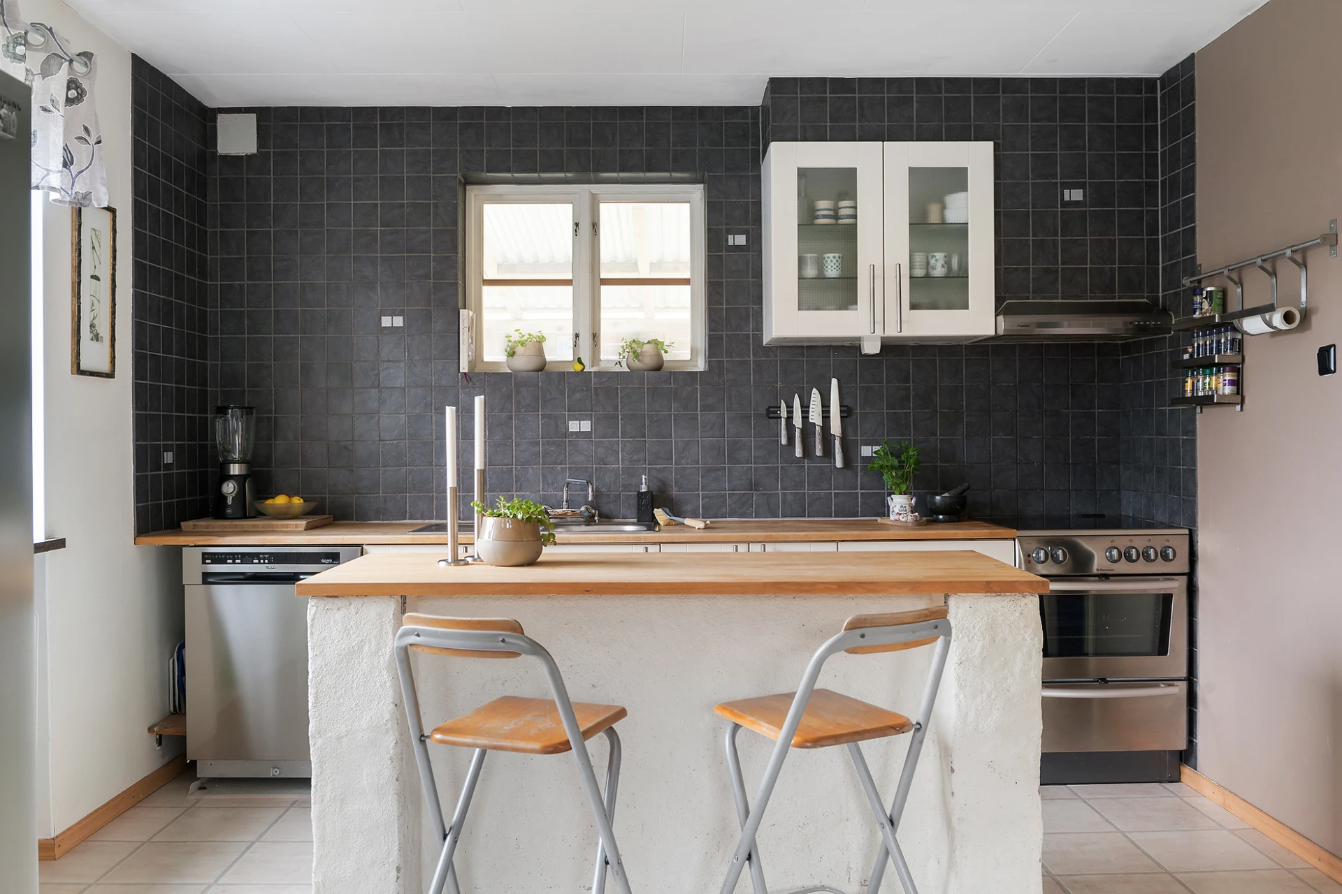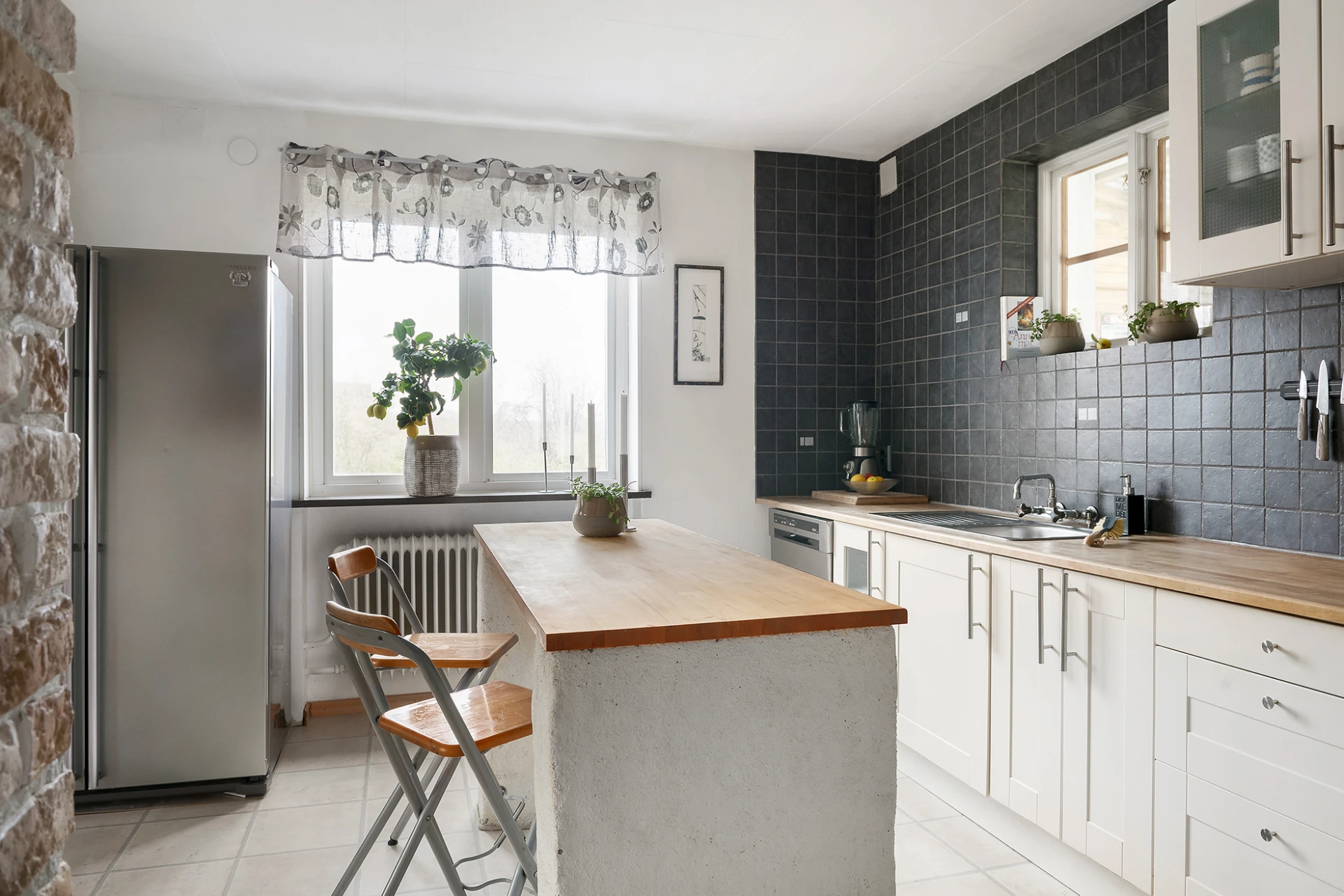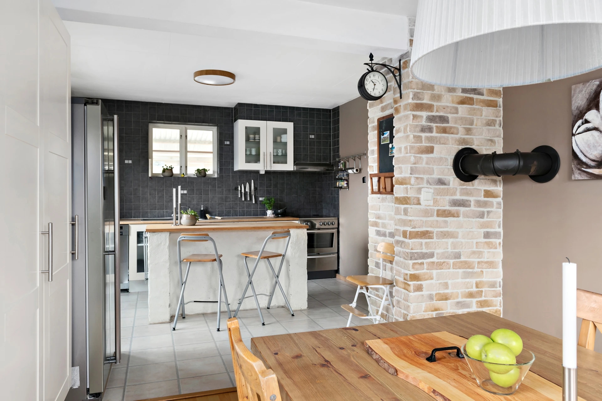 2015- Kaklat väggar i kök. Klätt in skorsten med tegel. Öppnat upp mellan kök och matsal, installerat en balk i taket för avväxling.