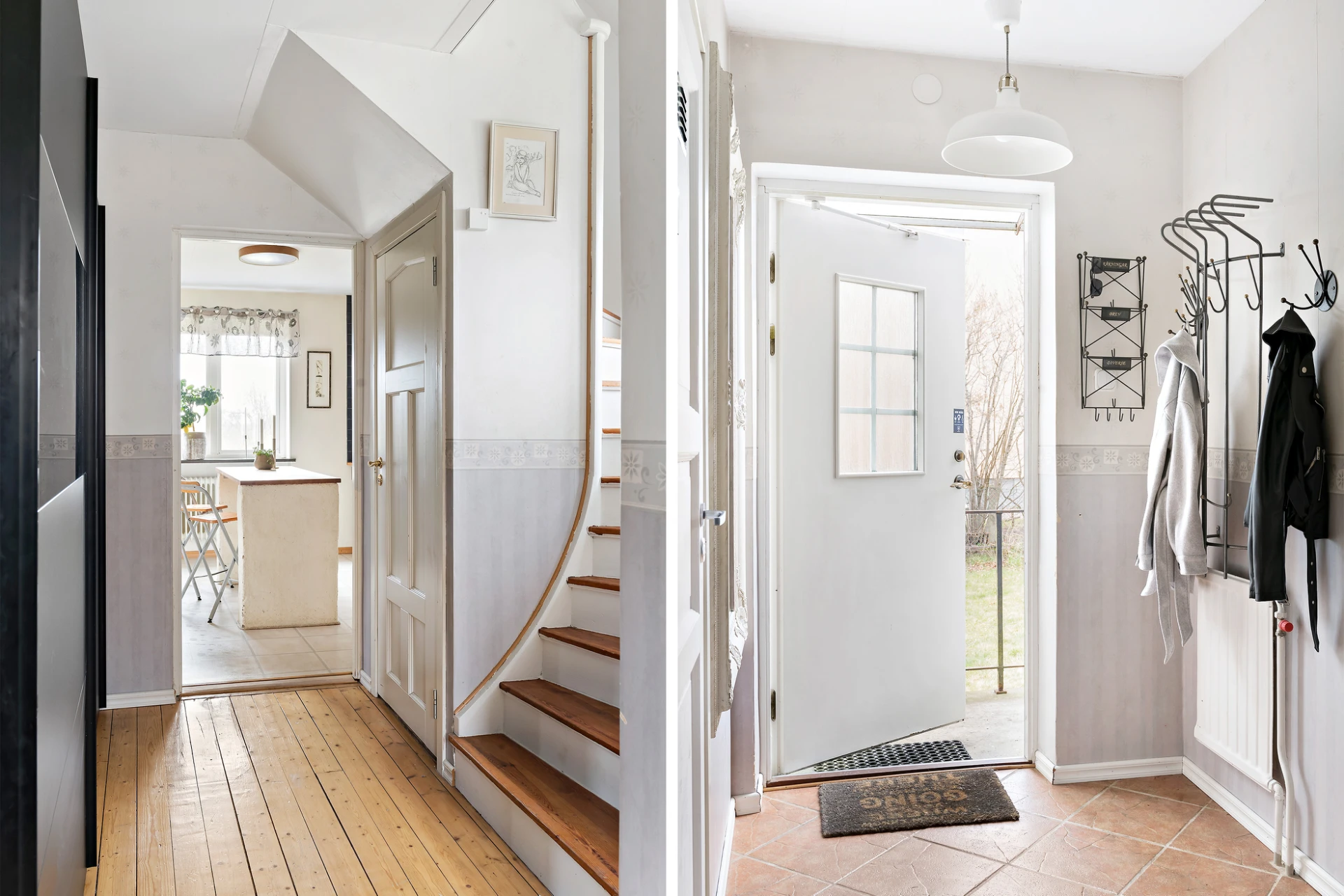 Ljus och välkomnande hall med instegsklinker direkt innanför ytterdörren som sedan övergår i ett furugolv. Väggarna är målade i en ljus grå nyans.