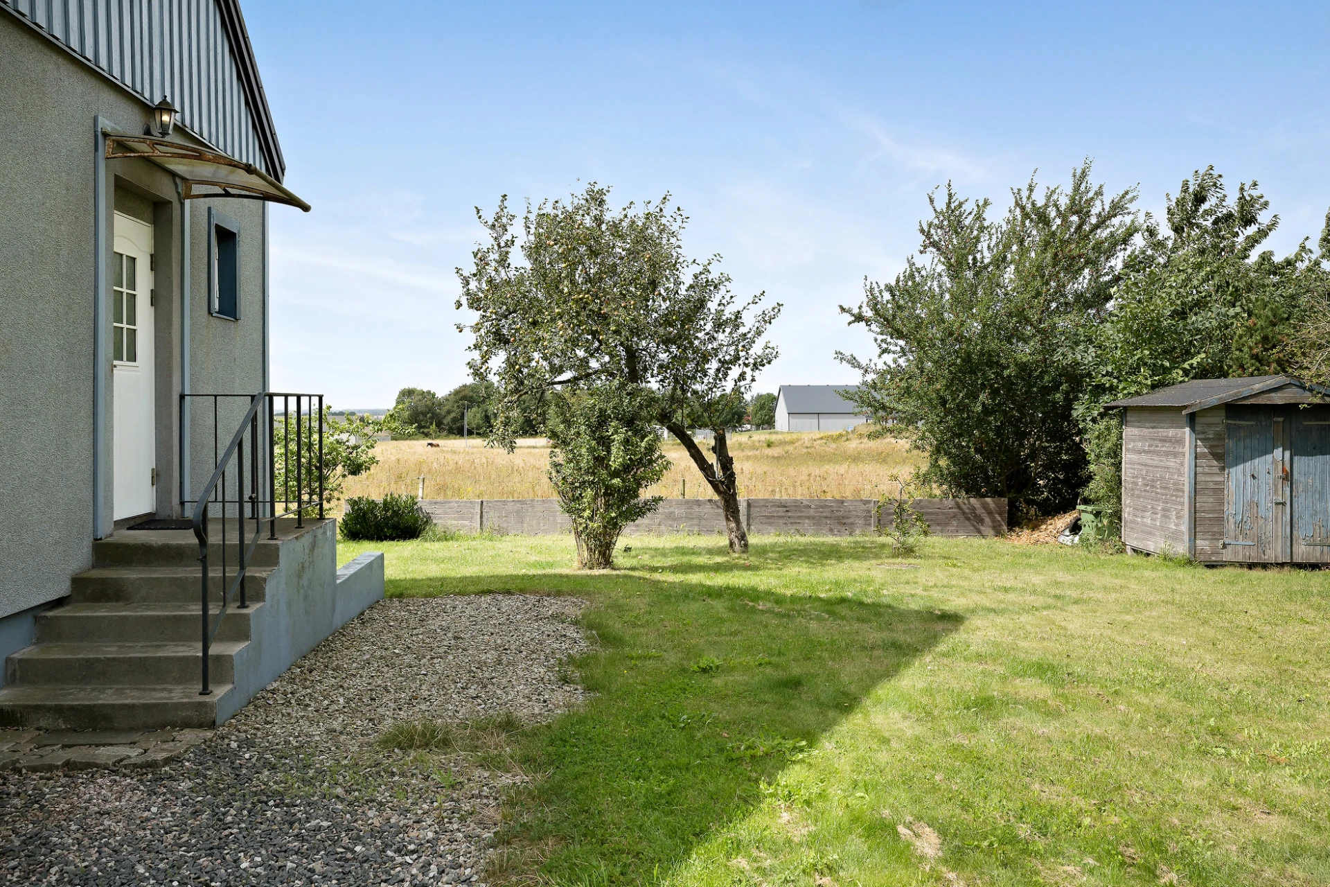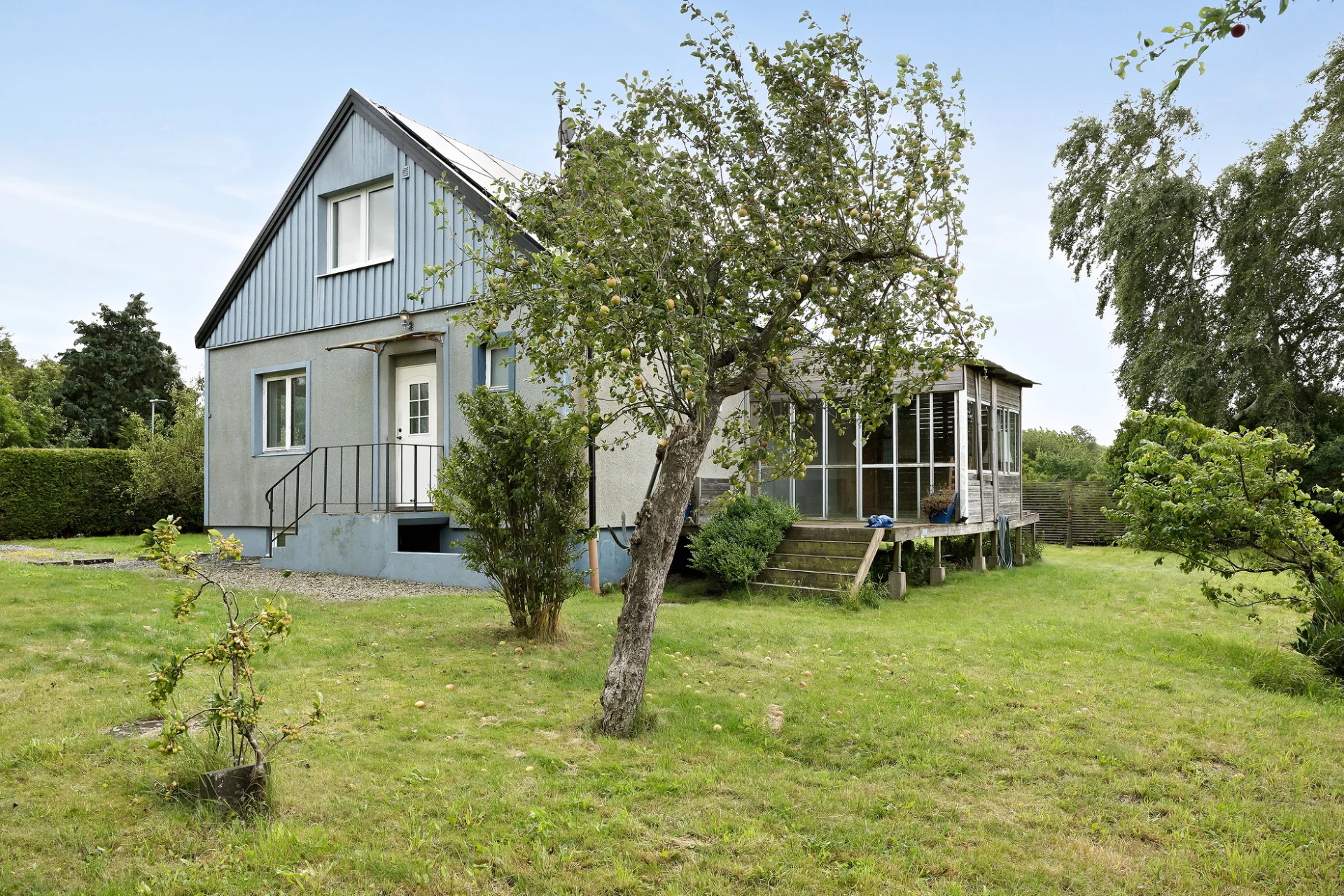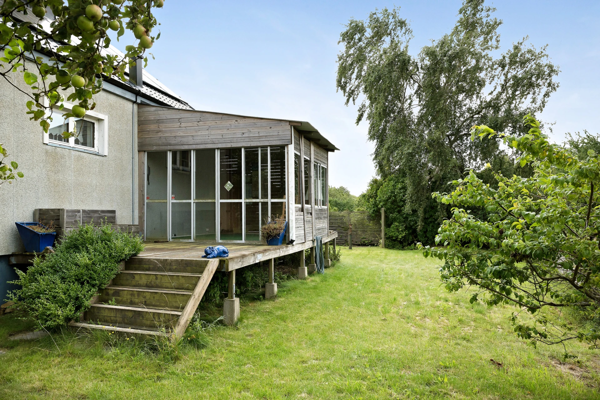 Tomtbeskrivning: Lättskött trädgård med gräsmatta och flertalet fruktträd så som äpple, päron och plommon.