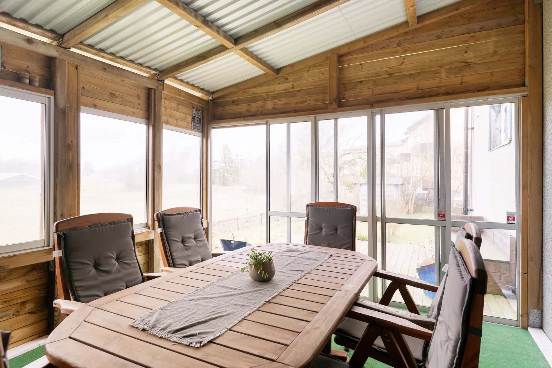 Beskrivning uteplats: Trevlig uteplats i västerläge där man kan se solen sänka sig ner över öppna hagar och fält. Uteplatsen är delvis inbyggd med skjutdörrar och tak.
