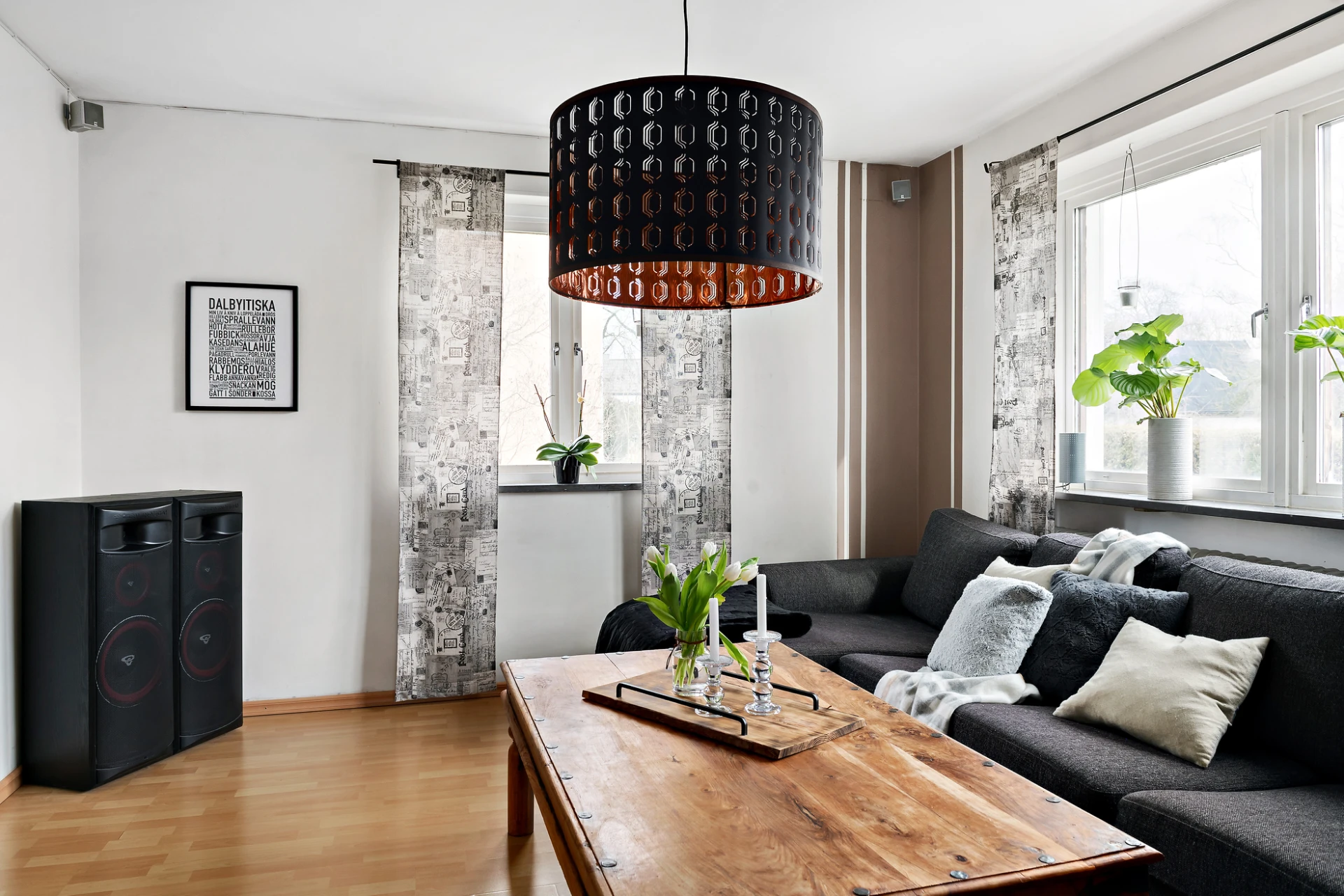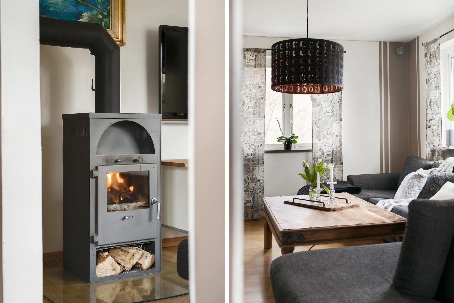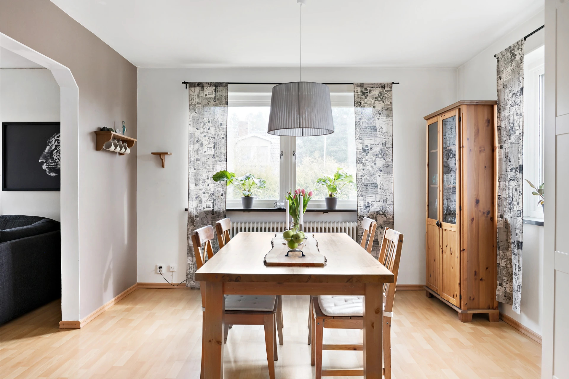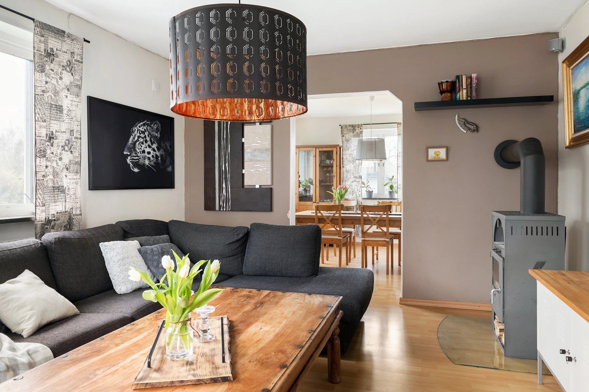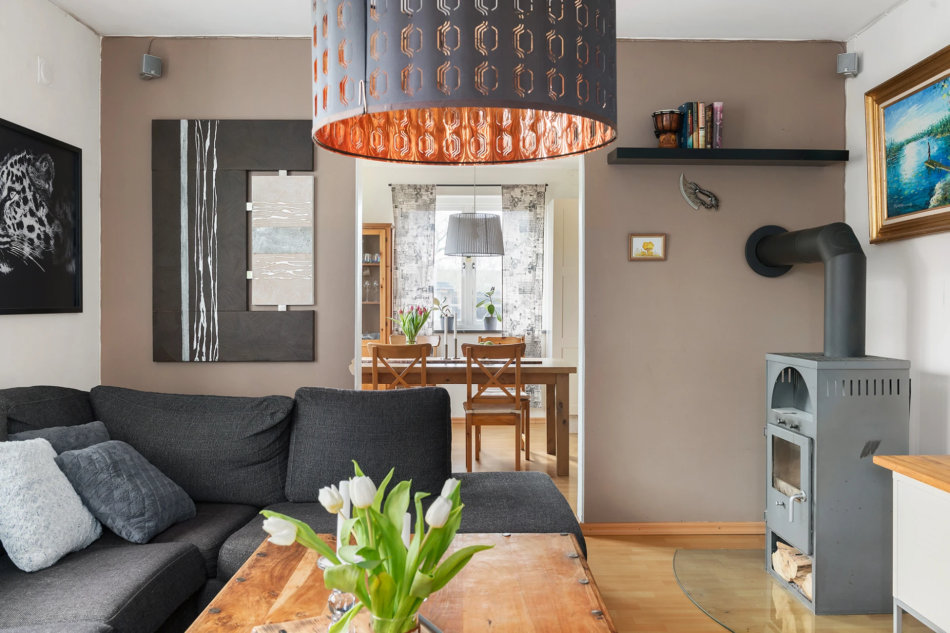 Härliga sällskapsytor som består av vardagsrum och matplats i fil. Stora fönsterpartier skapar en trevlig funkiskänsla och ger ett fint ljusflöde. På golvet ligger ett bokfärgat laminat och väggarna är vitmålade med caffelatte-färgade fonder som bryter av. I vardagsrummet står en braskamin.