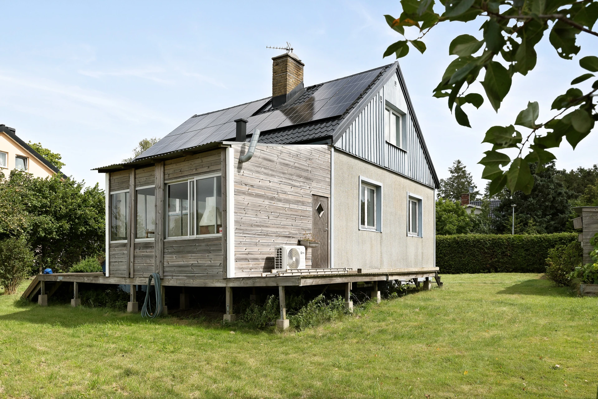 2021- Nyte av yttertak med ny papp, läkt samt plåt. Hängrännor och stuprör är bytta och nya markledningar från stuprören är lagda i plast. Ny plåt på kupa. Byggt in en del av uteplatsen och satt skjutpartier.