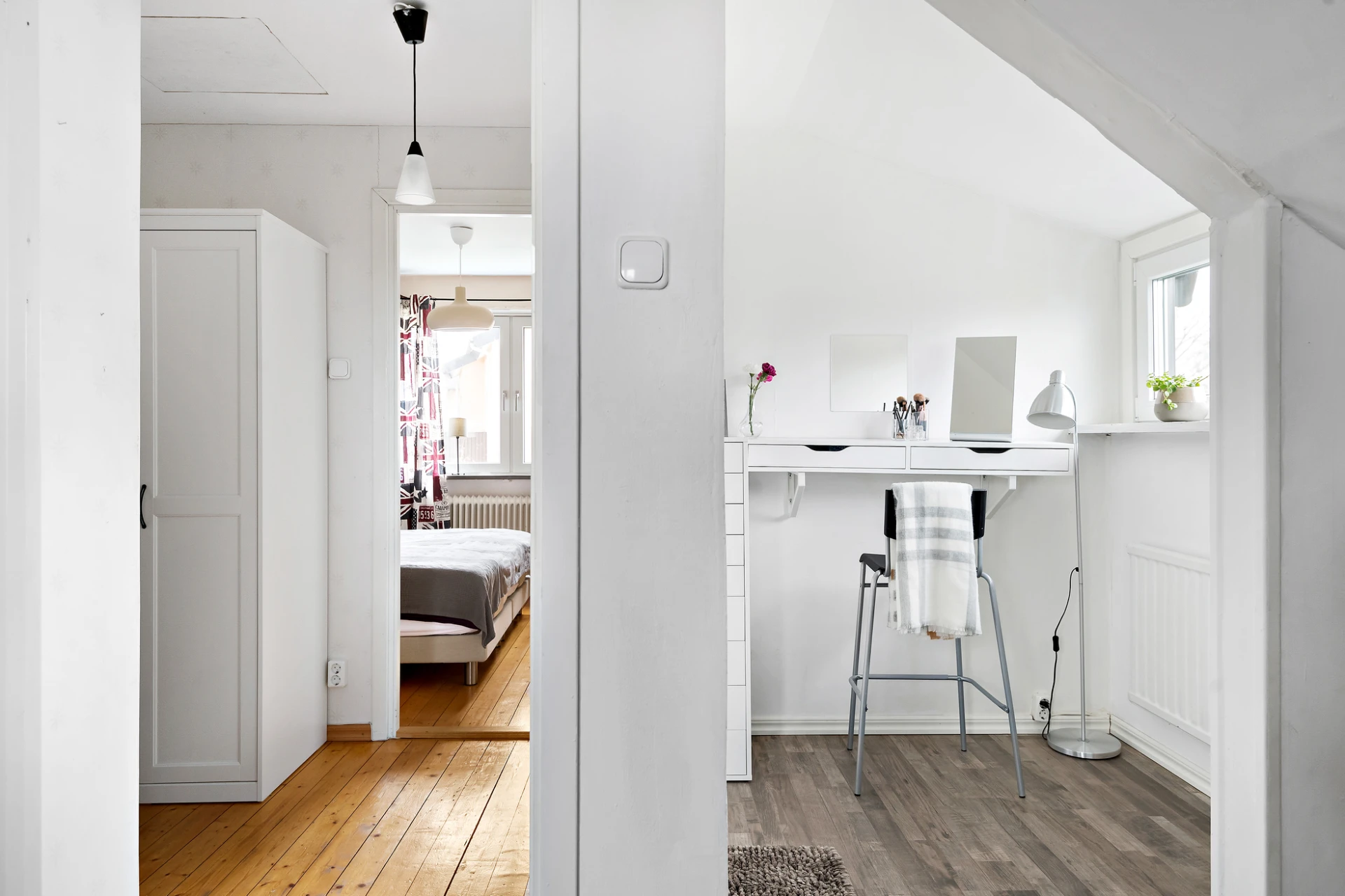 En trappa upp finner man två rymliga sovrum, belägna i varsin gavel av huset. Det ena sovrummet har en ljus tapet på väggarna och furugolv. Det andra sovrummet har ett ljusgrått laminalgolv och vitmålade väggar.