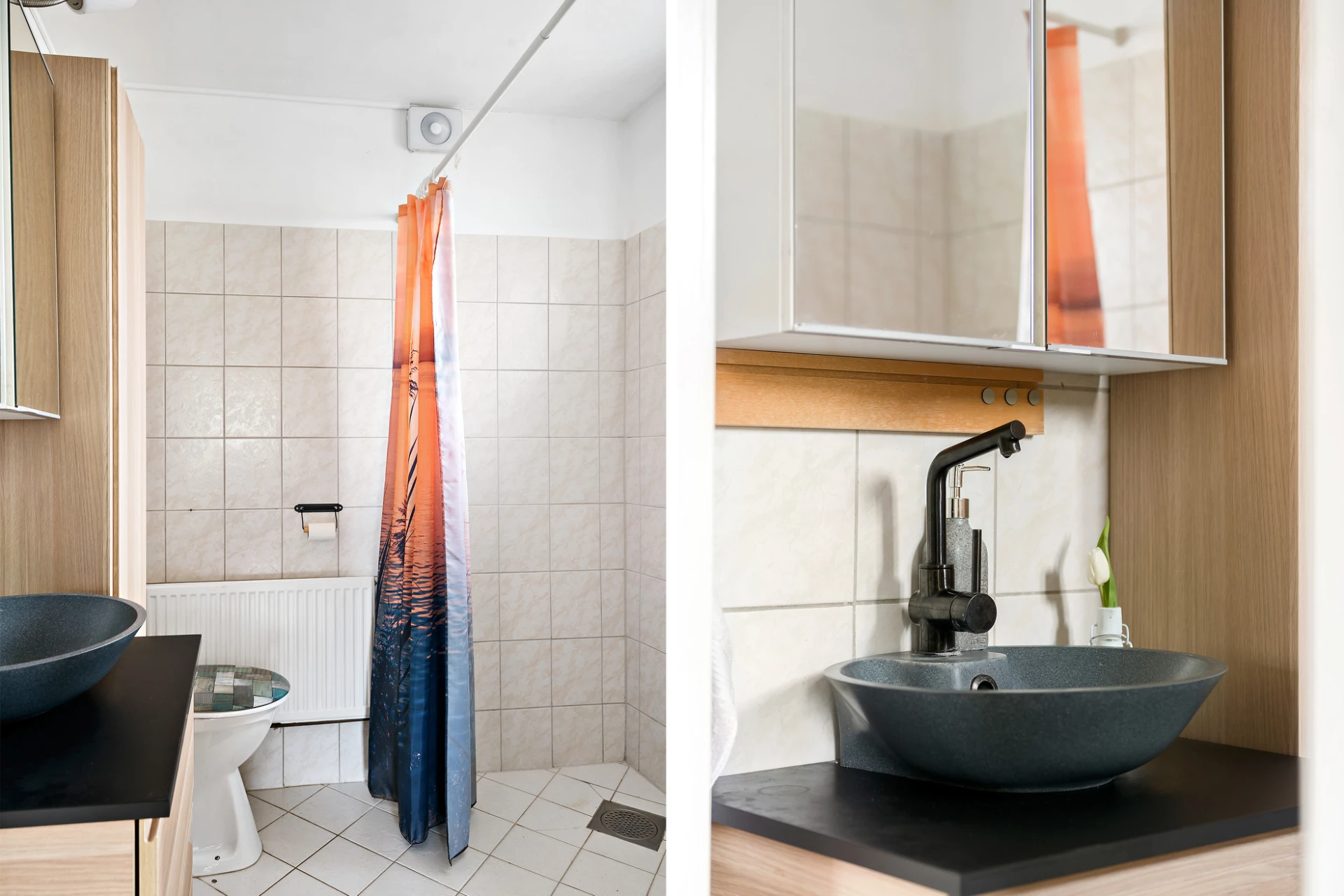 Badrummet är beläget intill hallen. Inrett i ljusa sandfärgade toner med klinkers på golvet och delvis kaklade väggar. Wc, duschhörna samt en tvättställsmöbel med gott om inbyggd förvaring.