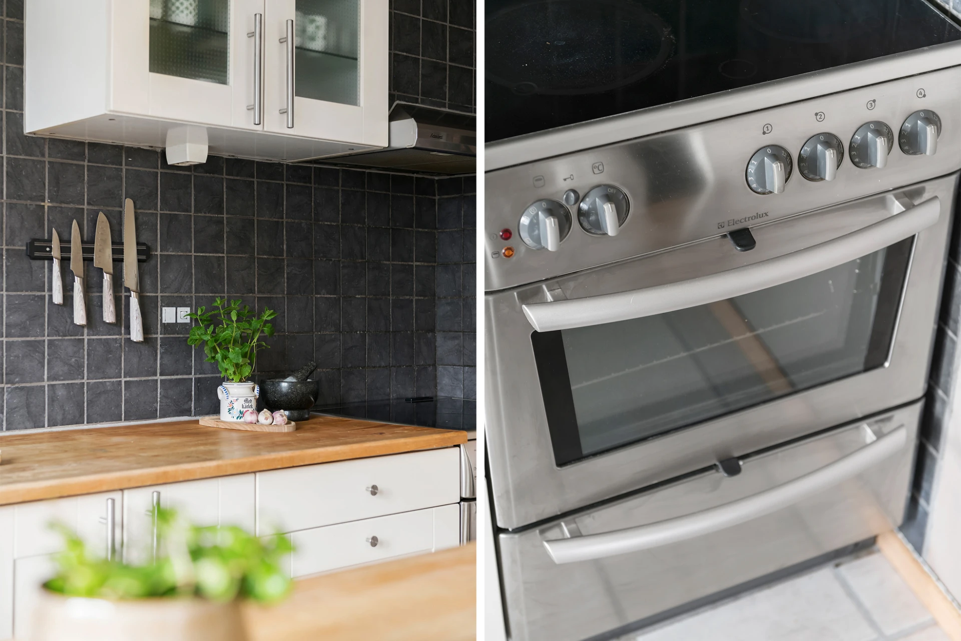 Köket hänger ihop med sällskapsytorna och har öppen planlösning in mot matsalen. Vita köksstommar bryts av med en helkaklad vägg i svart som bildar en snygg kontrast. Köket delas av med en praktisk köksö med barplatser som skapar en smart extra arbetsyta. Köksutrustningen består av kyl och frys från Samsung (2016), spis med häll från Electrolux (2017), diskmaskin från Whirlpool (2017) samt spisfläkt från Admiral.