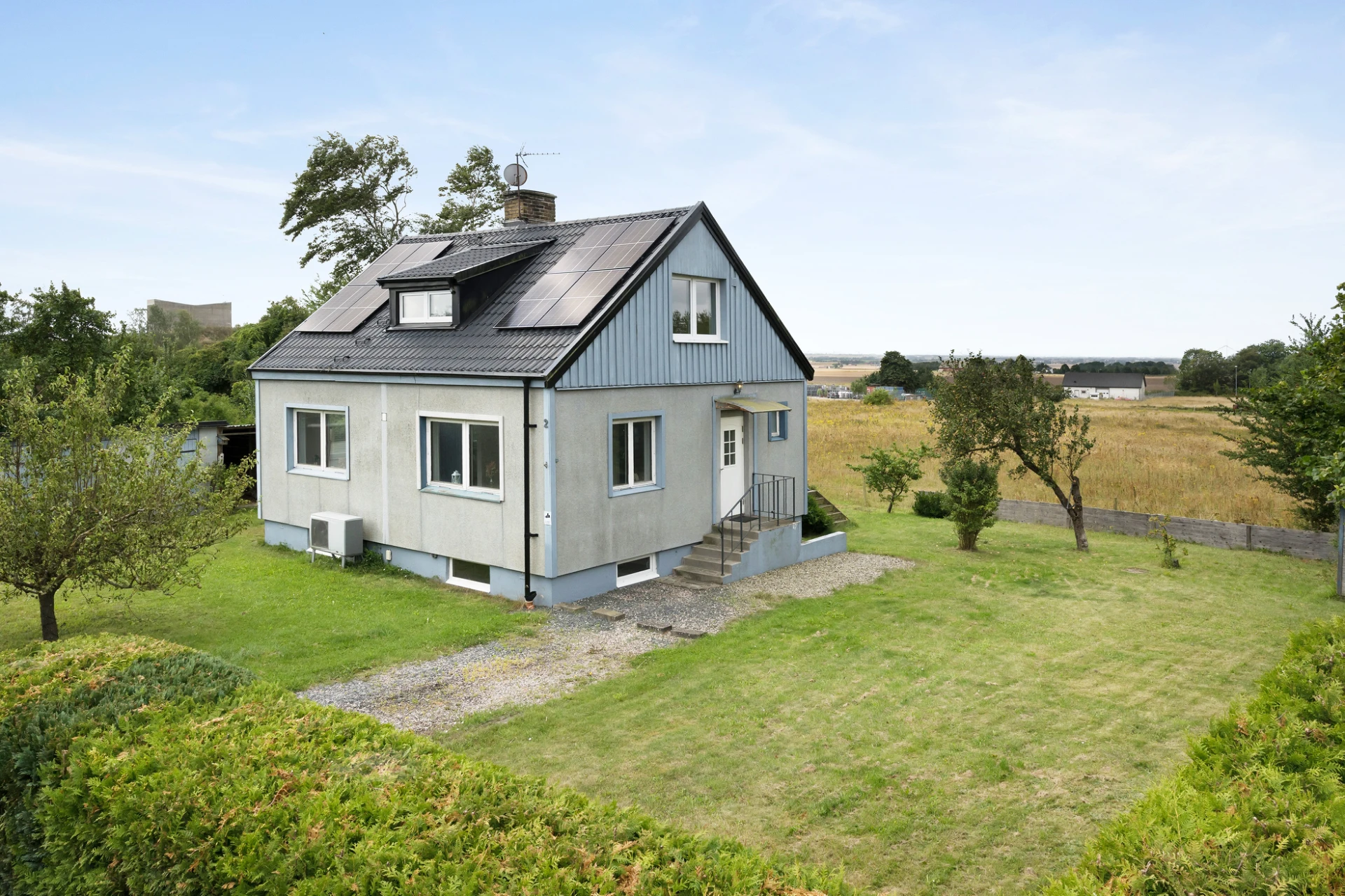 Trevlig friliggande villa med funkiskänsla. Huset är löpande renoverat genom åren med bl a nytt tak, renoverat kök, nya fönster och en nyare värmepump. Under 2023 har ett nytt garage färdigställts, som är isolerat och har 3-fasuttag. Som kronan på verket finns även solceller installerade. Lättskött trädgård med en inbyggd uteplats på baksidan och härligt fri utsikt ut över hästhagar och öppna vidder, klara dagar kan man se Öresundsbron från uteplatsen. Invändigt erbjuder huset ljusa och öppna sällskapsytor som är perfekta för umgänge. En trappa upp har man två rymliga sovrum och i källarvåningen finns massor av praktisk bonusyta att inreda efter behov. Nuvarande ägare har nyttjat ett rum i källaren som extra sovrum. Naturnära läge med gångavstånd till Knivsåsens naturreservat och populära Dalby Stenbrott.
