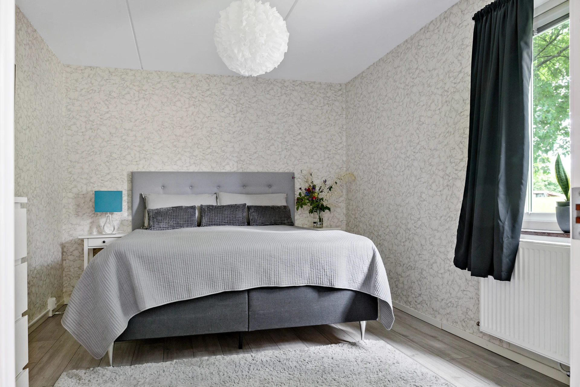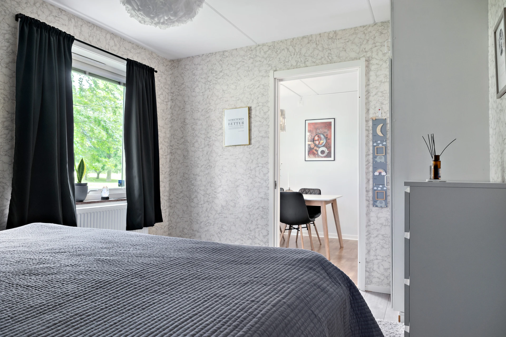 Rymligt sovrum som nås direkt från köket, en lugn och avskild plats i hemmet. Här finns gott om utrymme för en större säng och garderobslösning, vilket skapar både komfort och praktisk förvaring i ett och samma rum.