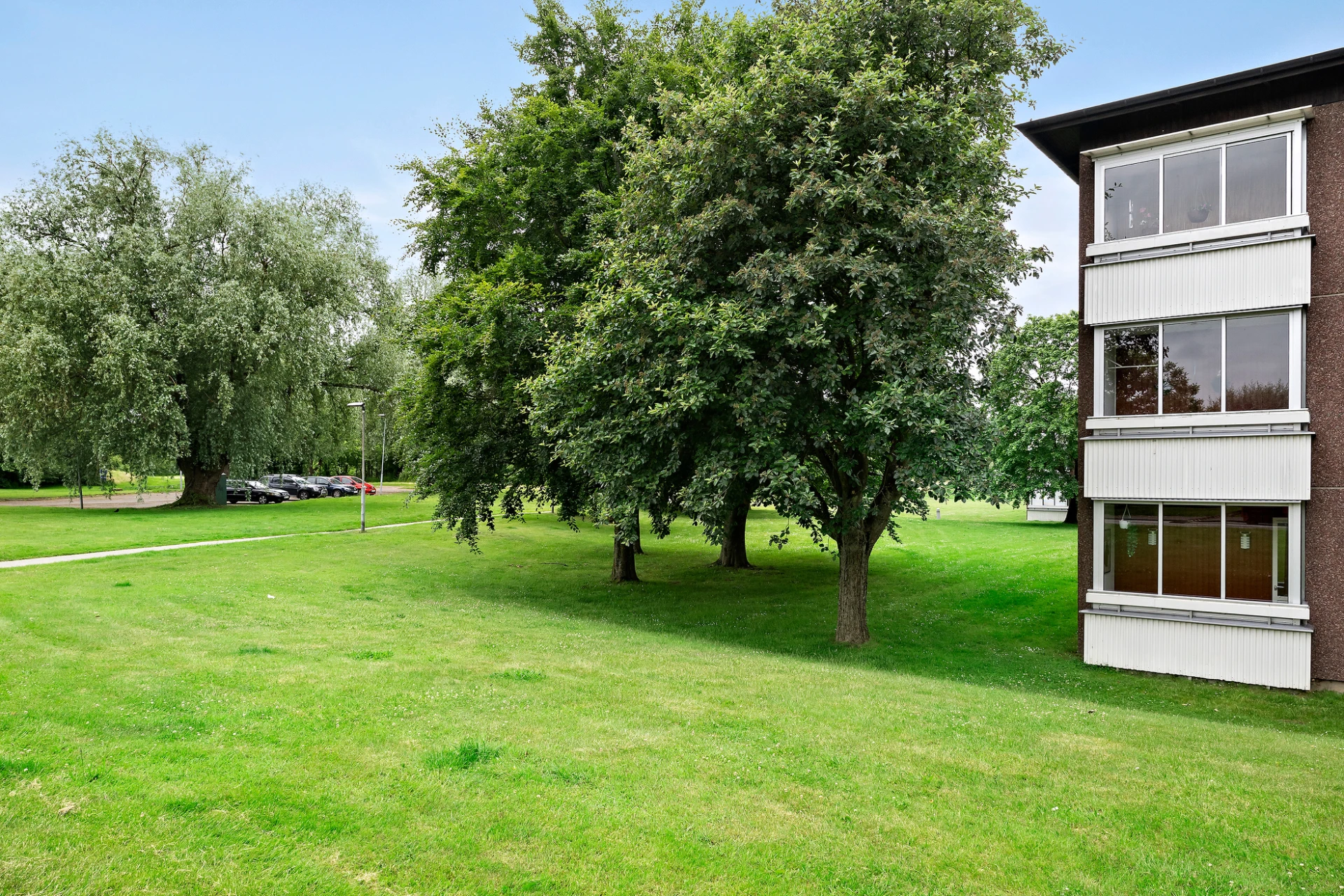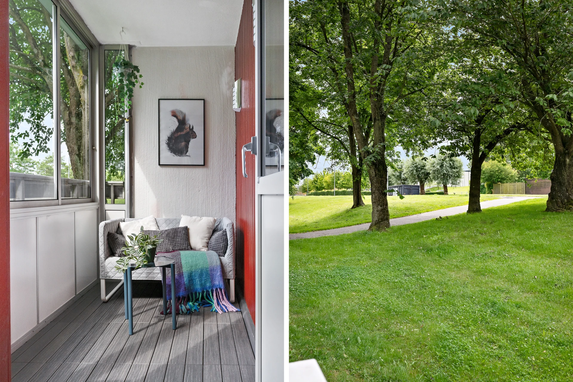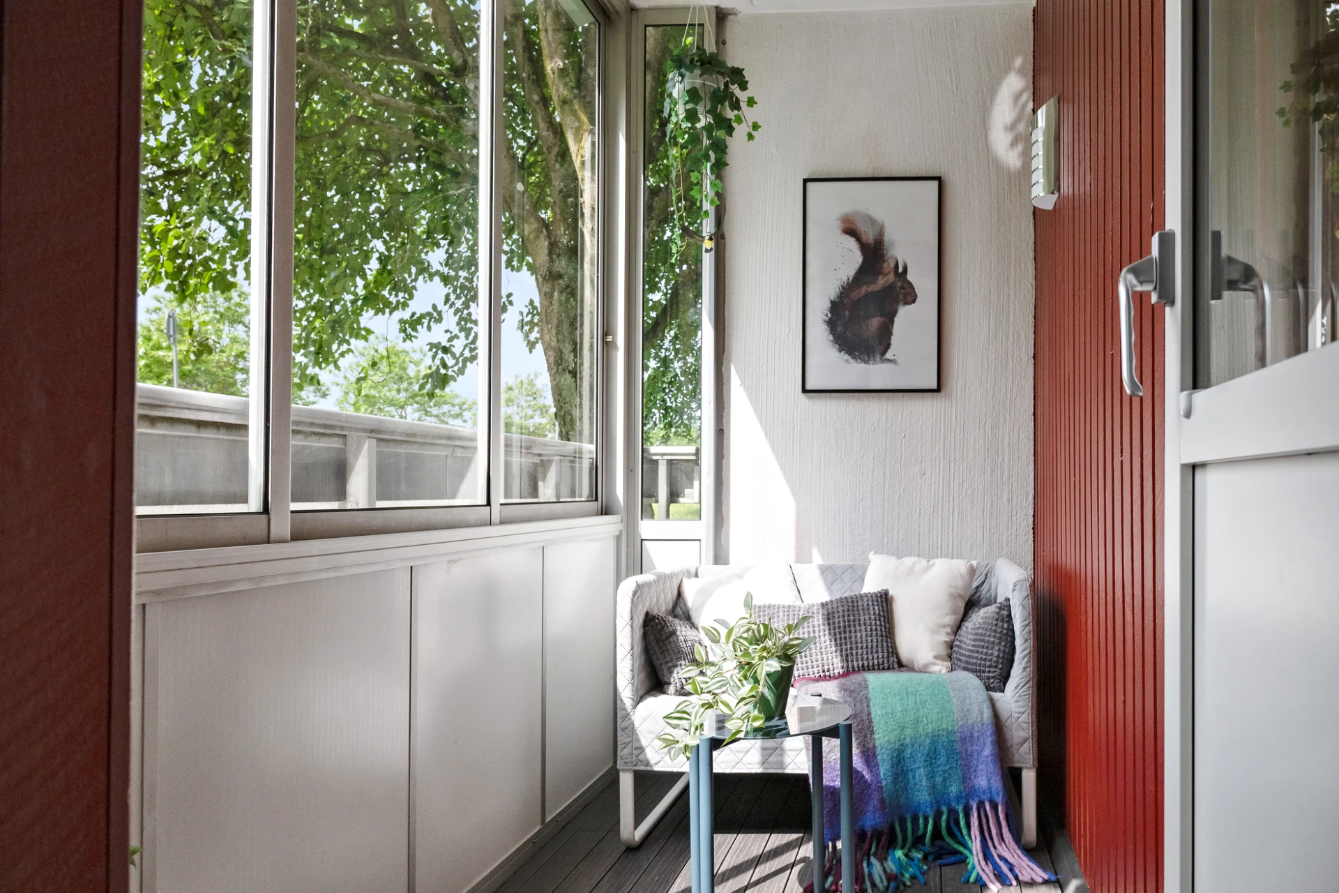 Trevlig inglasad balkong i markplan med fri utsikt över grönområden. En rogivande plats att njuta av morgonkaffet eller en god bok, skyddad från väder och vind men med naturen alldeles intill.