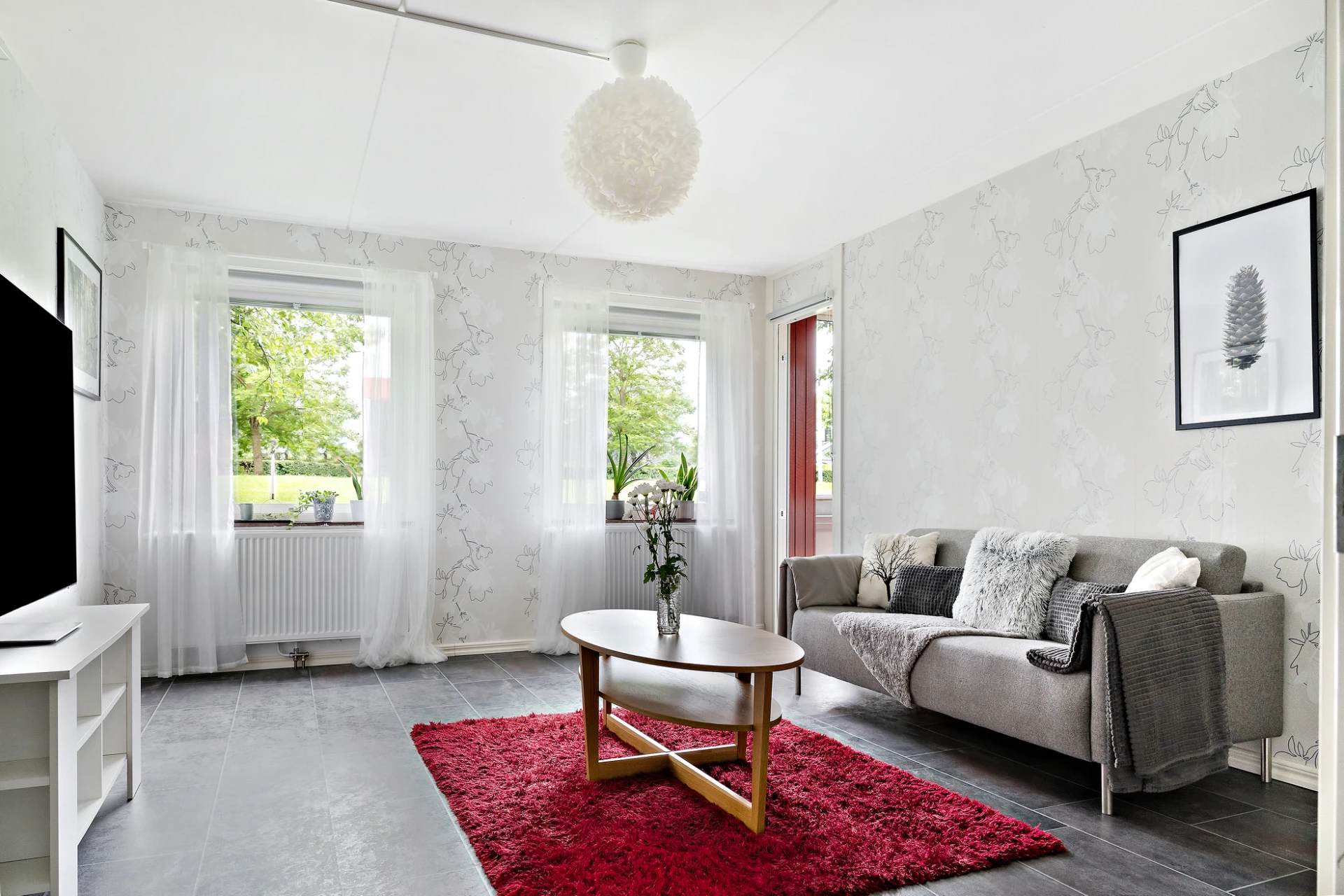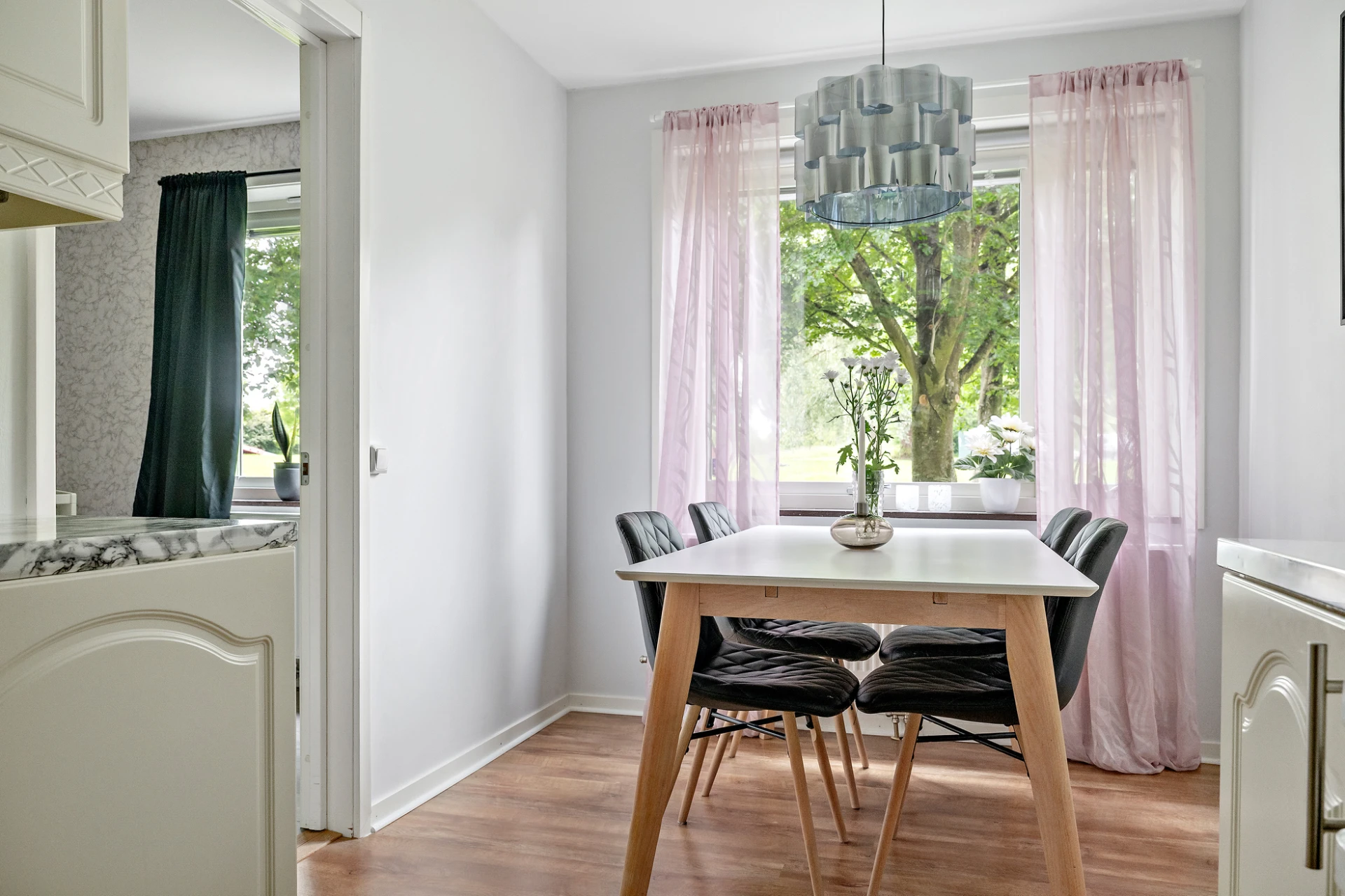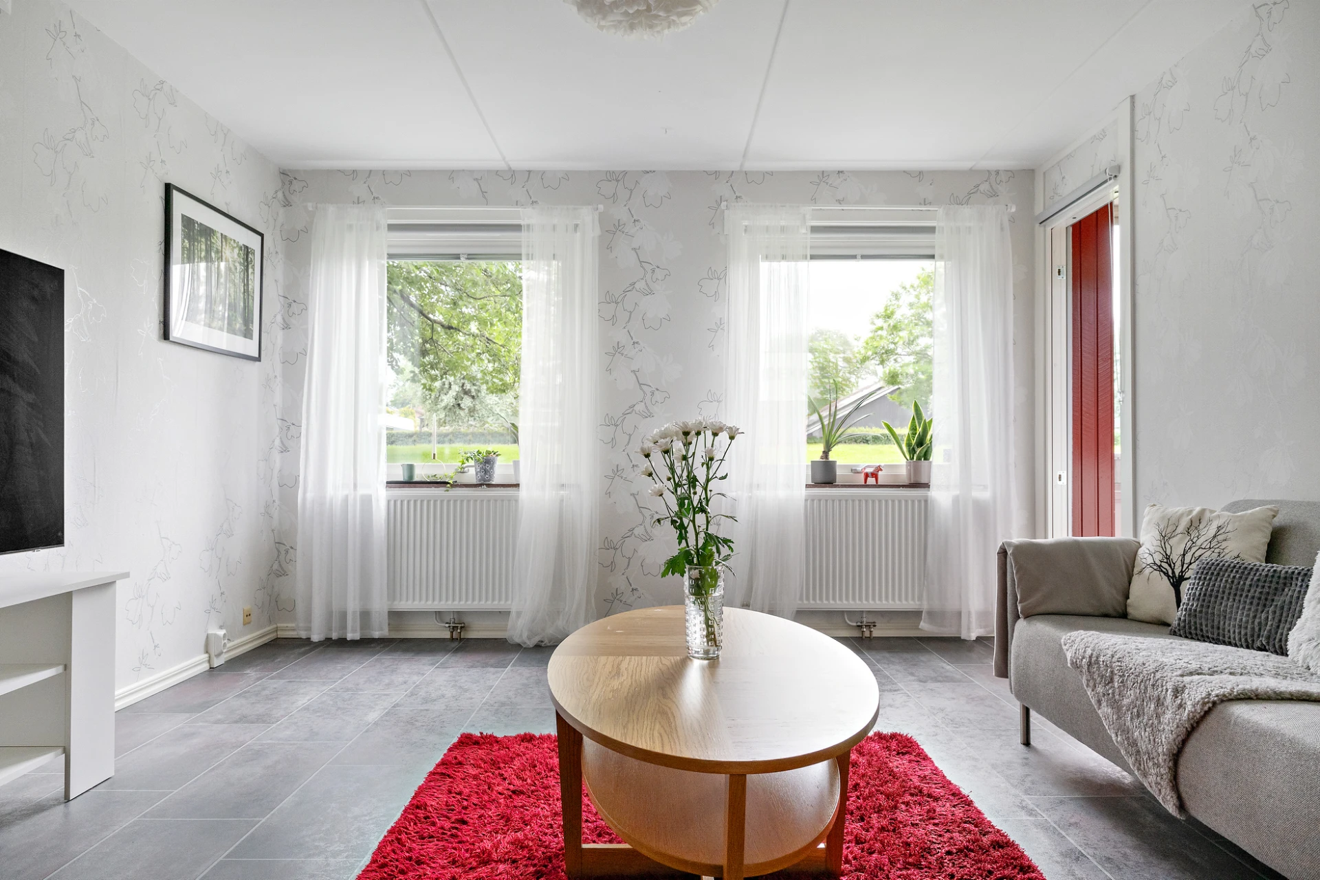 Rymligt och lättmöblerat vardagsrum med stora fönster som släpper in rikligt med ljus. Rummet erbjuder gott om plats för en större, mysig soffgrupp, perfekt för både avkoppling och sociala stunder. Från rummet nås även den inglasade balkongen, en härlig extra yta att njuta av året om.