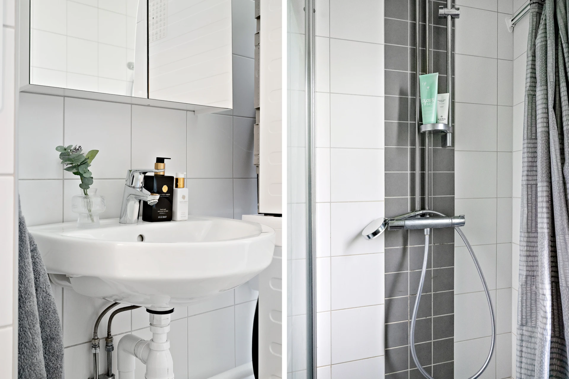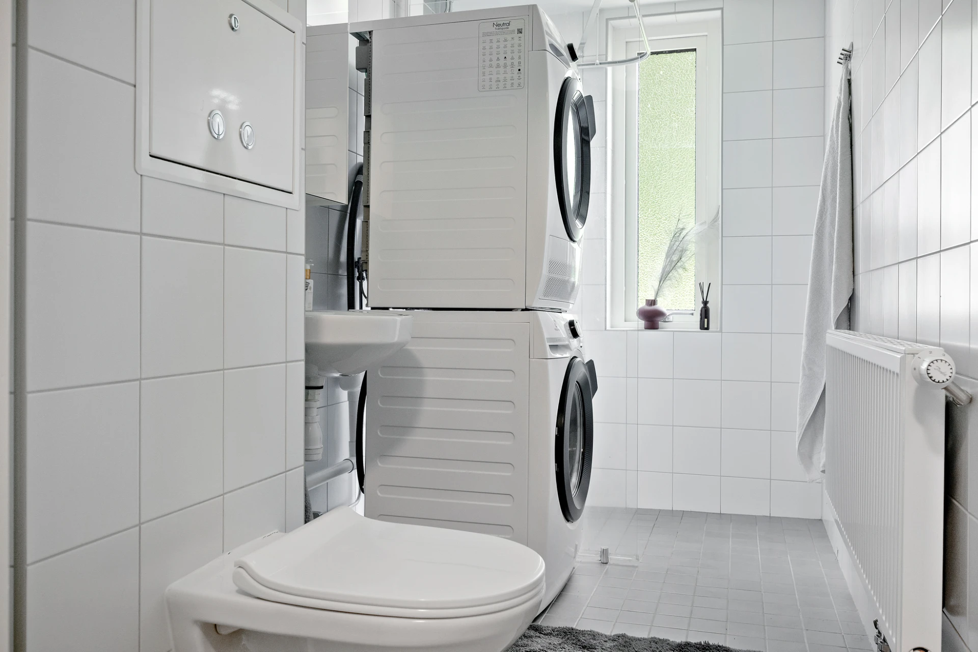 Stilrent och helkaklat badrum i modern design med en genomtänkt och funktionell planlösning. Här finns wc, dusch samt praktisk förvaring för dina badrumsartiklar. För en extra behaglig komfort har badrummet golvvärme, och för en smidig vardag är det utrustat med tvättmaskin och torktumlare (installerade 2023).